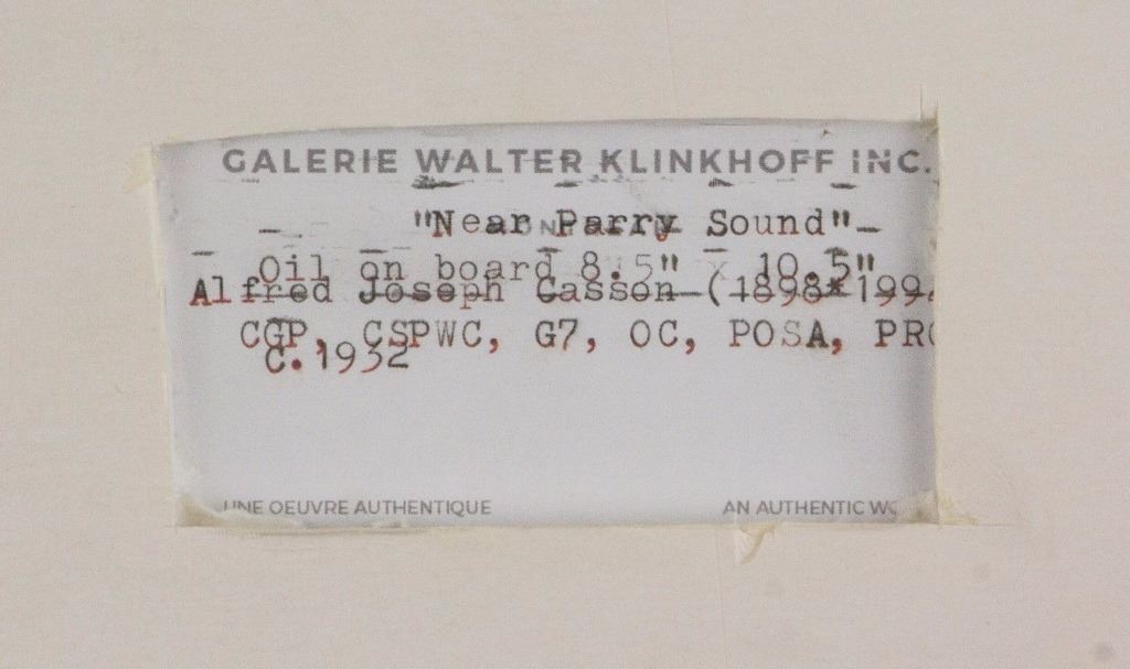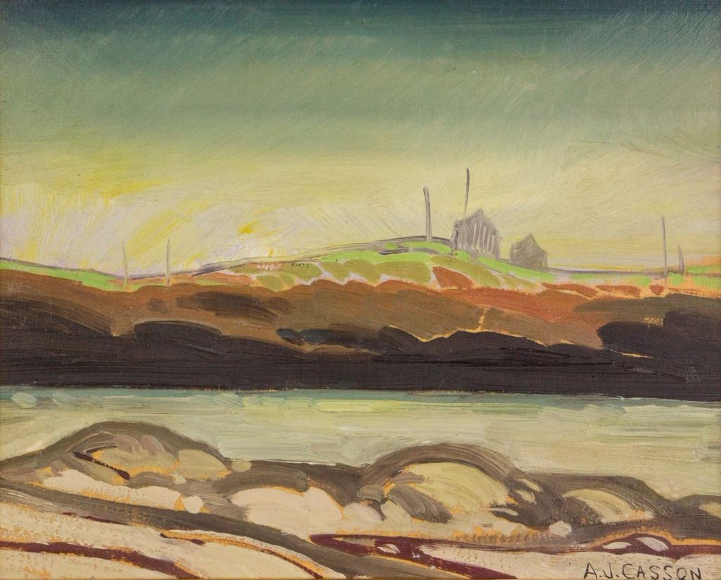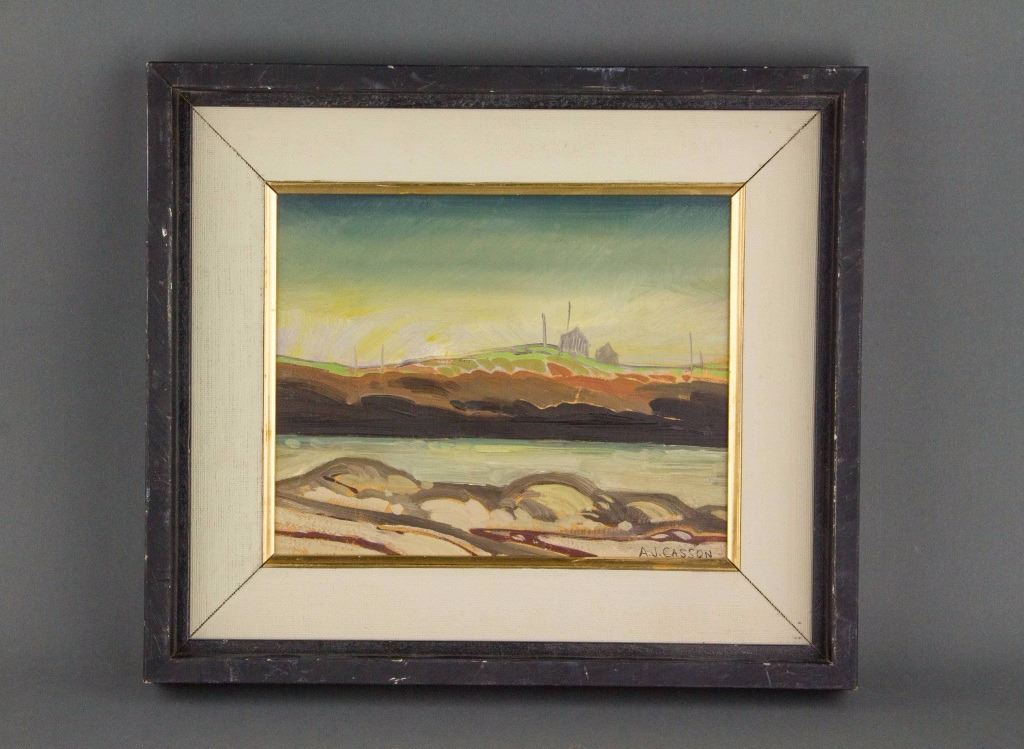 Near Parry Sound; oil on board; framed; signed and attributed to Alfred Joseph Casson (1898-1992), Canadian painter, member of the Group of Seven; dated 1932; 8.5 inches x 10.5 inches