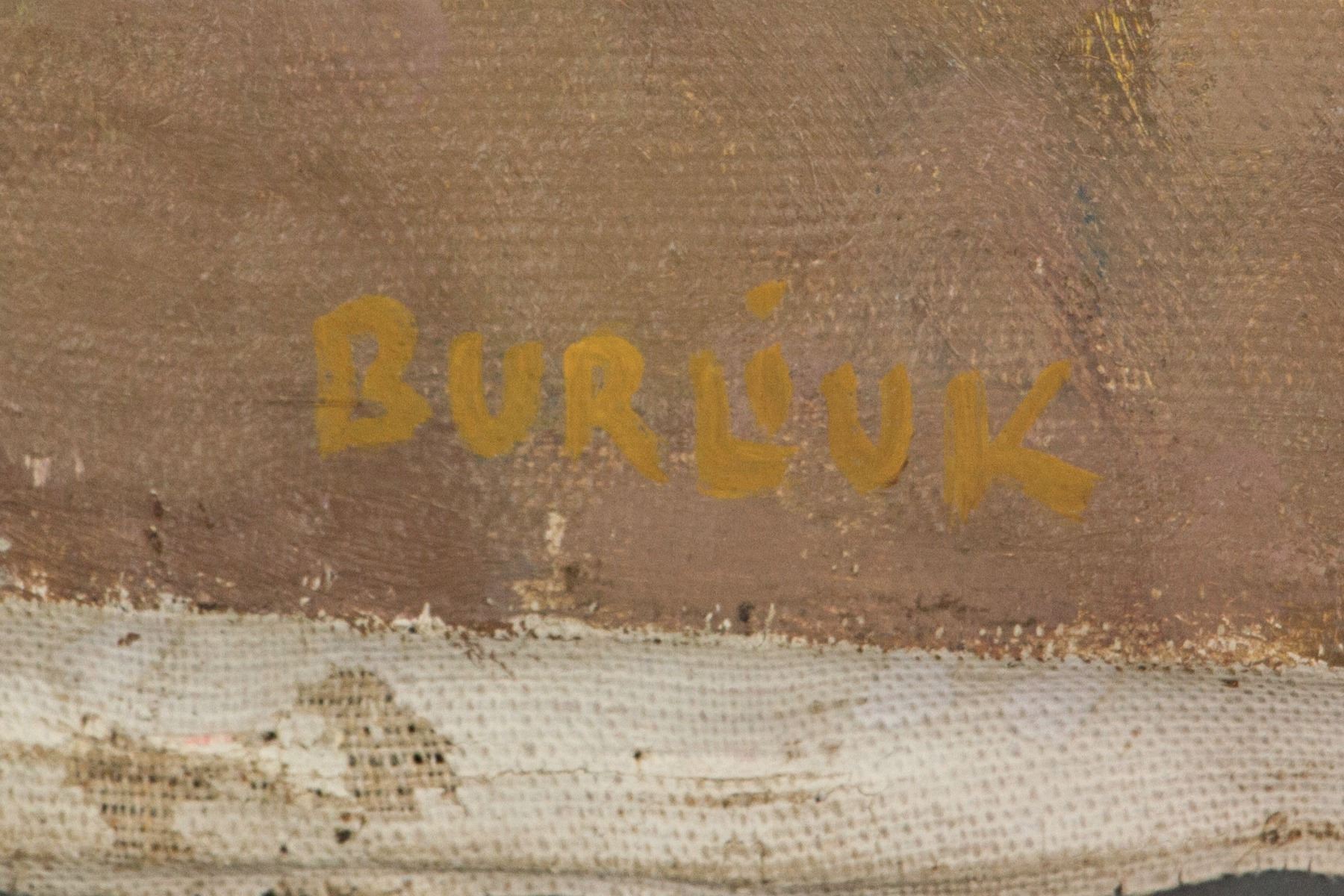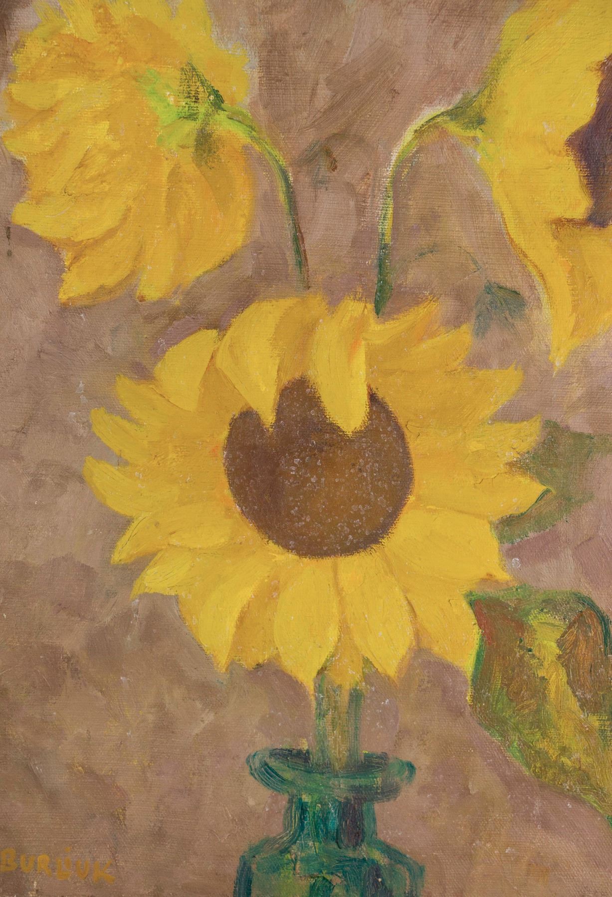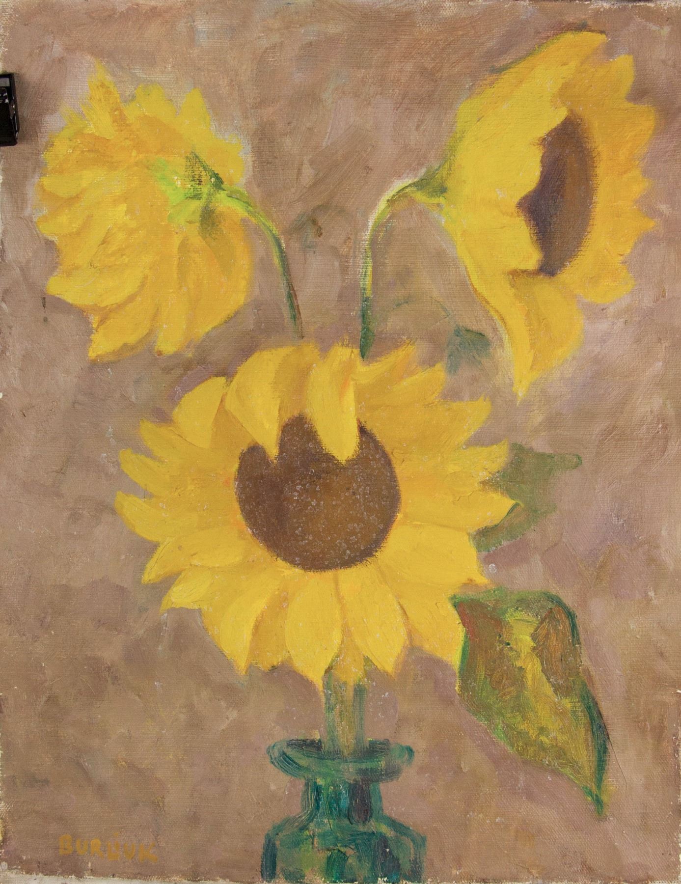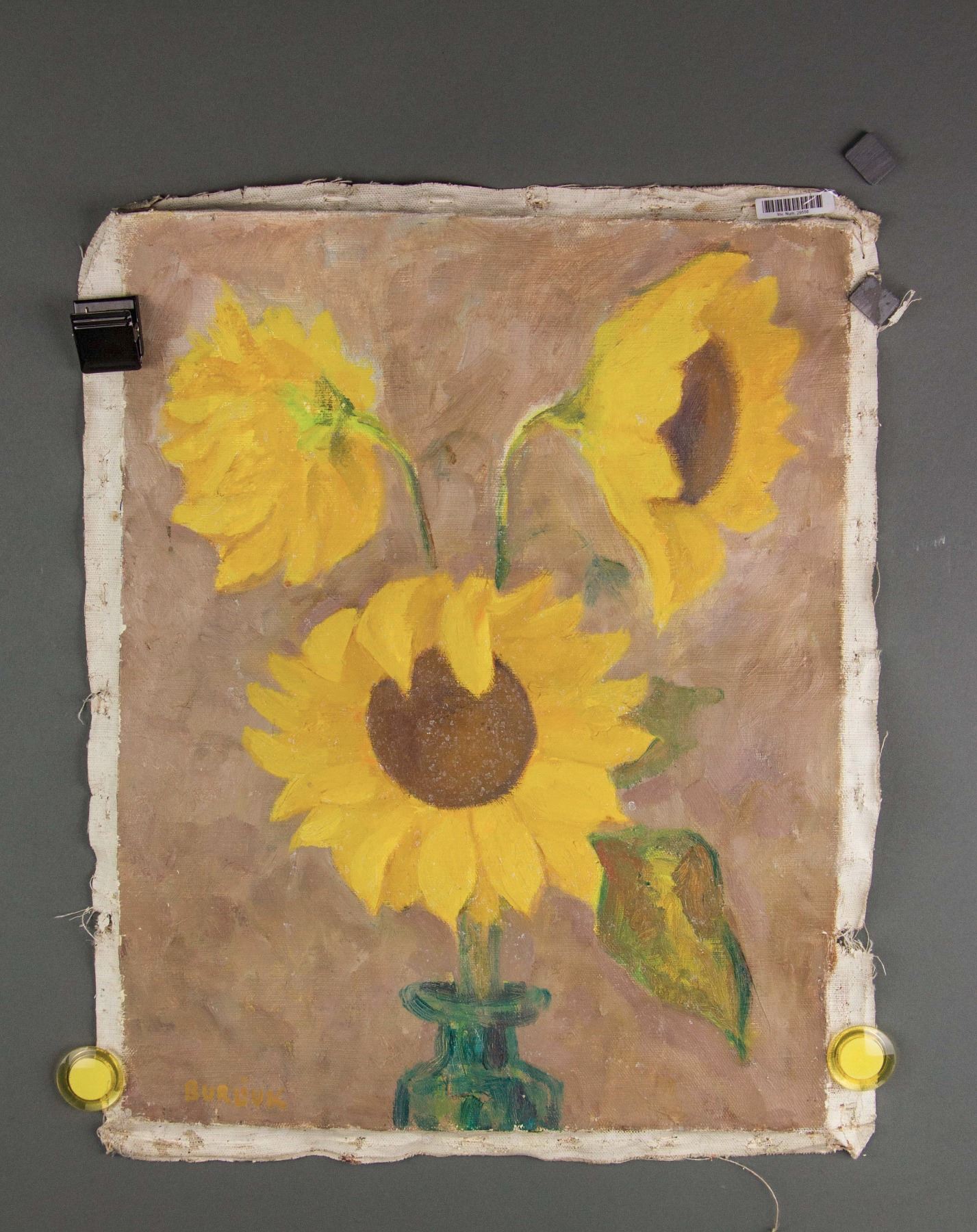 Three pieces of sunflowers in flowerpot; oil on canvas; signed left lower corner Attributed to Burliuk (1882-1967), Russian artist; 53 inch x 41 inch