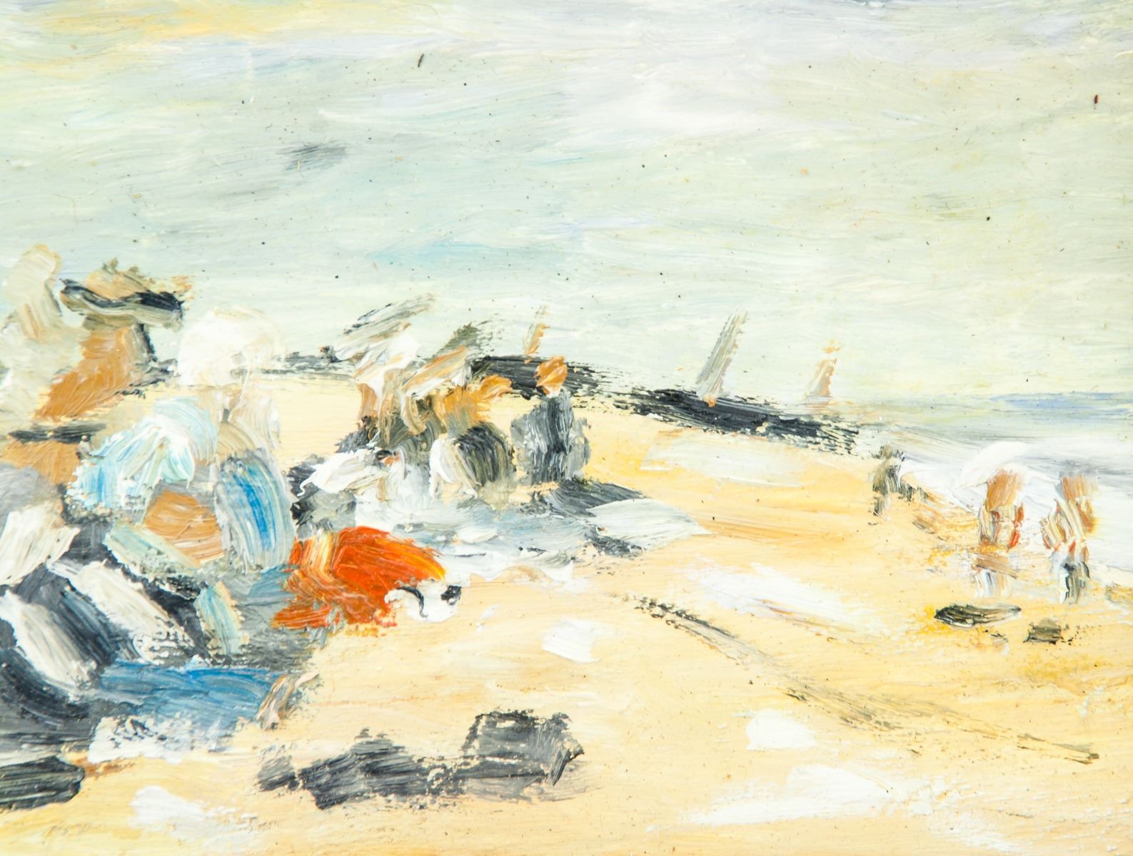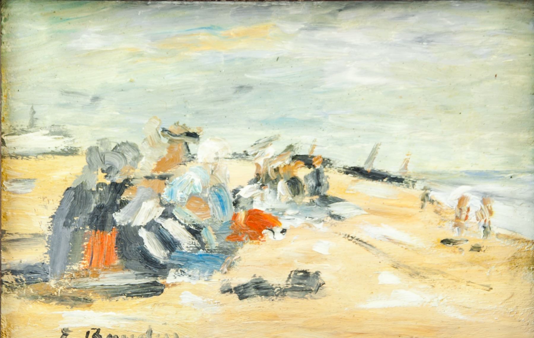 Oil on canvas, framed. Featuring a landscape scene. Signed and attributed to Eugene Boudin (French, 1824-1898) on the lower right corner. 14.5 x 21.5 cm (5.7 x 8.5 inches). Marked with label on verso. Eugene Boudin was a French painter best known for his sensitive and lively depictions of beach scenes and windswept harbors. He is considered one of the earliest plein-air painters, completed his canvases entirely in situ rather than from studies back in the studio. Boudin met and befriended the young Claude Monet, taking him on painting excursions and teaching him about color, and the two remained lifelong friends. Born on July 12, 1824 in Honfleur, France, his father was a harbor pilot and also a picture framer. It was at his father’s framing shop that young Boudin developed his interest in painting and met the artists Thomas Couture, Jean François Millet and Constant Troyon, who exhibited at his father’s shop. The poet and art critic Charles Baudelaire first drew the public’s attention to Boudin’s work after the Paris Salon of 1859. Today, his work can be found in the collections of the Art Institute of Chicago, the Hermitage Museum in St. Petersburg, the Musee d’Orsay in Paris, the National Gallery in London, the National Gallery of Art in Washington, D.C., and the Philadelphia Museum of Art, among others. He died on August 8, 1898 in Deauville, France.