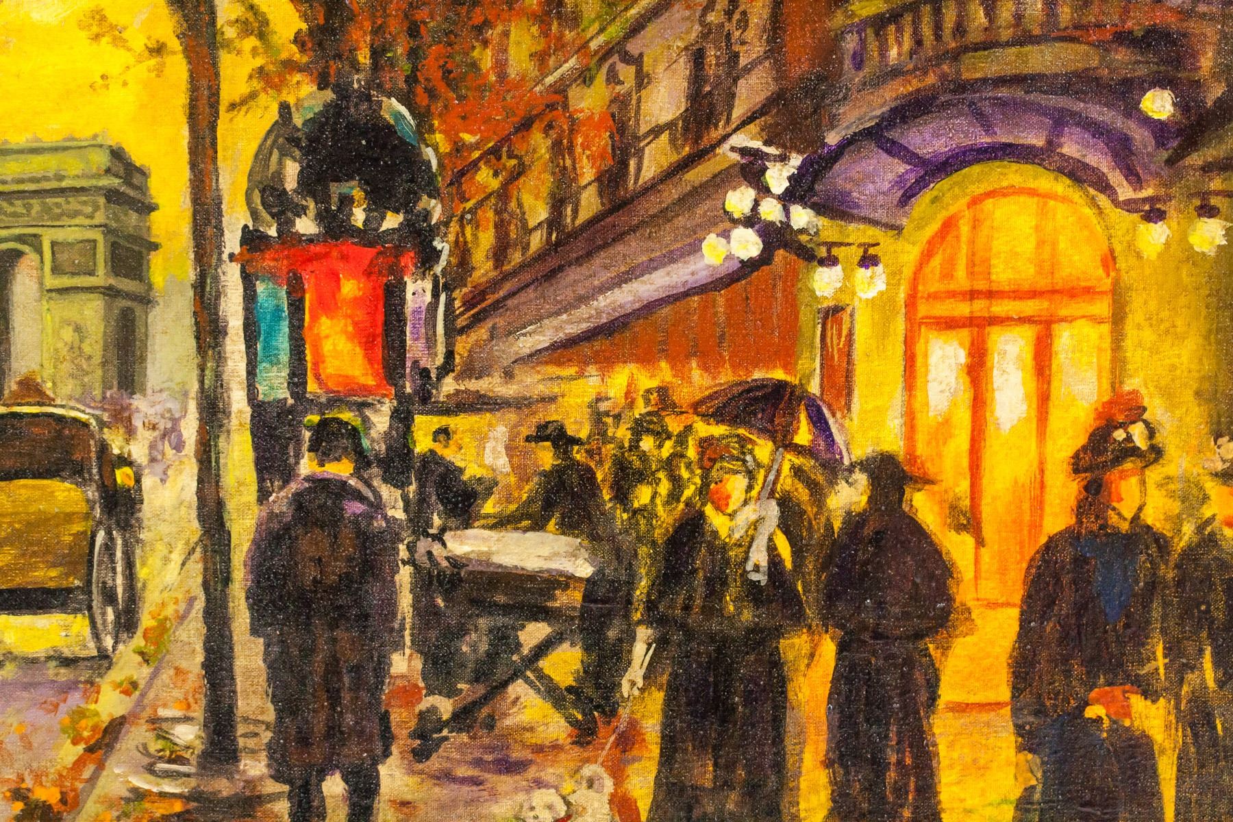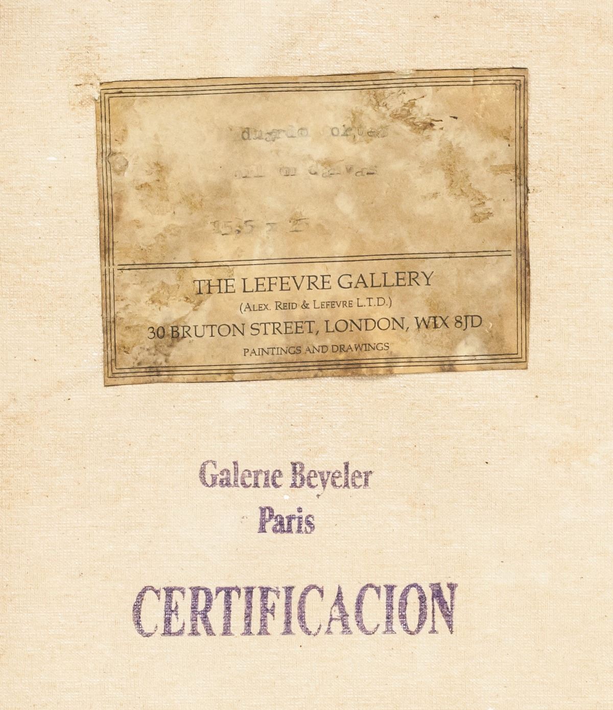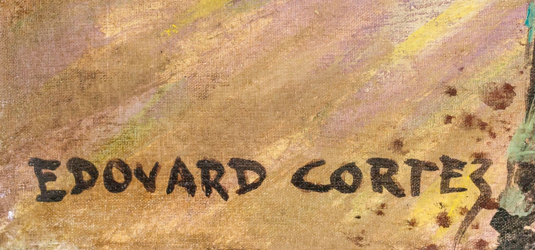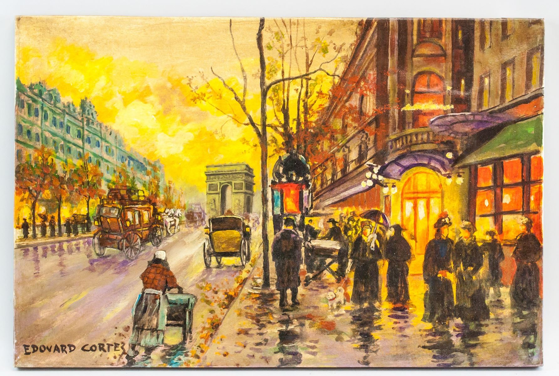 Oil on canvas. Featuring Parisian evening street scene. Signed "EDOUARD CORTES" in the bottom left corner. Label on verso reads "THE LEFEVRE GALLERY". Stamped on verso with "Galerie Beyeler Paris" and "CERTIFICACION". Attributed to Edouard Cortes (1882-1969, French). 39.5 x 60 cm (15.5 x 23.5 inch). 39.5 x 60 cm (15.5 x 23.5 inches). Provenance: This lot carries limited provenance from a Southern Ontario estate