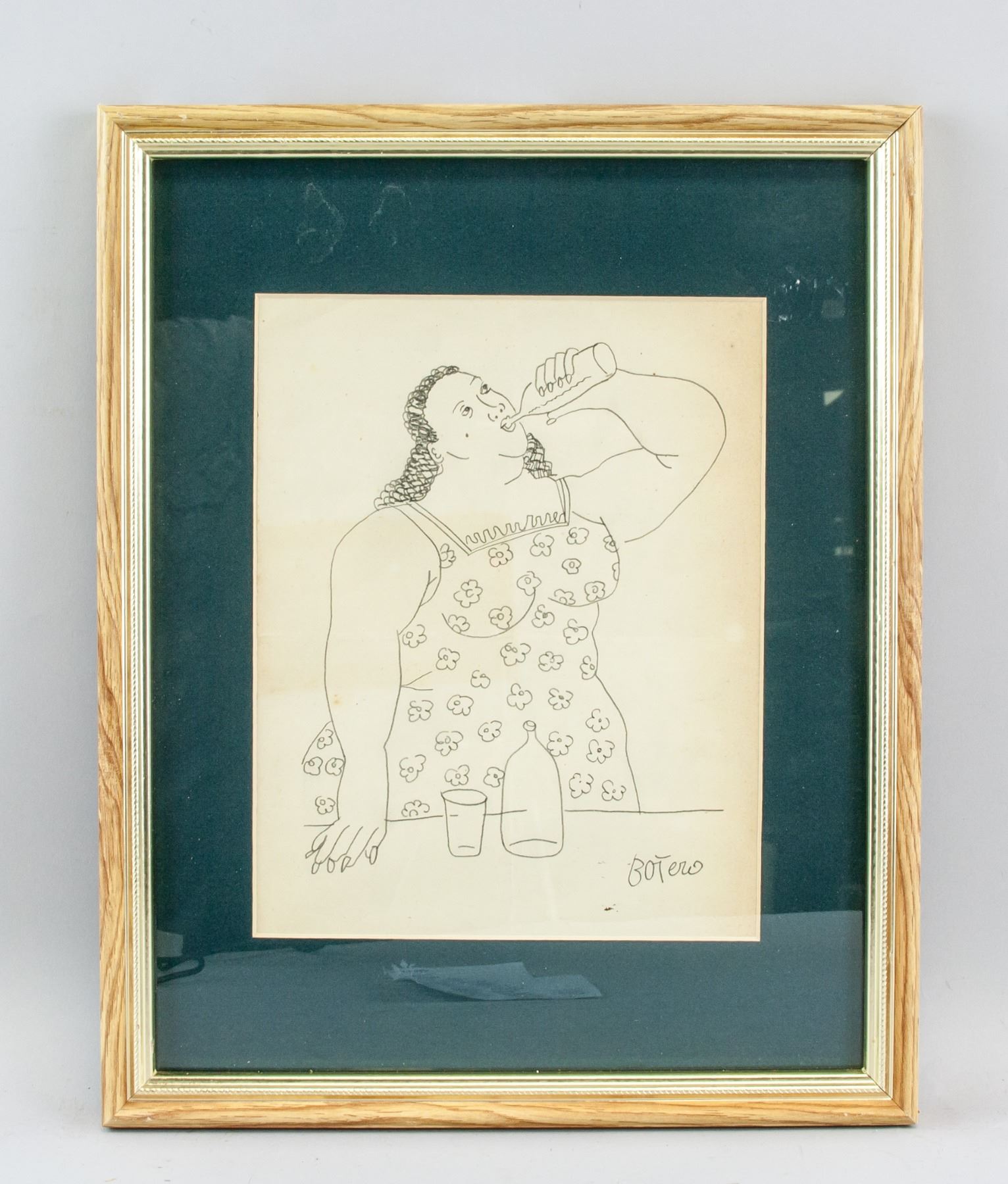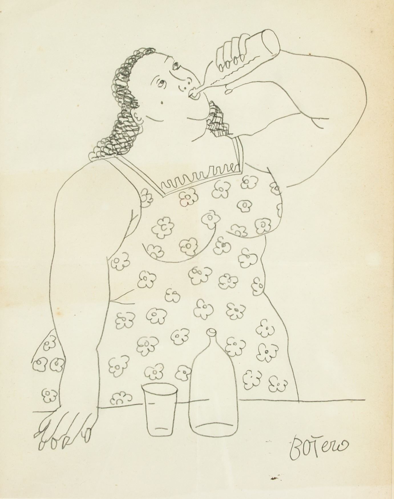 Graphite on paper. Study, rotund woman figure. Signed and attributed to Fernando Botero (Italian, b. 1932). 9.4 x 7.5 in. (24 x 19 cm). Drawing inspiration from a diverse array of influences, from Renaissance masters such as Giotto and Paolo Uccello to the 20th-century Abstract Expressionist movement, Fernando Botero’s signature style is characterized by the use of rotund figures and inflated forms. His 1961 work Mona Lisa, Age 12 exemplifies his use of the dynamic brushwork typical of Abstract Expressionism, although used to depict the figure rather than for pure abstraction. In addition to employing techniques from major movements, Botero’s paintings frequently emulate the subject matter and compositions of past masters, his bulbous renderings of these familiar images often interpreted as gestures of irony or caricature. The rounded appearance of Botero’s painted figures is mirrored in his sculptural work, usually fabricated in bronze at a large scale and often displayed in public. PROVENANCE: Southern Ontario estate