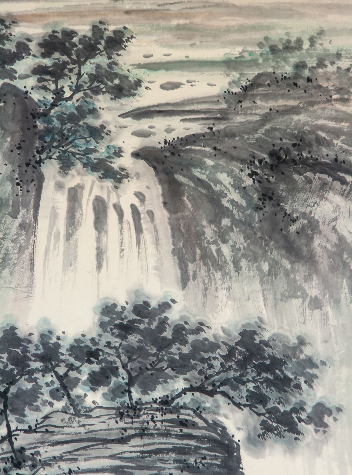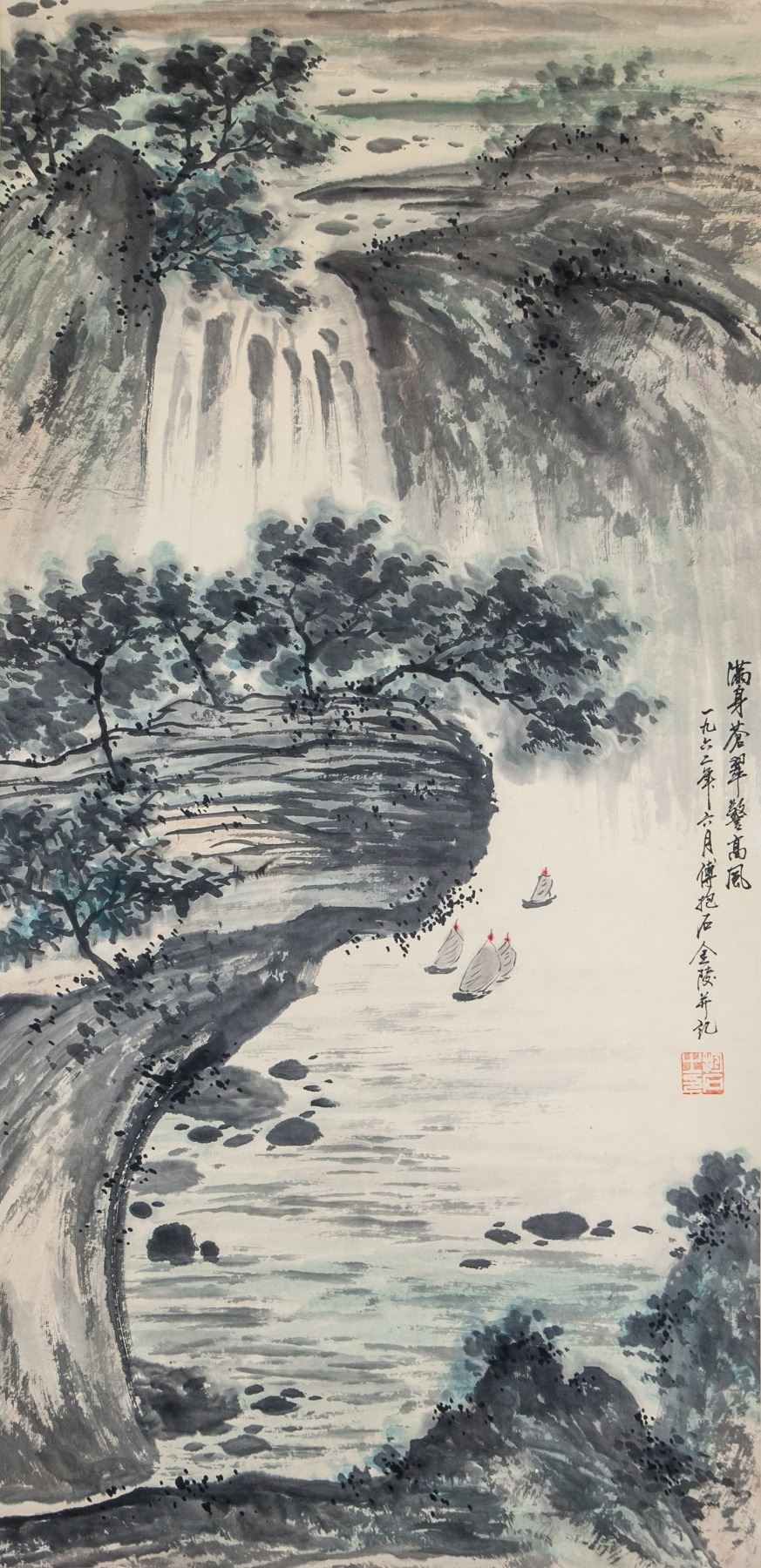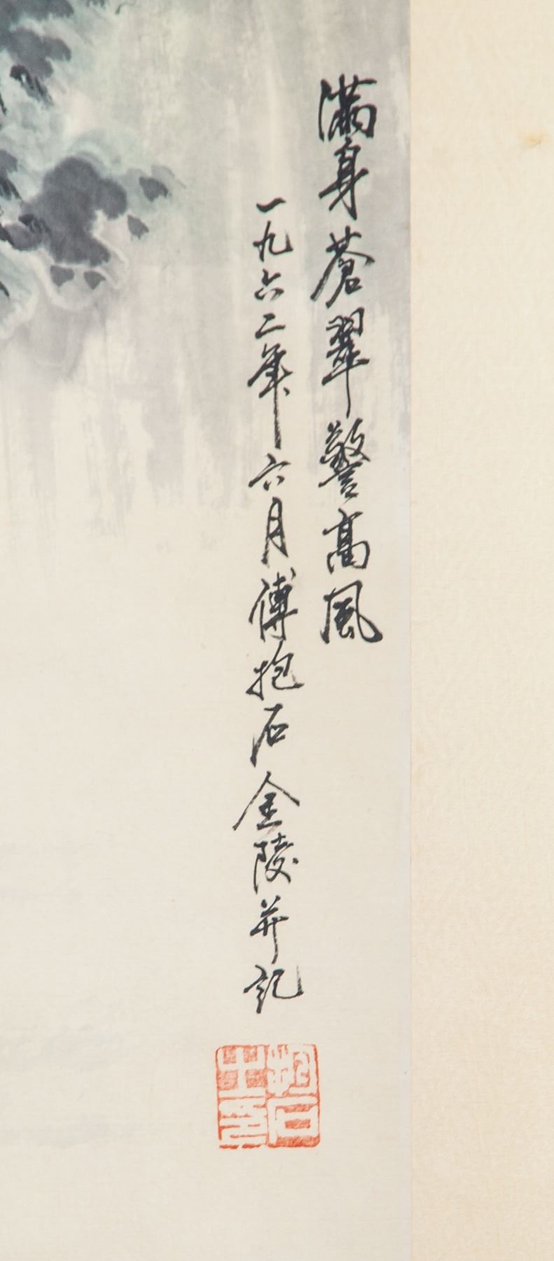 Watercolor and ink on paper, featuring mountainous landscape, signed and attributed to Fu Baoshi (Chinese, 1904-1965), inscribed with 1 artist seal, 96 x 47.5 cm, Fu Baoshi was a Chinese painter known for both his depictions of landscapes and figures. In his devotion towards painting landscapes, Fu expressed himself with distinctive brushstrokes and splattered marks. During his career, Fu’s subject matter changed from traditionally dressed figures in misty forests to power lines and airports. Today, Fu’s works are held in the collections of the Metropolitan Museum of Art in New York, the Long Museum in Shanghai, and the Cleveland Museum of Art, among others.