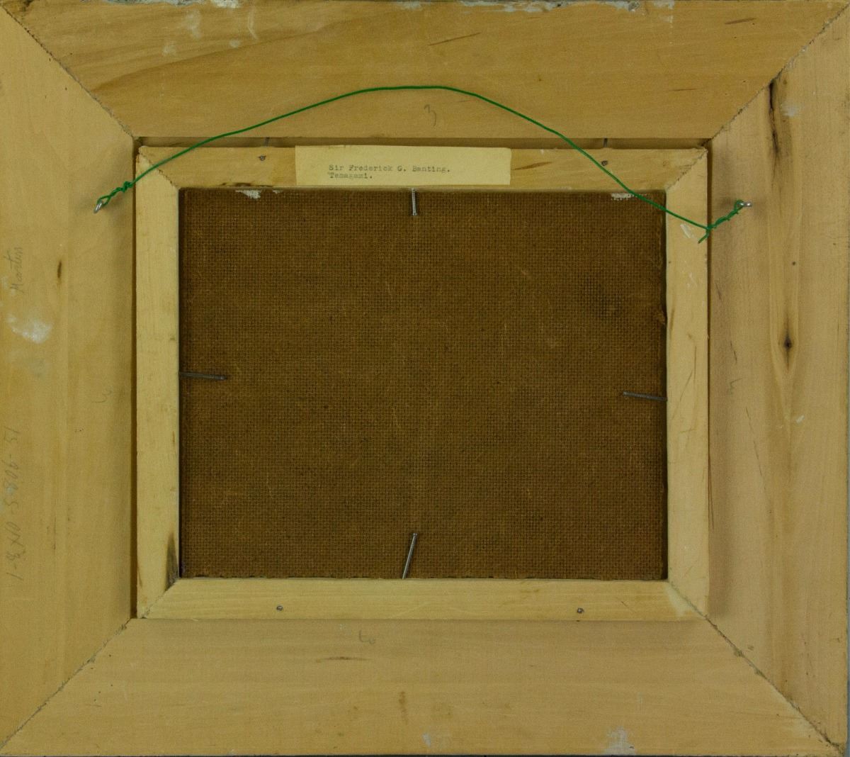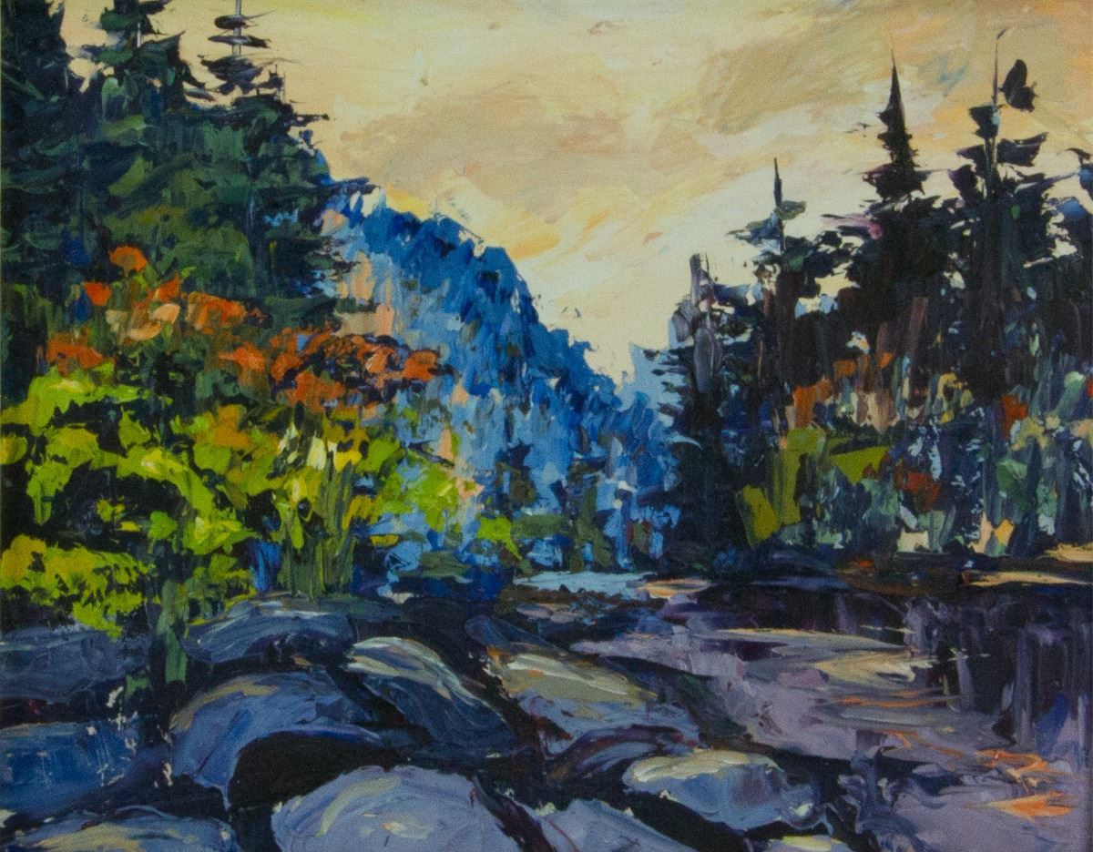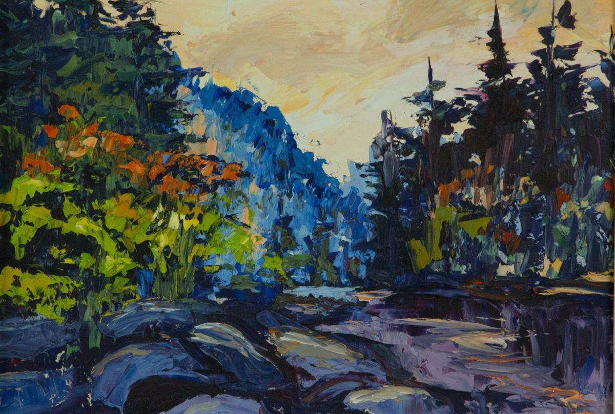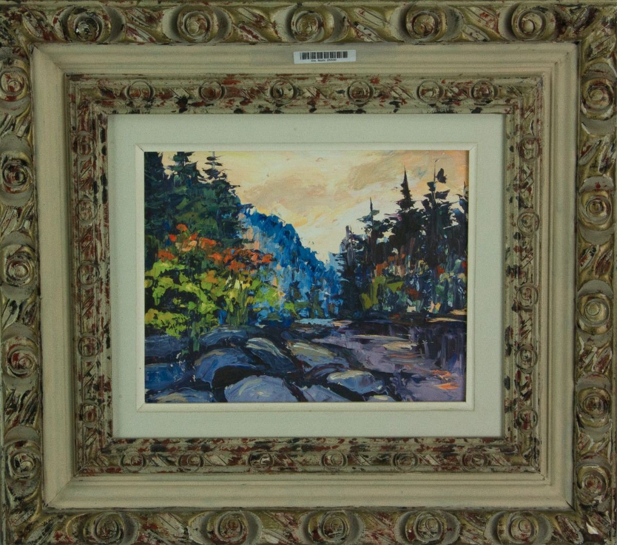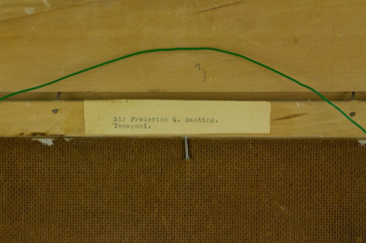 Temagami; oil on panel; framed; artist name and painting title sticker on back; 23 cm × 28 cm