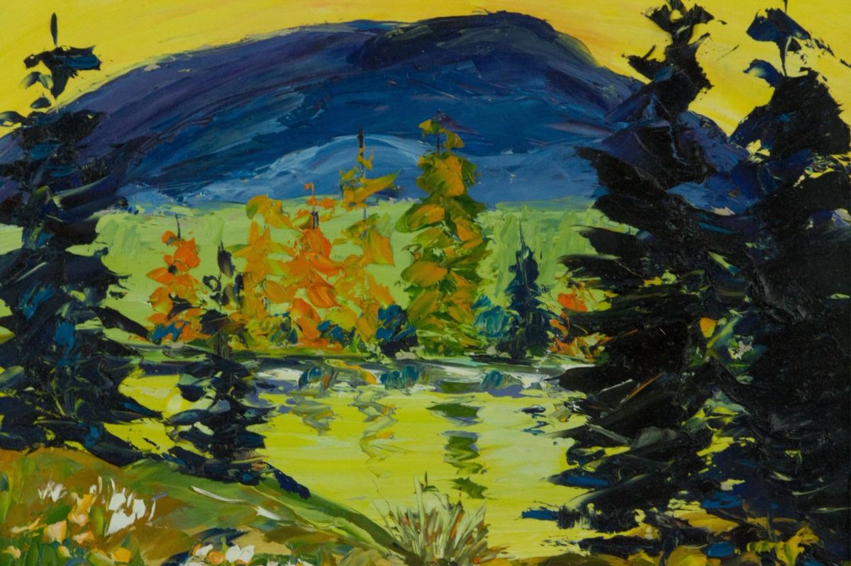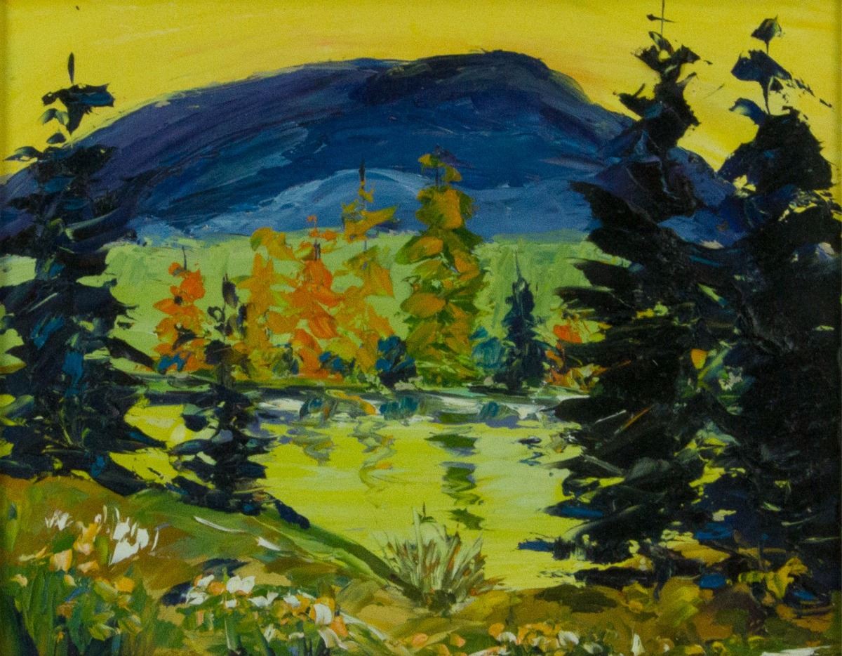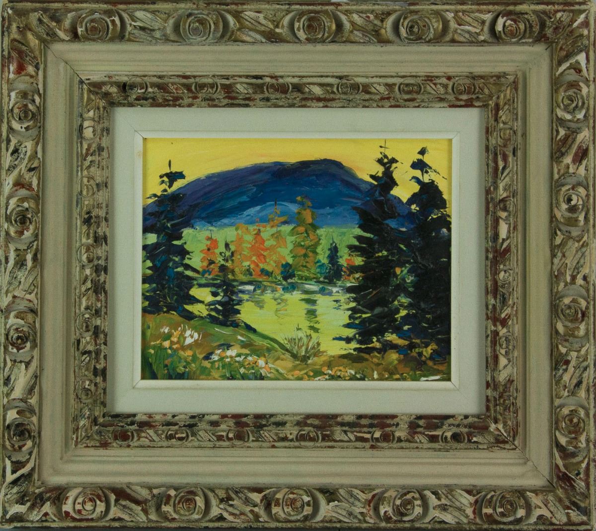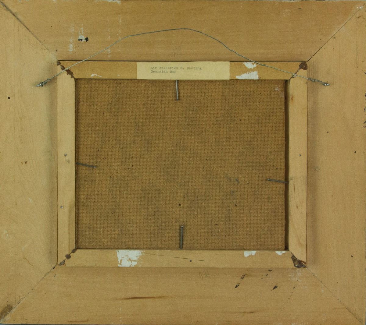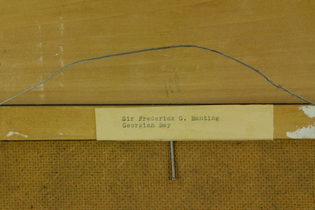 Georgian Bay; oil on panel; framed; artist name and painting title sticker on back; 23 cm × 28 cm