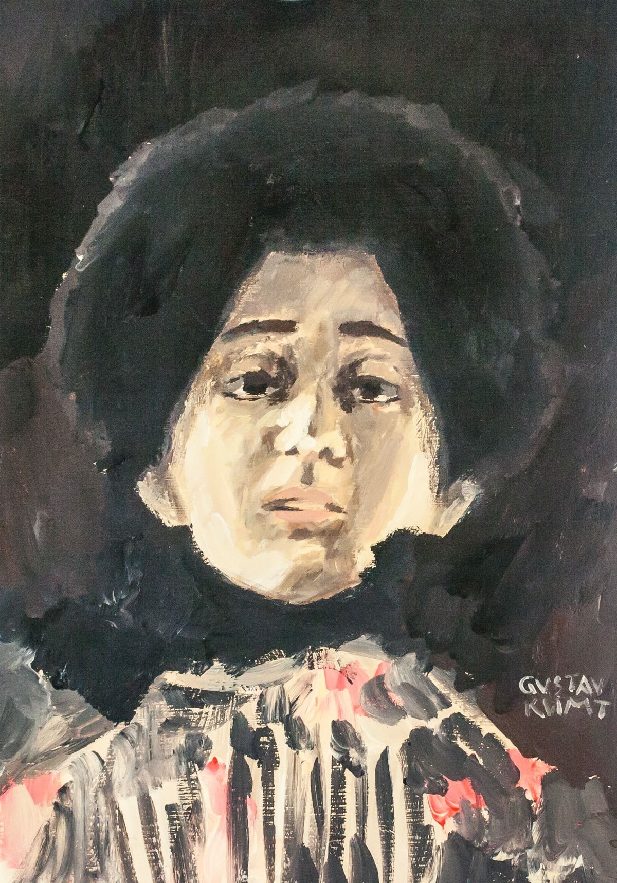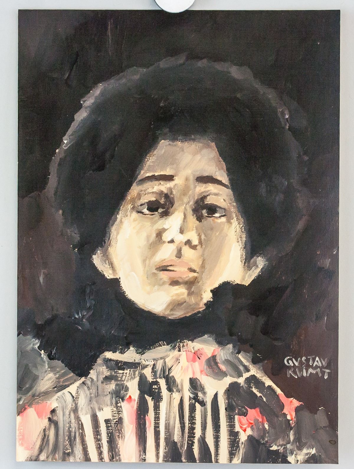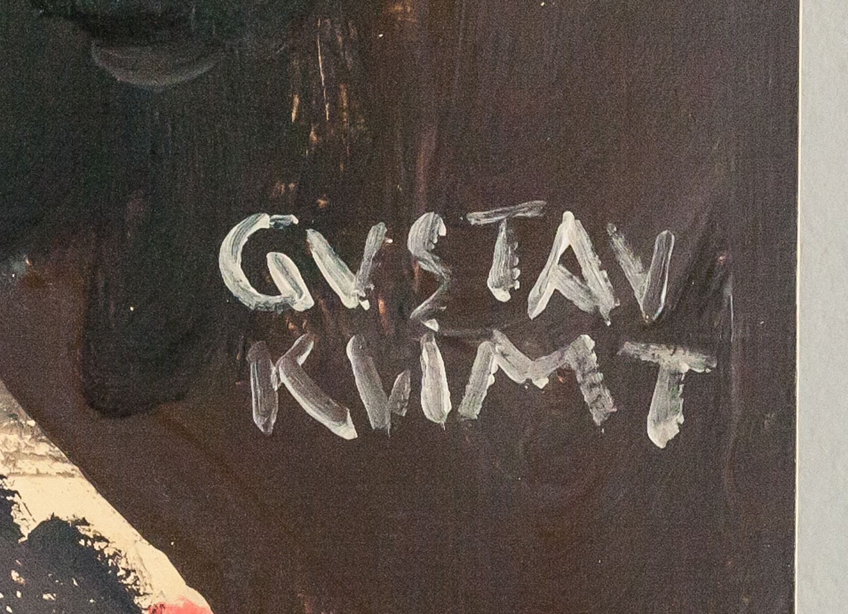 Oil and gouache on paper. Featuring portrait of a woman against a dark background. Signed "Gustav Klimt" near her right shoulder. "GG12" inscribed on verso. Stamped with "KUNSTHANDYL H&S" on verso. Attributed to Gustav Klimt (1862-1918, Austrian). 25.5 x 18 cm (10.25 x 7 in). Provenance: This lot carries limited provenance from a Southern Ontario estate