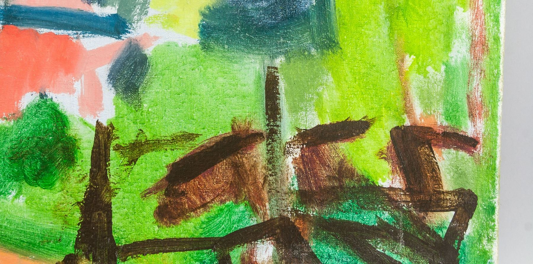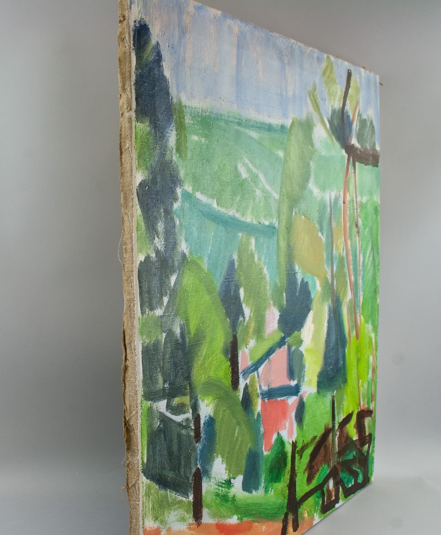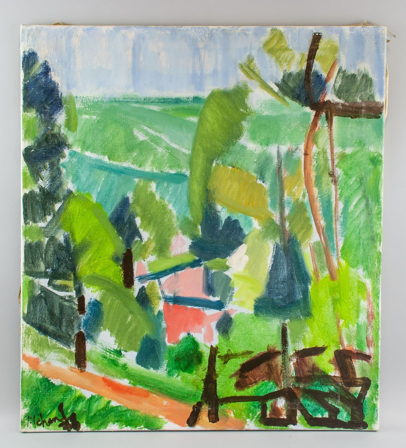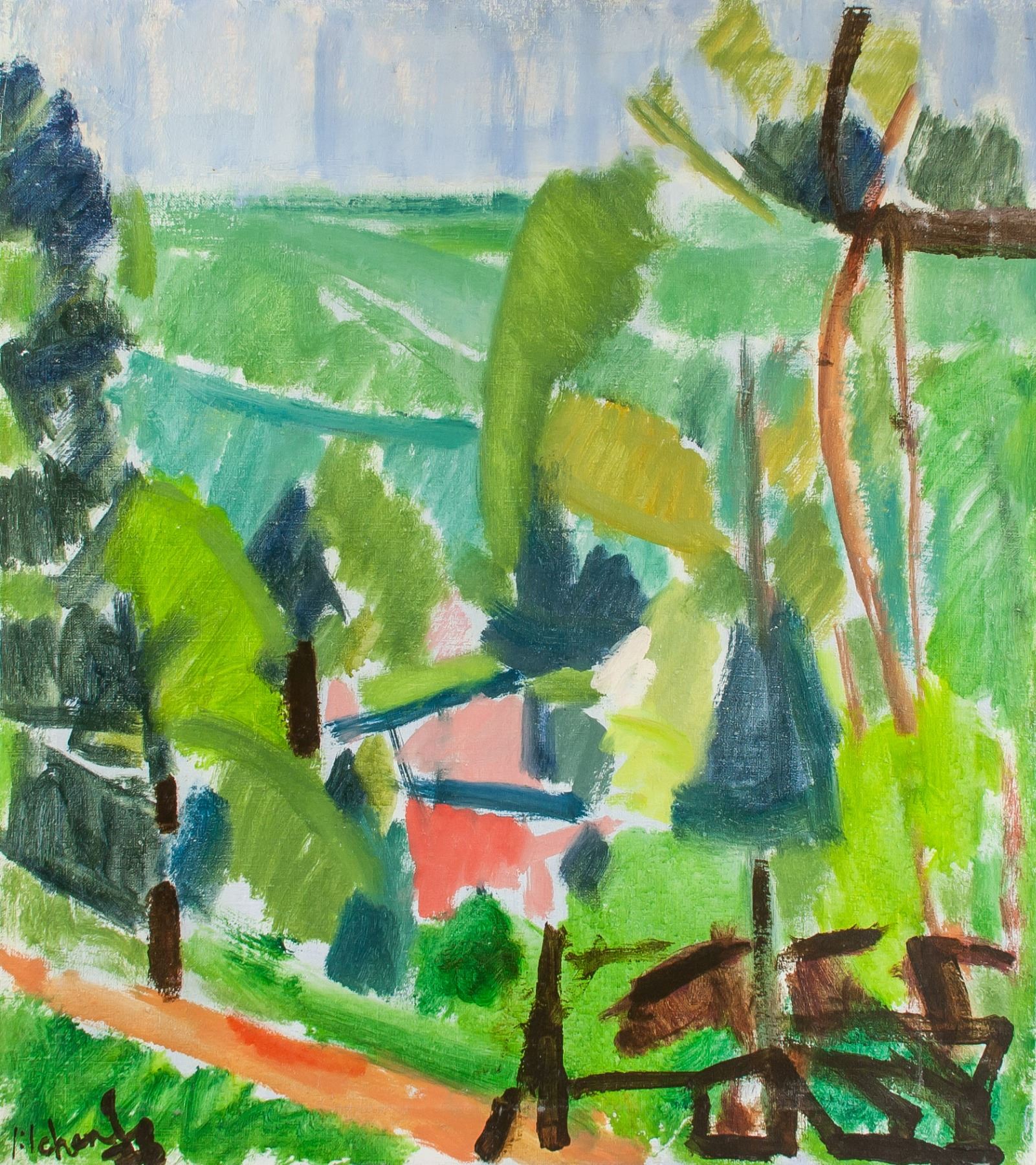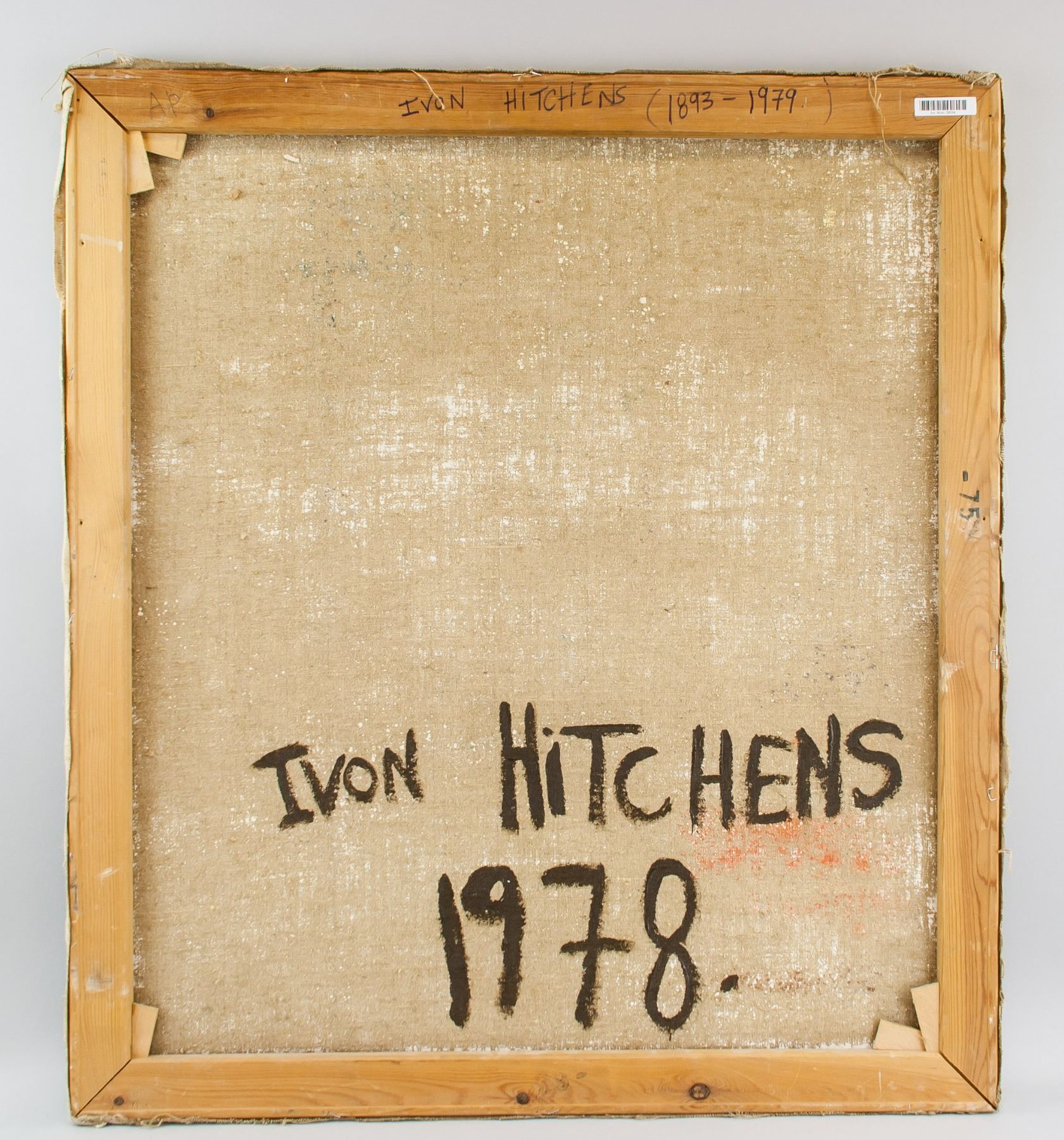 Oil on canvas abstract landscape. Signed and attributed to Ivon Hitchens (British, 1893-1979). Signature lower left corner. Dated 1978 on verso. Measures 29.5 x 26.3 in. (75 x 67 cm). Hitchens was an English painter who started exhibiting during the 1920s. He became part of the 'London Group' of artists and exhibited with them during the 1930s. His house was bombed in 1940 during World War II, at which point he moved to a caravan on a patch of woodland near Petworth in West Sussex. He worked there for the next forty years, gradually augmenting his caravan with a series of buildings. He is particularly well known for panoramic landscape paintings created from blocks of colour. There is a huge mural by him in the main hall of Cecil Sharp House. His work was exhibited in the British Pavilion at the Venice Biennale in 1956. PROVENANCE: Private Collection (Manchester, UK)
