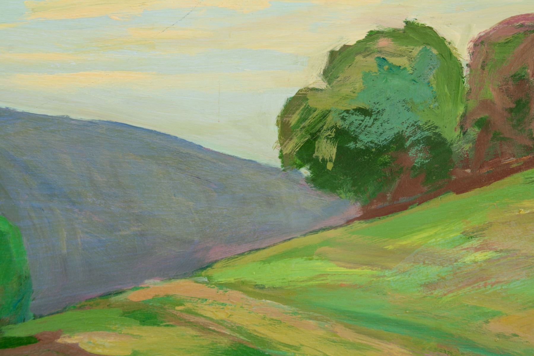Oil on board. Featuring a landscape scene. Signed and attributed to Juan Guzman-Maldonado (Born in Chile, moved to America, b. 1948), on the lower right corner. Signature and title on verso "Los Osos", signed "J. Guzman". Born in Chile in 1948, he moved to California in 1972. Previously influenced by Fauvism and Expressionism in his object and non-objective painting, Guzman-Maldonado began painting the California landscape, en plein air, very early in the morning or right before sunset. He cites Charles Reiffel, Maurice Braun and Charles Fries as influences. He began painting with his fingers and realized that objects performed better than the paint brush. His palette became heavy and colors abstracted from the sun were moved onto masonite board, creating timeless imagery.