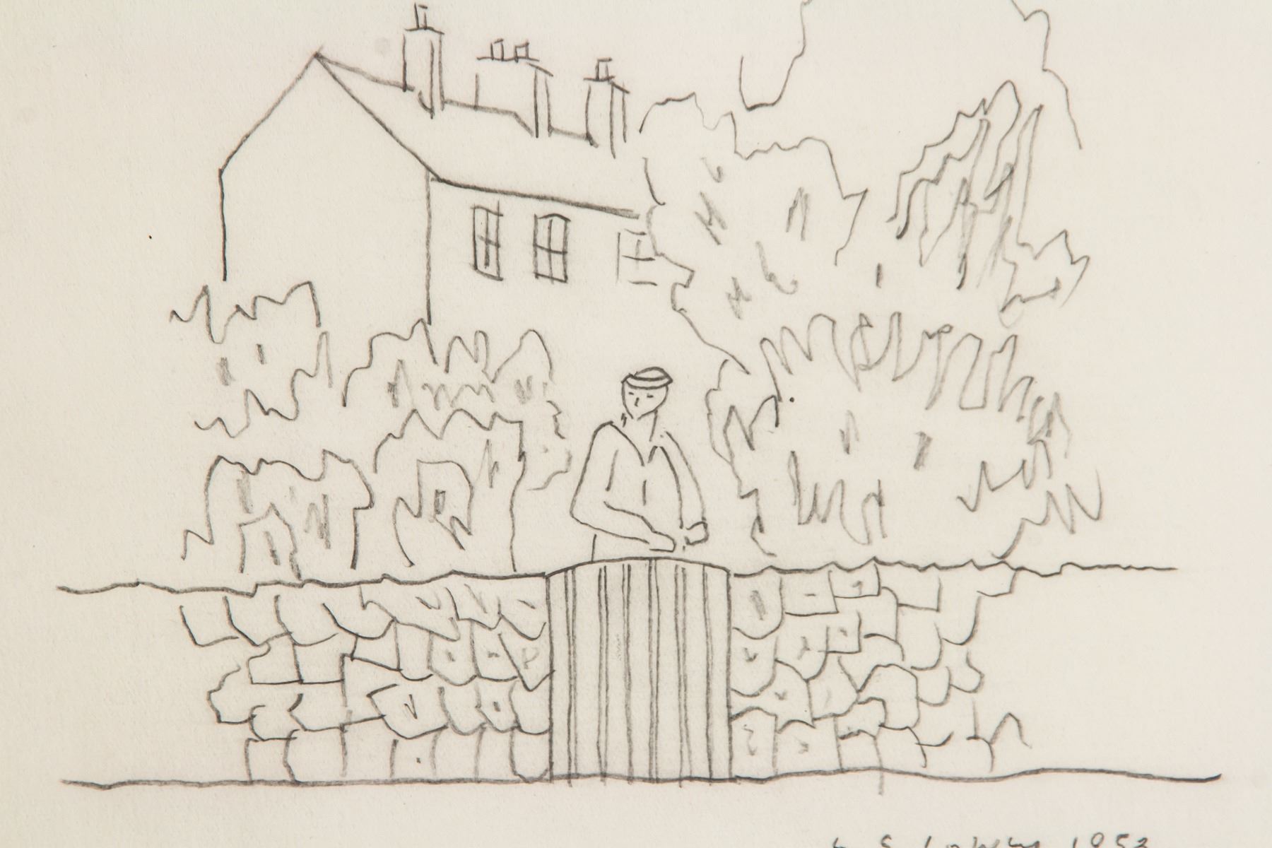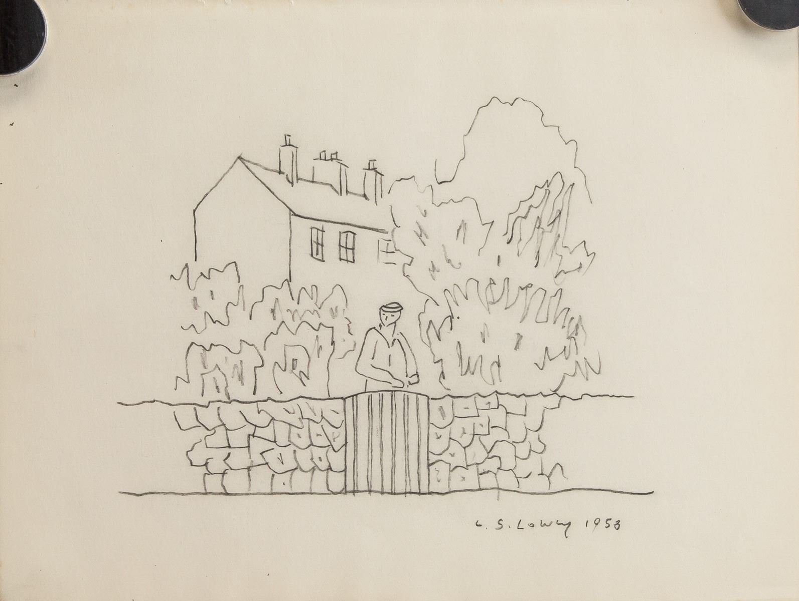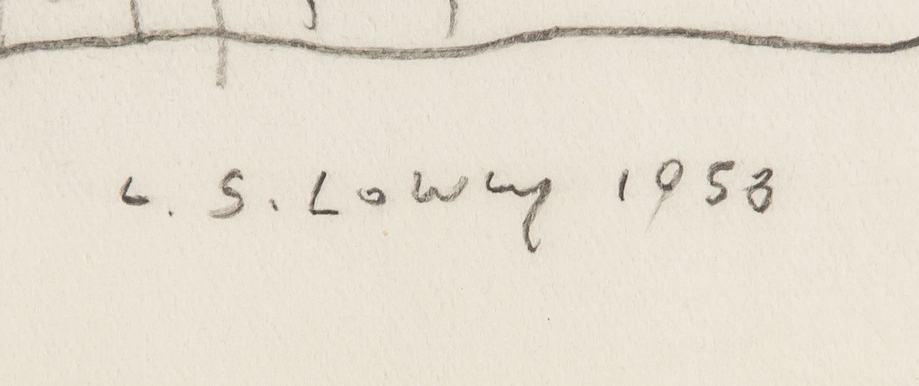 Graphite on paper. Featuring a countryhouse with a post officer. Signed and attributed to L. S. Lowry (British, 1887-1976) on the lower right corner and dated 1958. 17 x 22.5 cm (6.7 x 8.9 inches). Laurence Stephen Lowry was a British painter best known for his idiosyncratic depictions of the industrial yards around Manchester. In his mature works, he balanced the frenetic movement of factory workers rendered as matchstick-like strokes against the backdrop of imposing industrial smoke stacks. Though Lowry was trained in academic drawing, much like Henri Rousseau he instead chose to develop his own method of a unique “naïve” style. Born on November 1, 1887 in Stretford, England, he went on to study under the French Impressionist Adolphe Valette at the Manchester School of Art before attending the Royal Technical College in Salford under Edward John Bernard Taylor. Taylor advised Lowry to make his figures and buildings more prominent, and so he began setting them against a white ground, using only four other colors: vermillion, Prussian blue, ivory black, and yellow ochre. It wasn’t until the 1940s that Lowry found success, going on to be appointed the Official Artist of the Coronation of Queen Elizabeth II in 1953. He had as lasting influence on a younger generation of British painters like James Lawrence Isherwood, and his works are in the collections of the National Gallery of Modern Art in Edinburgh, the Manchester City Art Gallery, and the Tate Gallery in London, among others. He died on February 23, 1976 in Glossop, England. PROVENANCE: Upper New York estate