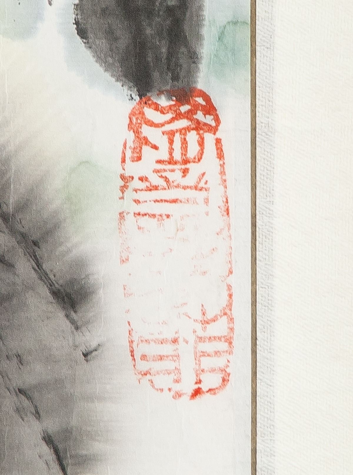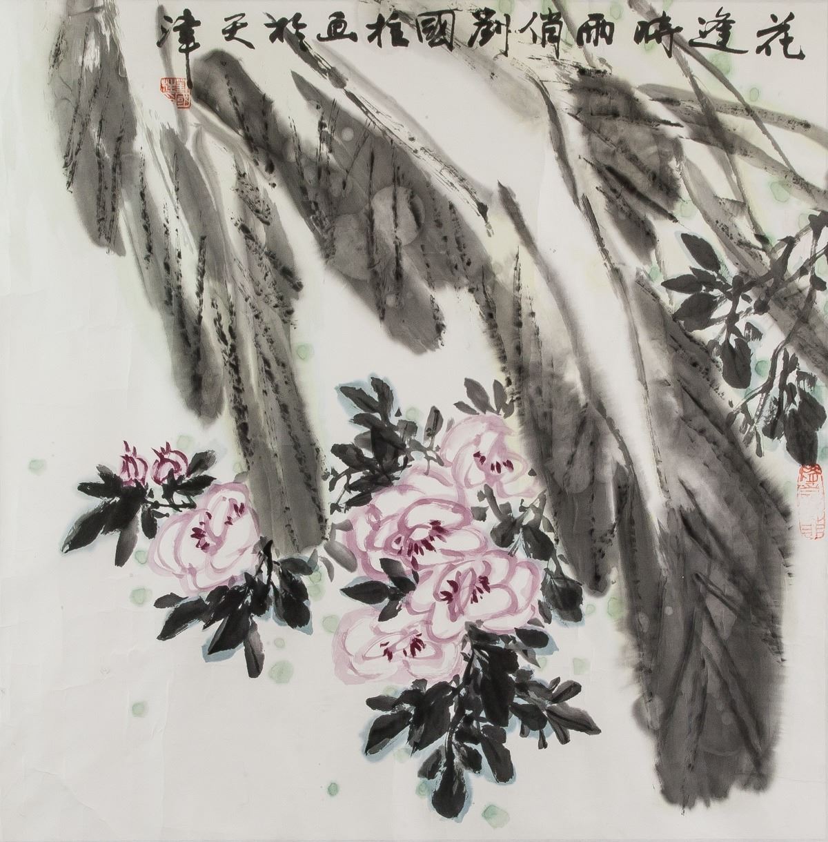 Watercolor and ink on paper roll, featuring flowers and basjoo tree, signed and attributed to Liu Guozhu (Chinese, b.1960), inscribed with 1 artist seal, 69 x 68 cm
