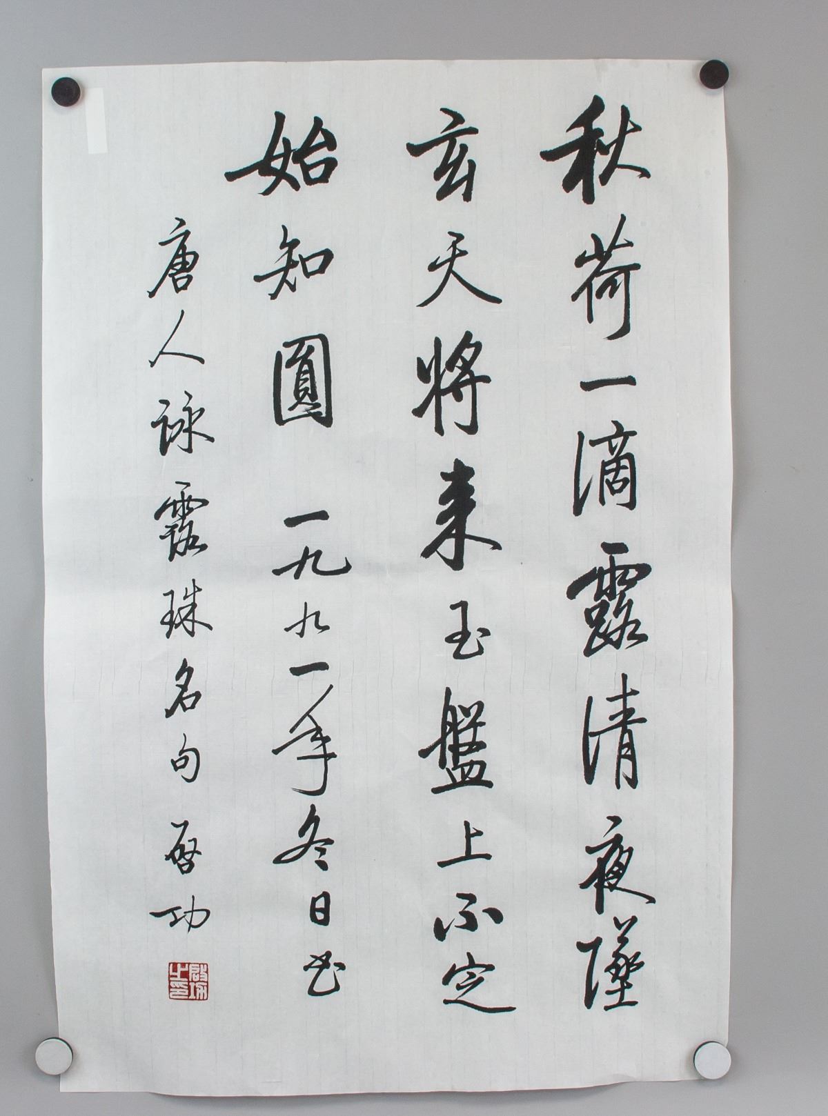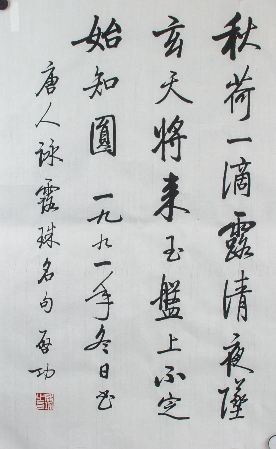 Ink on paper, featuring Chinese calligraphy in semi-cursive script, signed and attributed to Qi Gong (Chinese, 1912-2005), inscribed with 1 artist seals, dated 1991, 68 x 46 cm, Qi Gong was a Chinese calligrapher and painter known for his traditional landscapes and depictions of flowers and bamboo. Today, his work is included in the collection of the Metropolitan Museum of Art in New York.