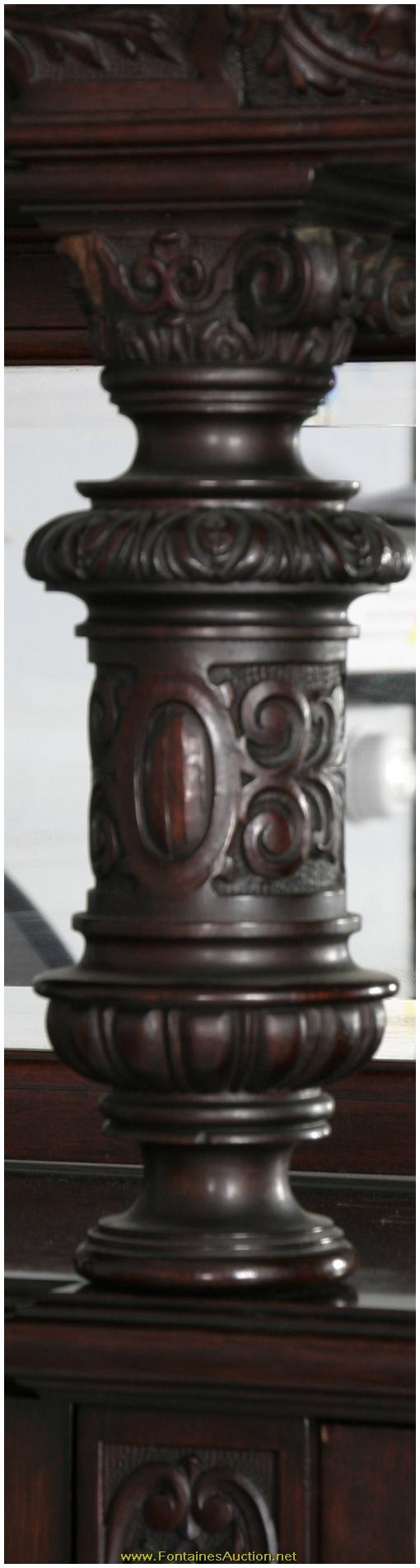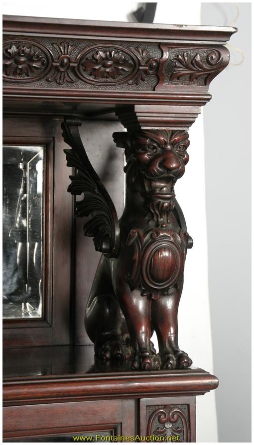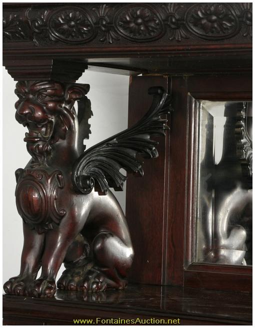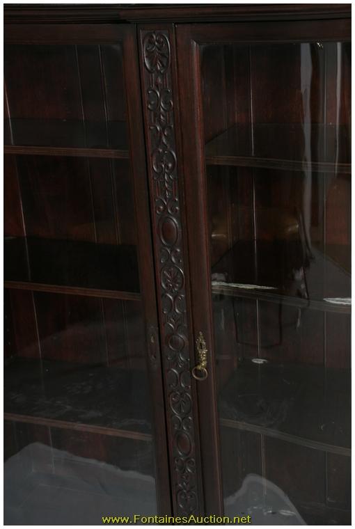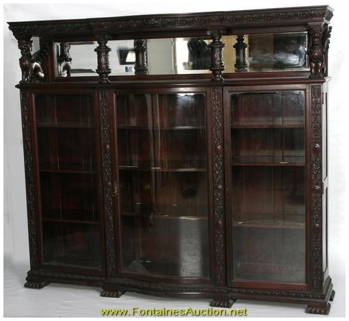 Attr. R.J. Horner Winged Griffin 3 Door Bookcase. 3 Door carved mahogany bookcase with a serpentine front center door, and 4 carved pilasters over square carved feet. The top has figural winged griffins centered with turned columns on the top supporting the top frieze and beveled mirror back. Nice original finish. 79"W x 55"H x 16"D. Estimated Value$8,000 - 12,000.