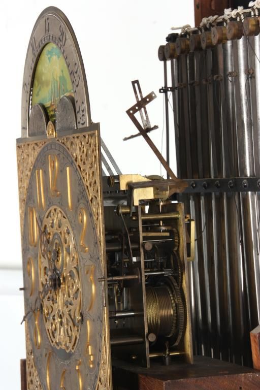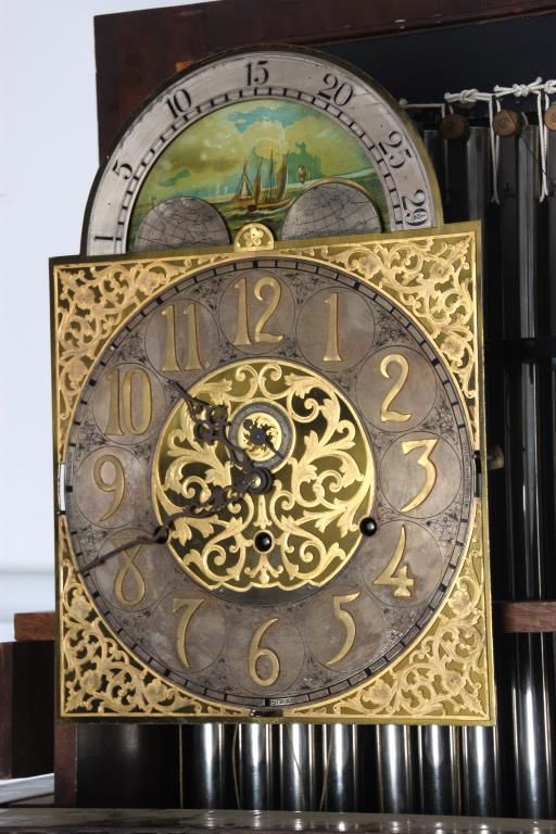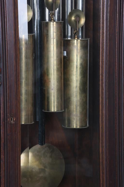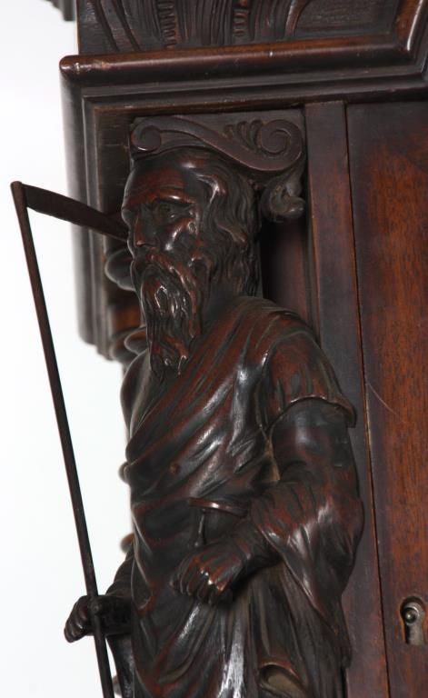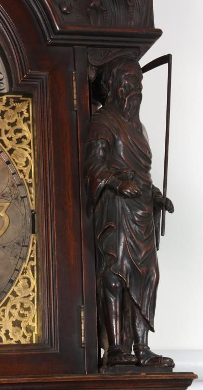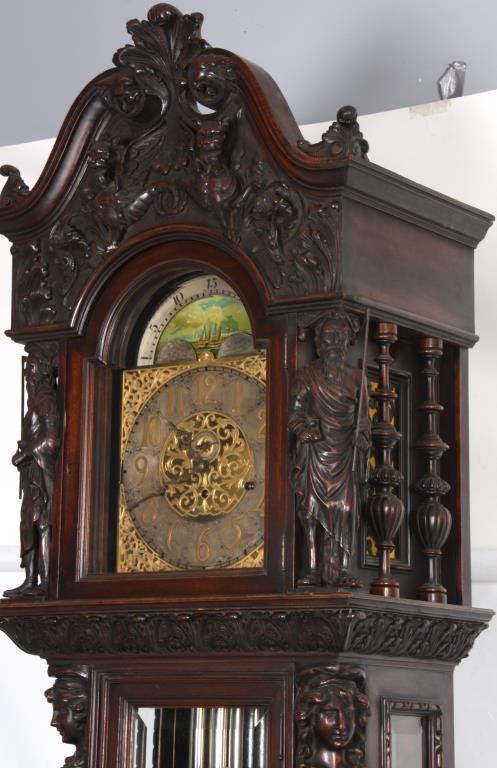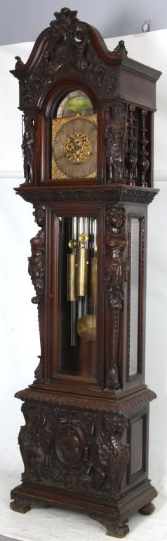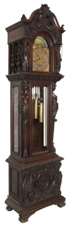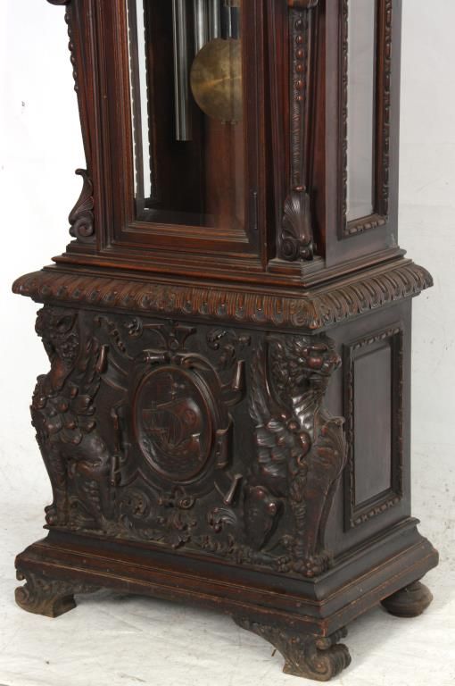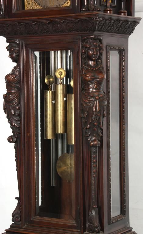 Attr: RJ Horner Figural Carved Mahogany 9 Tube Grandfather Clock. Brass dial has a 12 in. silvered chapter ring with engraved decoration, applied gilt brass hour numbers, gilt pierced brass filigree center and corner spandrels, sub seconds dial, moon phase with silvered arch and scenic painted moon phase disc; levers for Silent/Hour Strike, Silent/Strike & Westminster/Trinity/Whittington. Quality brass weight driven 8 day movement with the trademark for Bawo and Dotter of New York City; has a recoil escapement, maintaining power, quality brass weights and pulleys. In a carved mahogany case with arched crest, filigree carved with 2 winged griffins, turned side columns and full standing figures of Chronos “Father Time”; the body has large figural maidens busts on the corners with beveled glasses on the door and sides, the base has full standing winged griffins on the corners with filigree and a center carved medallion with a scene of a sailing ship, stands on scrolled feet. In good original condition and original finish. 107 in. high x 28 in. wide x 18 in. deep.