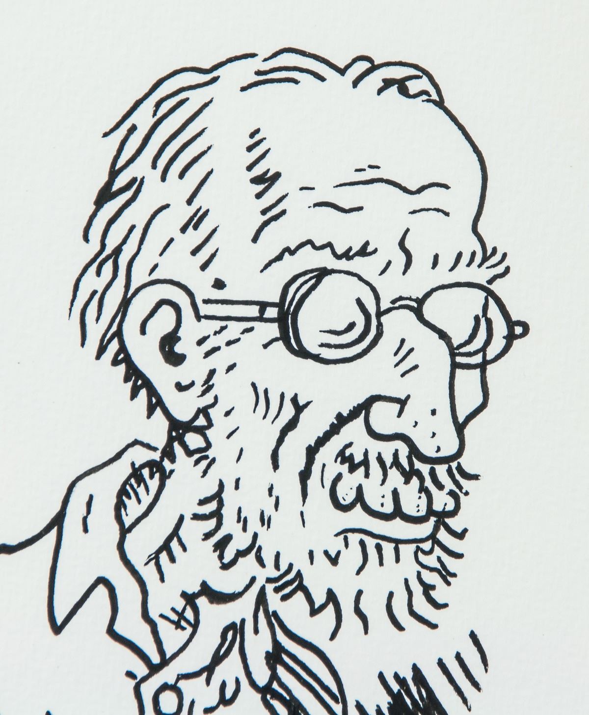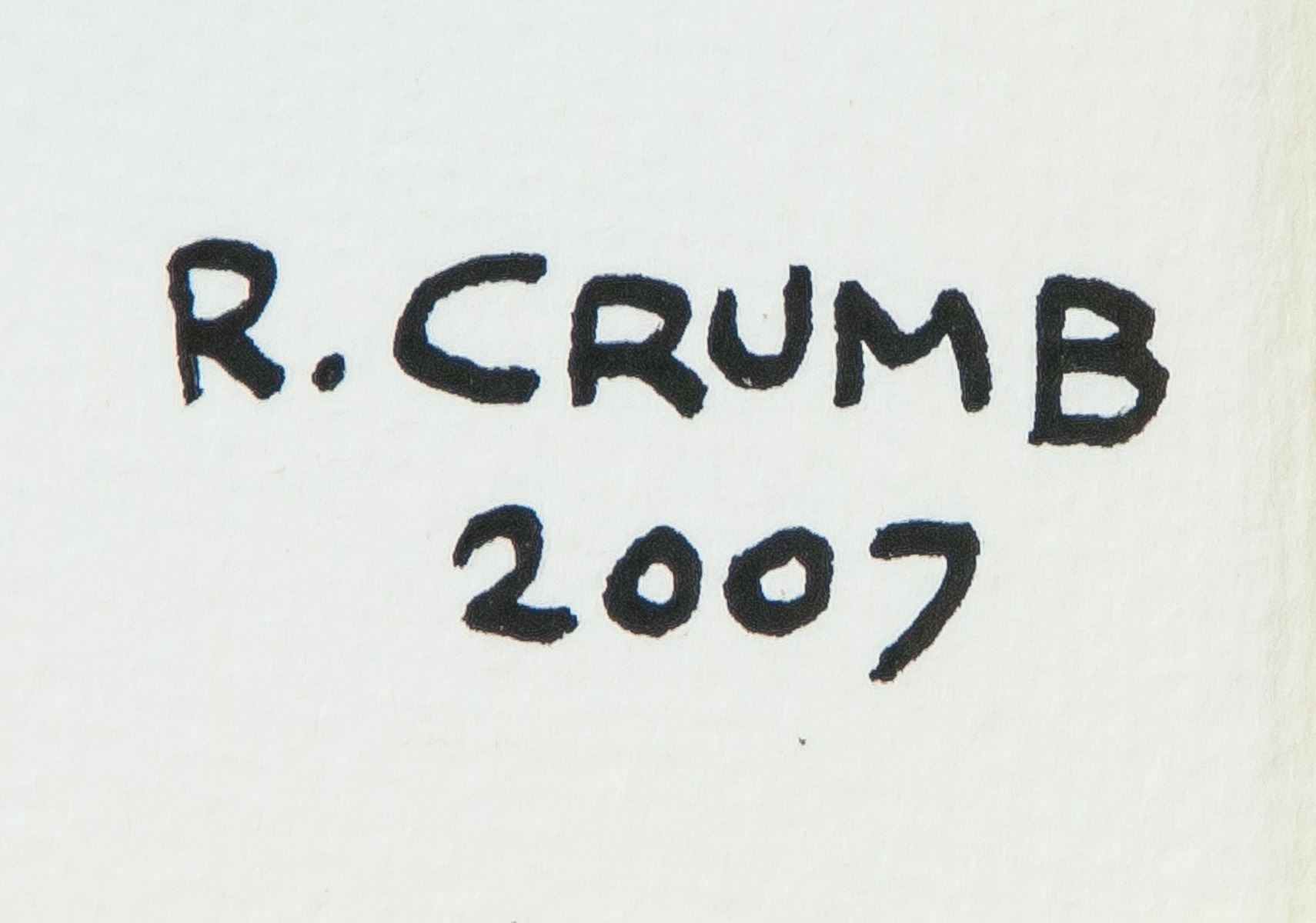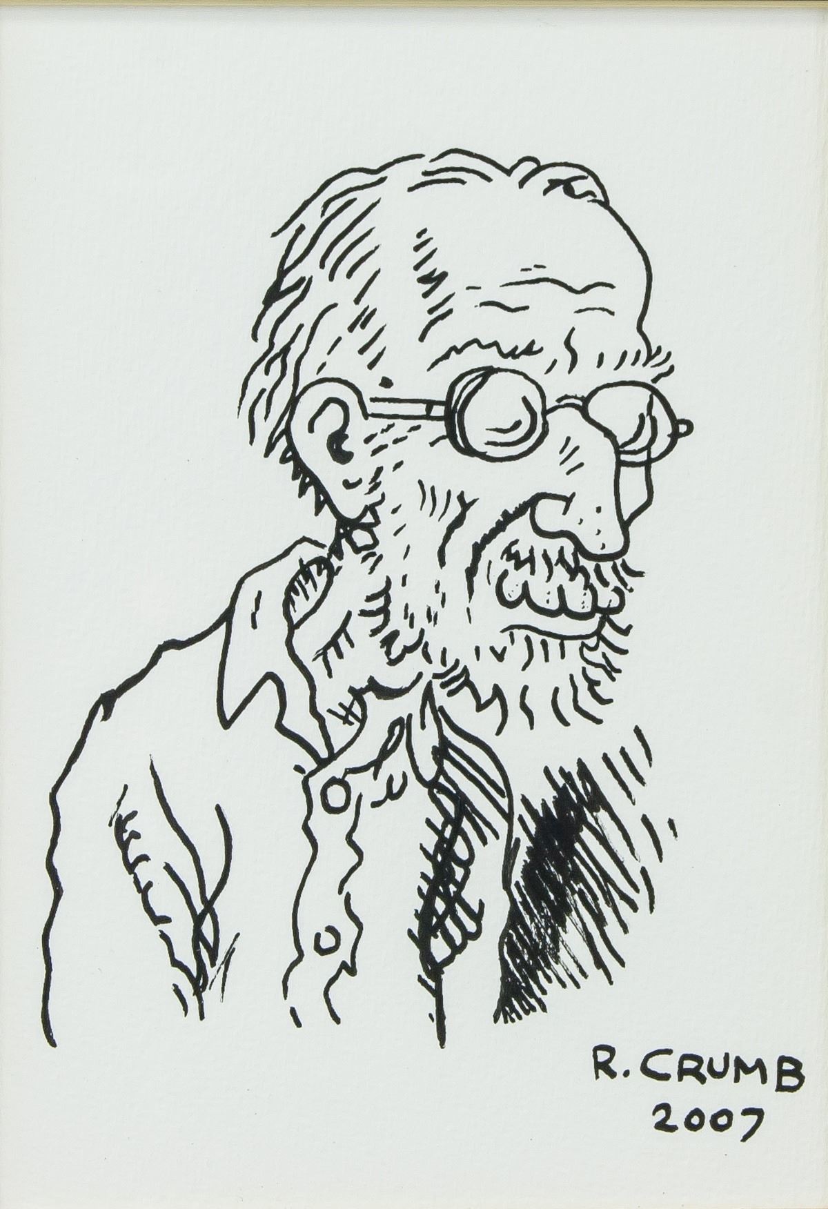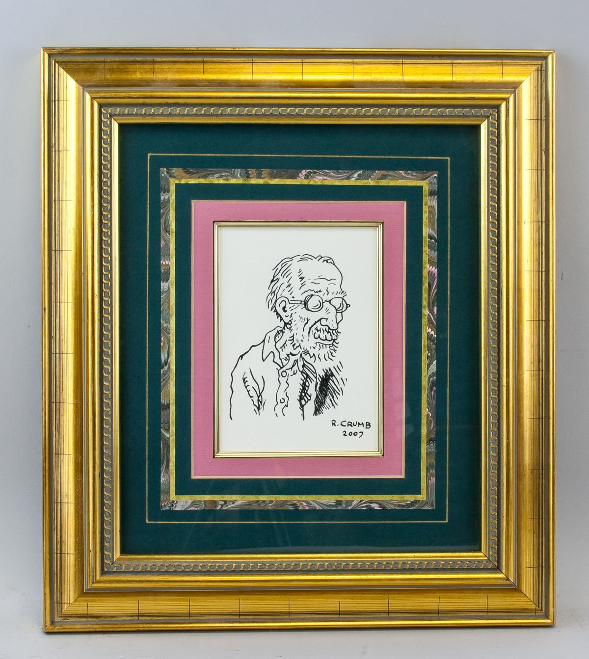 Ink on paper, newly framed. Featuring a cartoon portrait of an old man. Signed and attributed to Robert Crumb (American, b. 1943) on the lower right corner, dated 2007. 15.5 x 10.5 cm (6.1 x 4.1 inches). Frame size: 39 x 34.5 cm (15.4 x 13.6 inches) Robert Crumb is a contemporary American satirist, comic artist, and illustrator. Best known for his expressive and highly stylized pen-and-ink drawings, Crumb unapologetically skewers sex, religion, race, and contemporary American culture. He is frequently described as a misanthrope and a perpetual malcontent, with his work being humorously irreverent, often sexually explicit, and admittedly influenced and inspired by hallucinations and drug use. A major figure in the underground comix movement of the late 20th century, the artist was born on August 30, 1943 in Philadelphia, PA to a poverty-stricken and troubled family life. He spent his youth producing illustrations for comic books, greeting cards, and bubblegum cards, finally finding creative success in the late 1960s. Crumb's oeuvre is extensive, and his work is recognized as a major cultural zeitgeist spanning over half a century. Some of his most famous and recognizable characters and series, including Fritz the Cat, Keep on Truckin’, and Weirdo, have garnered serious critical acclaim, resulting in honors and awards including a major retrospective at the Institute of Contemporary Art in Philadelphia in 2008, reception of a Harvey Special Award for Humor in 1990, and induction into the Will Eisner Comic Book Hall of Fame in 1991. Crumb lives and works in a small village near Sauve in southern France. PROVENANCE: Southern Ontario estate.