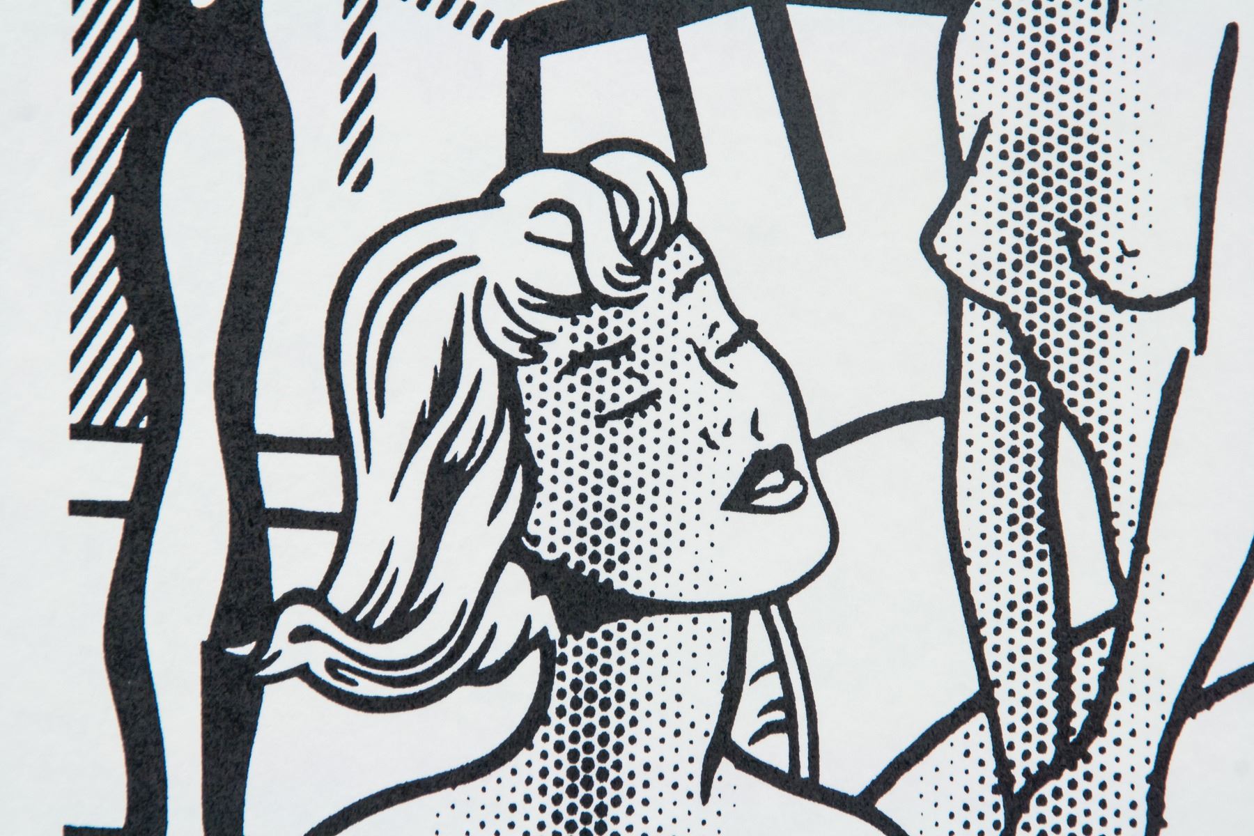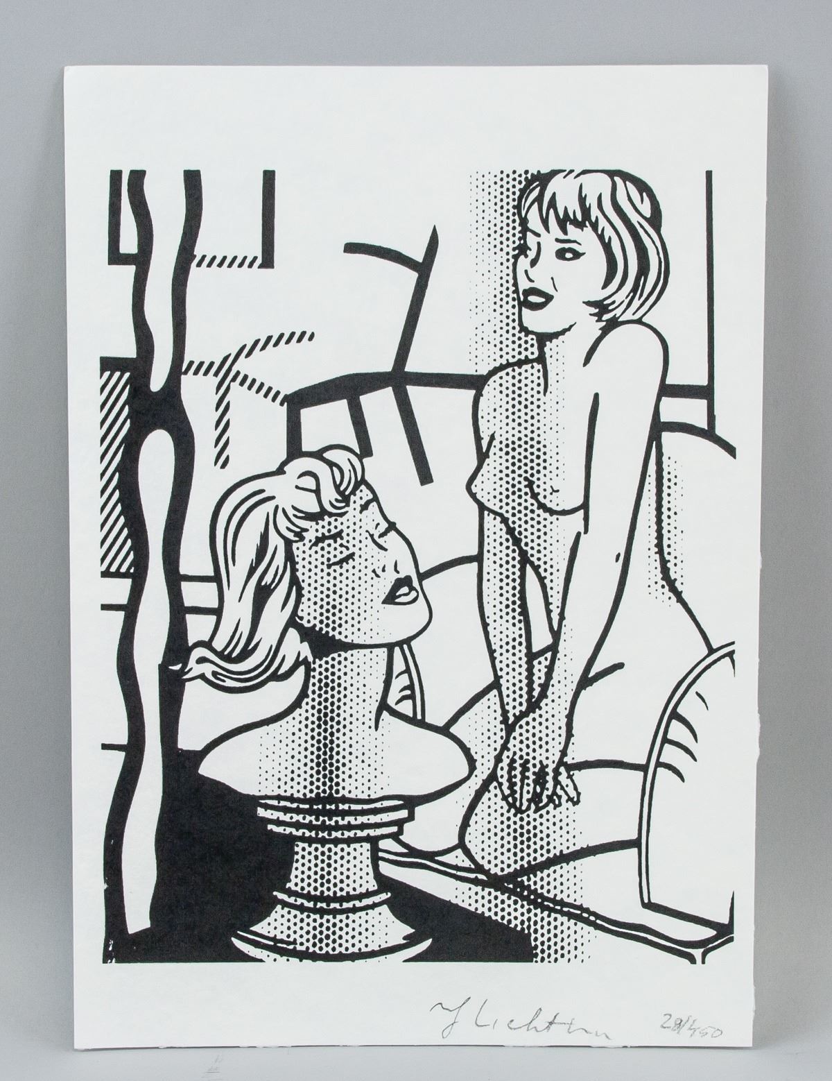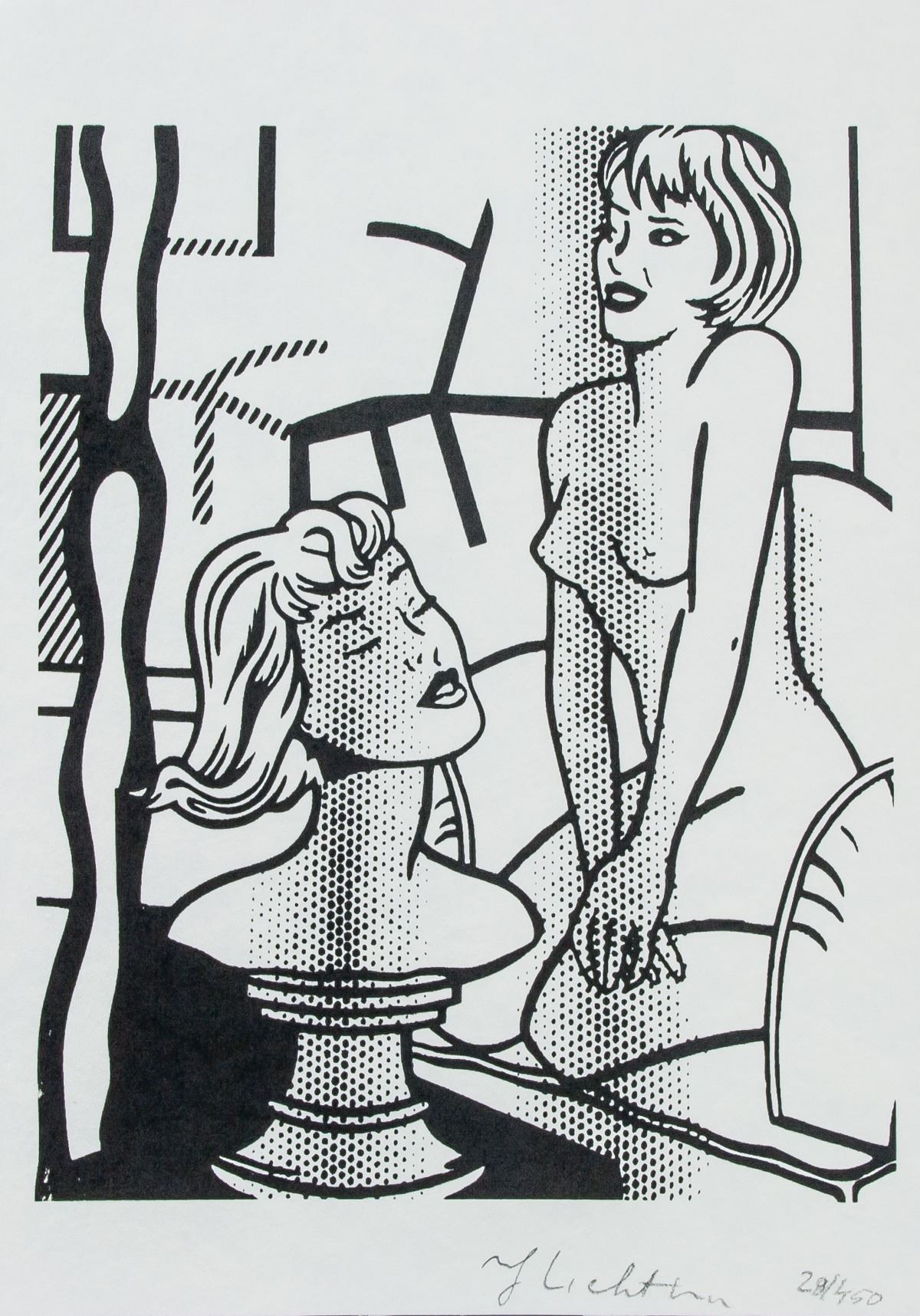 Silkscreen lithograph. Featuring a female nude in front of a bust of a woman in interior scene, portrait. Signed and attributed to Roy Lichtenstein (American, 1923-1997) on the lower right corner. Numbered on the lower right corner, 28/450 and stamped with gallery seal with notation on verso. 29 x 21 cm (11.4 x 8.3 inches). When American Pop artist Roy Lichtenstein painted Look Mickey in 1961, it set the tone for his career. This primary-color portrait of the cartoon mouse introduced Lichtenstein’s detached and deadpan style at a time when introspective Abstract Expressionism reigned. Mining material from advertisements, comics, and the everyday, Lichtenstein brought what was then a great taboo - commercial art - into the gallery. He stressed the artificiality of his images by painting them as though they’d come from a commercial press, with the flat, single-color Ben-Day dots of the newspaper meticulously rendered by hand using paint and stencils. Later in his career, Lichtenstein extended his source material to art history, including the work of Claude Monet and Pablo Picasso, and experimented with three-dimensional works. Lichtenstein’s use of appropriated imagery has influenced artists such as Richard Prince, Jeff Koons, and Raymond Pettibon. PROVENANCE: Private estate (Toronto, ON)