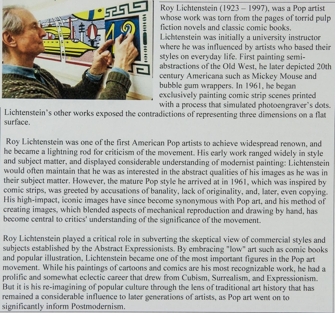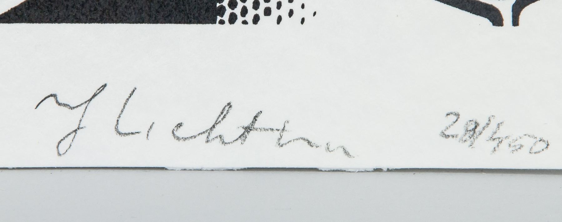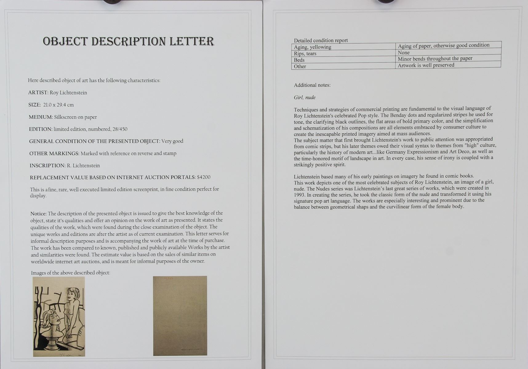 Silkscreen lithograph. Featuring a female nude in front of a bust of a woman in interior scene, portrait. Signed and attributed to Roy Lichtenstein (American, 1923-1997) on the lower right corner. Numbered on the lower right corner, 28/450 and stamped with gallery seal with notation on verso. 29 x 21 cm (11.4 x 8.3 inches). When American Pop artist Roy Lichtenstein painted Look Mickey in 1961, it set the tone for his career. This primary-color portrait of the cartoon mouse introduced Lichtenstein’s detached and deadpan style at a time when introspective Abstract Expressionism reigned. Mining material from advertisements, comics, and the everyday, Lichtenstein brought what was then a great taboo - commercial art - into the gallery. He stressed the artificiality of his images by painting them as though they’d come from a commercial press, with the flat, single-color Ben-Day dots of the newspaper meticulously rendered by hand using paint and stencils. Later in his career, Lichtenstein extended his source material to art history, including the work of Claude Monet and Pablo Picasso, and experimented with three-dimensional works. Lichtenstein’s use of appropriated imagery has influenced artists such as Richard Prince, Jeff Koons, and Raymond Pettibon. PROVENANCE: Private estate (Toronto, ON)