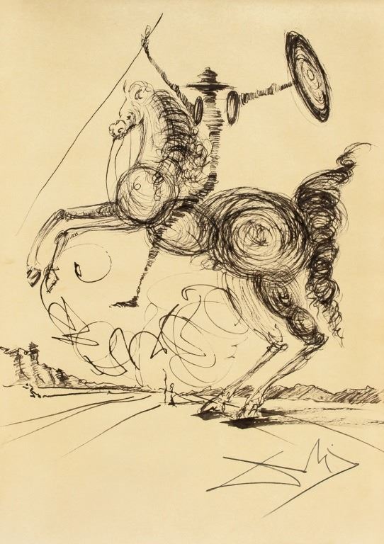 Ink on paper sketch, featuring rearing horse with Don Quixote; signed and attributed to Salvador Dali (Spanish, 1904-1989); 11.5 x 8 inch (29.21 x 20.32 cm). PROVENANCE: Upper New York Estate. Acquired by current owner from above, 2017.