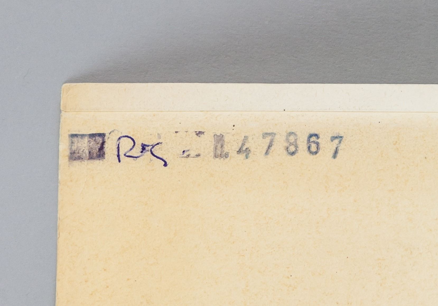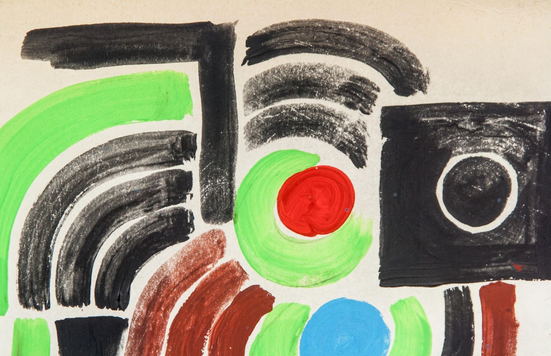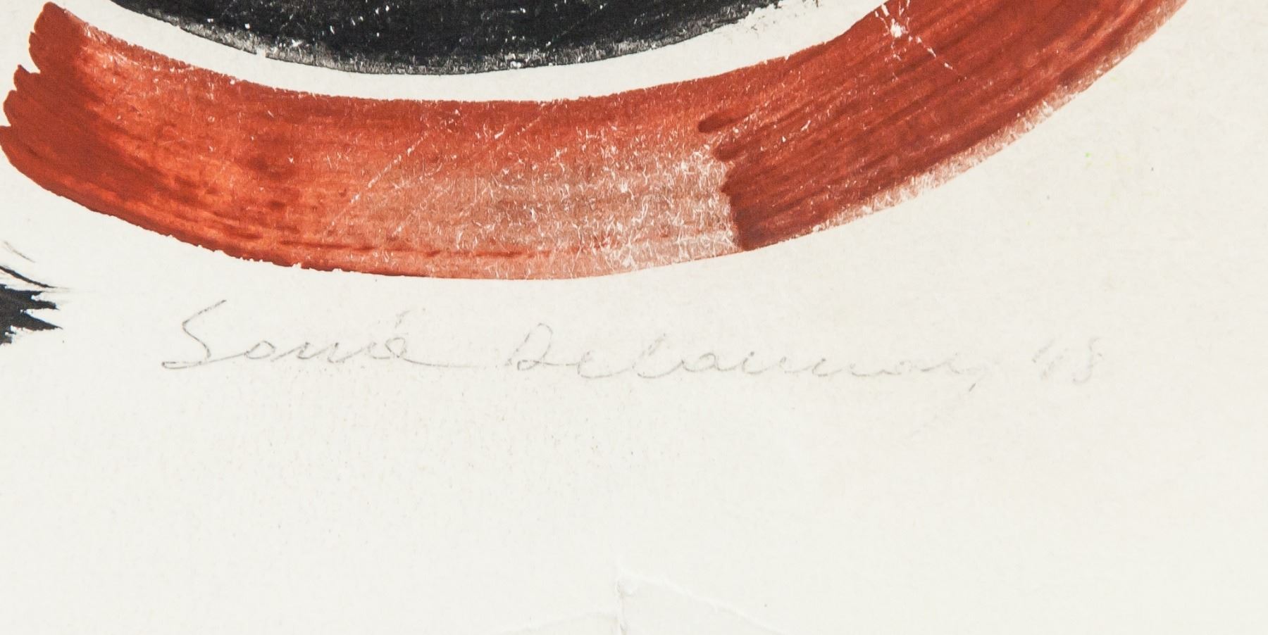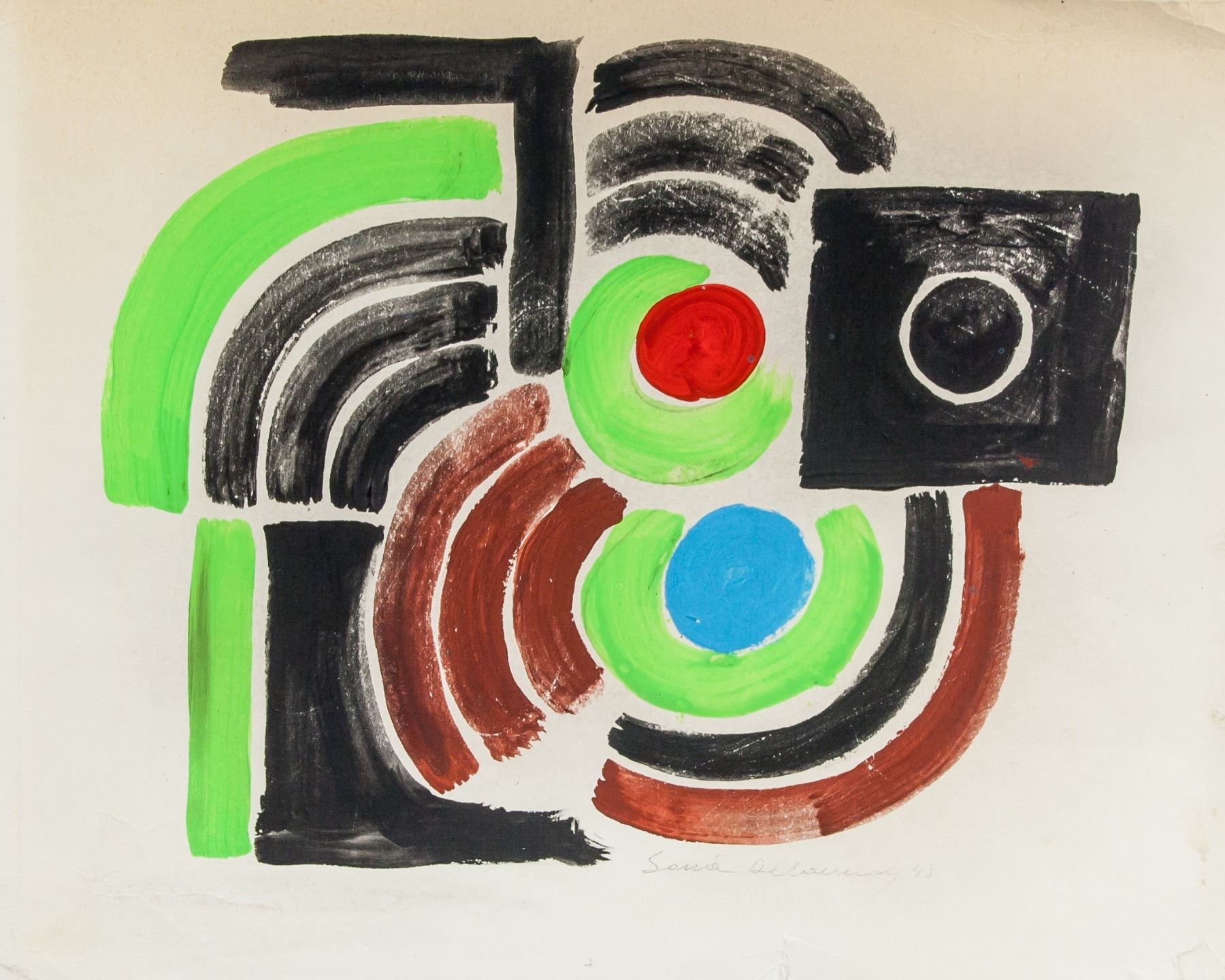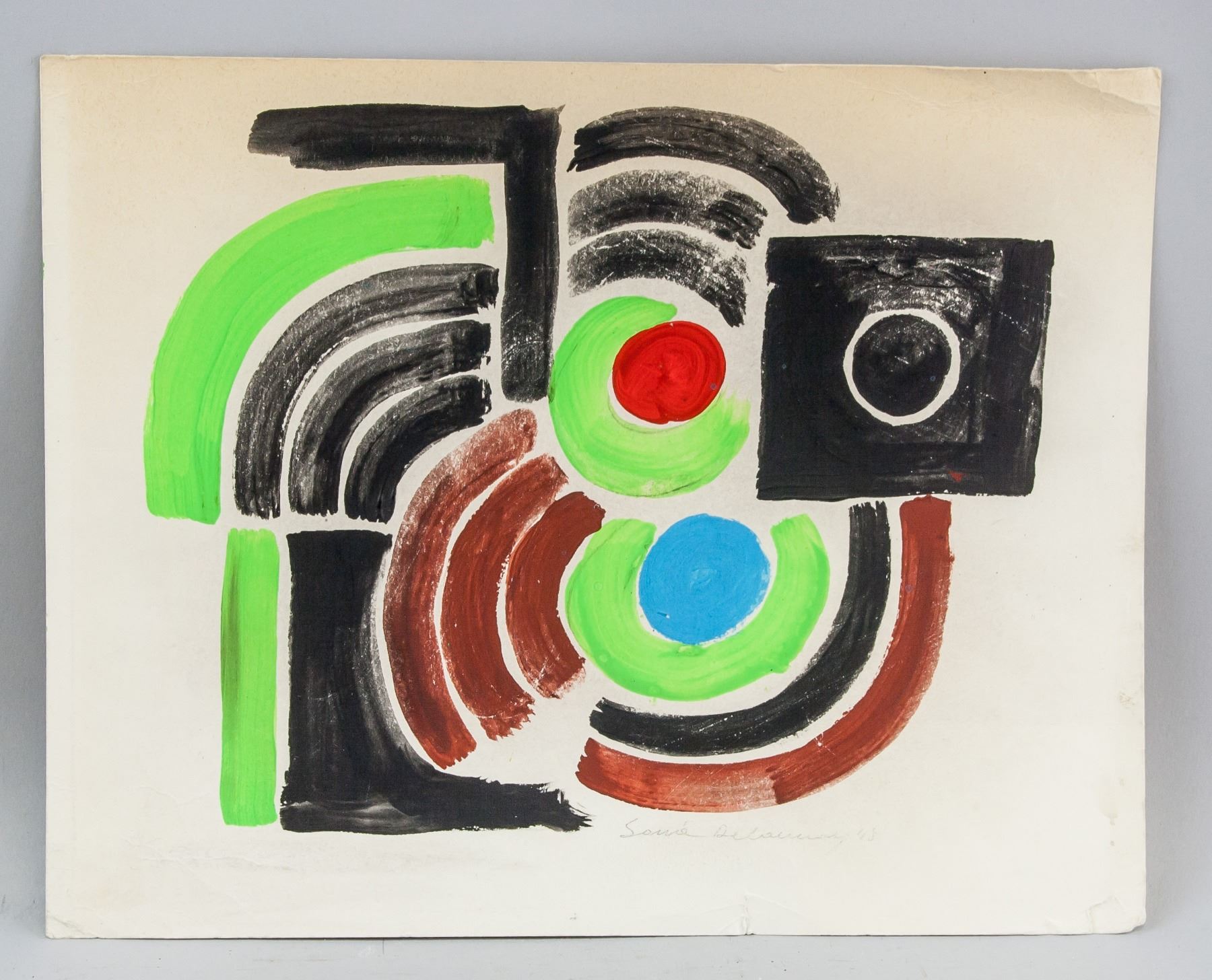 Mixed media on paper. Abstract composition. Signed and attributed to Sonia Delaunay (French, 1885-1979) on lower margin. 21.5 x 27.5 cm. Sonia Delaunay was a multi-disciplinary abstract artist and key figure in the Parisian avant-garde. Alongside her husband, Robert Delaunay, she pioneered the movement Simultanism. Her exploration of the interaction between colours has created a sense of depth and movement throughout her oeuvre. Sonia Delaunay spanned the full arc of the adventure of abstraction in Europe across the first half of the 20th century. One of the early pioneers, she helped to bring art and life together in the period between the First and Second World Wars and continued to champion the cause of abstraction as a universal visual language in the post-war era. As she wrote in her autobiography: We Will Go Right Up to the Sun (Nous irons jusq’au soleil) in 1978, one year before she passed away: ‘What had people been saying about me up to then? – muse of Orphism, decorator, Robert Delaunay’s partner. Then they conceded: "collaborator, continuer…" before admitting that the work existed in its own right." As well as a major retrospective at the Kunstmuseum Bielefeld in 1958, Delaunay was the first living female artist to have a retrospective exhibition at the Louvre in 1964. She has also had her work shown at Musee d’Art Moderne in Paris, Smithsonian Cooper-Hewitt, National Design Museum, Musee des Arts Decoratifs, Musee National d’Art Moderne and Tate Modern. PROVENANCE: Private collectoin (Italy)