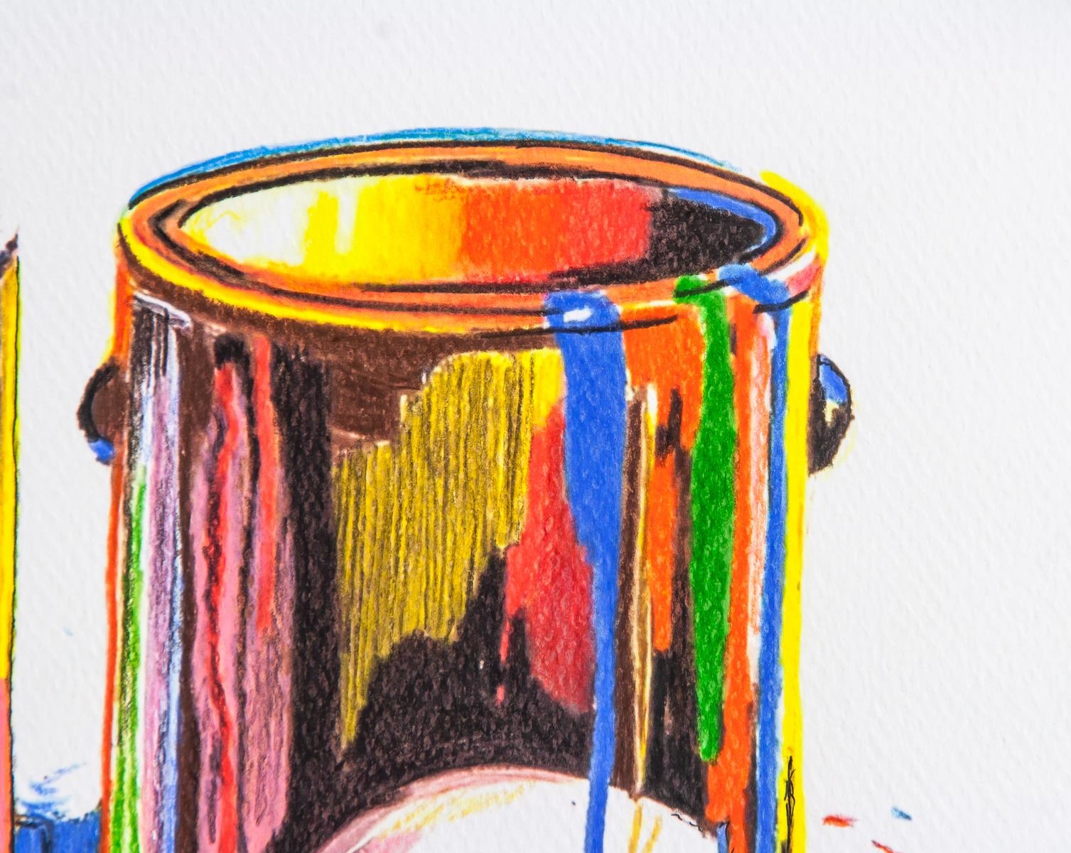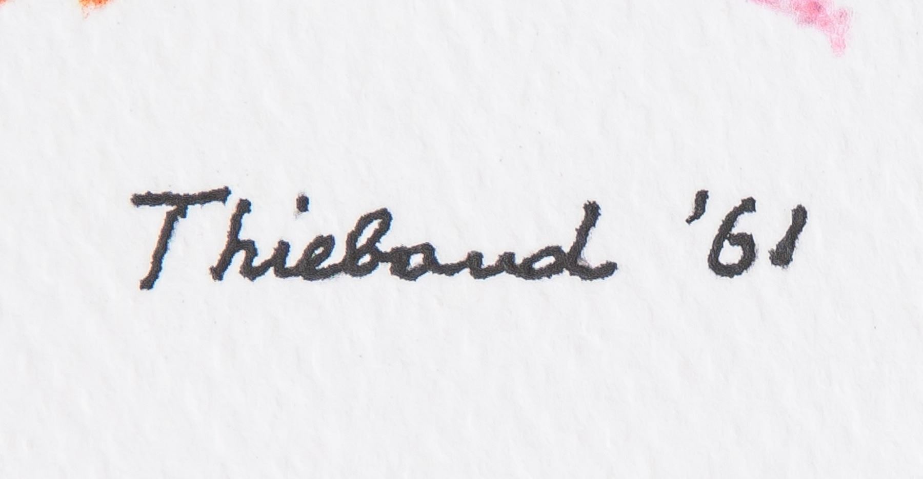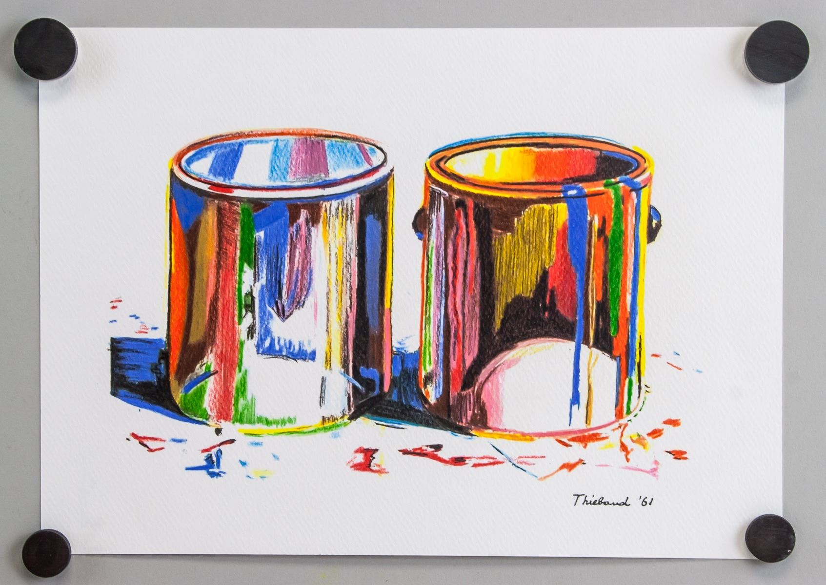 Color pencil crayon on paper, featuring a still life drawing of two tin cans. Signed and attributed to Wayne Thiebaud (American, b. 1920) on the lower right corner. 21 x 30 cm (8.3 x 11.8 inches) Wayne Thiebaud is an American painter best known for his still lifes of edible treats and everyday objects in his singular illustrative style. His most popular subject matter includes colorful cakes, slices of pie, candy pieces, and the winding streets of San Francisco. Similarly to Edward Hopper, Theibaud’s paintings capture a uniquely American sensibility, and critics have compared his penchant for still life to painters like Chardin and Giorgio Morandi.“A conscious decision to eliminate certain details and include selective bits of personal experiences or perceptual nuances, gives the painting more of a multi-dimension than when it is done directly as a visual recording,” he reflected. “This results in a kind of abstraction, and thus avoids the pitfalls of mere decoration.” Born Morton Wayne Thiebaud on November 15, 1920 in Mesa, AZ, the painter moved to California soon after, where he became interested in stage design and lighting. He began his career as a commercial artist, but switched to fine art after during his education and earned an MFA from what is now the California State University at Sacramento. A trip to New York during the 1950s introduced him to Willem de Kooning and Elaine de Kooning, Franz Kline, and others in the city’s art scene at the time. Although he continued to show on the East Coast, Thiebaud has remained in the Bay Area, and his work can be found in the collections of the Whitney Museum, the Los Angeles County Museum of Art, and the San Francisco Museum of Modern Art, among others. He was awarded the National Medal of Arts in 1994.