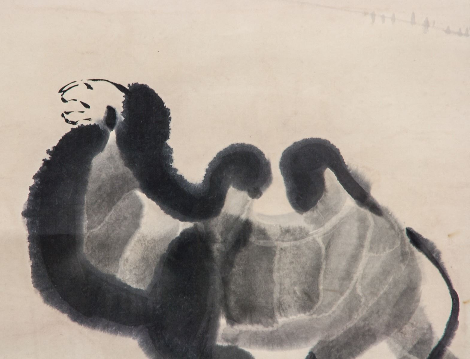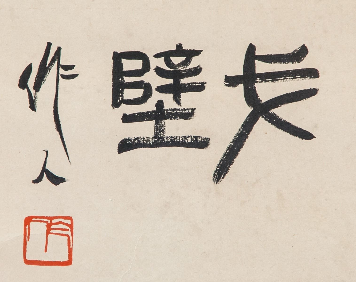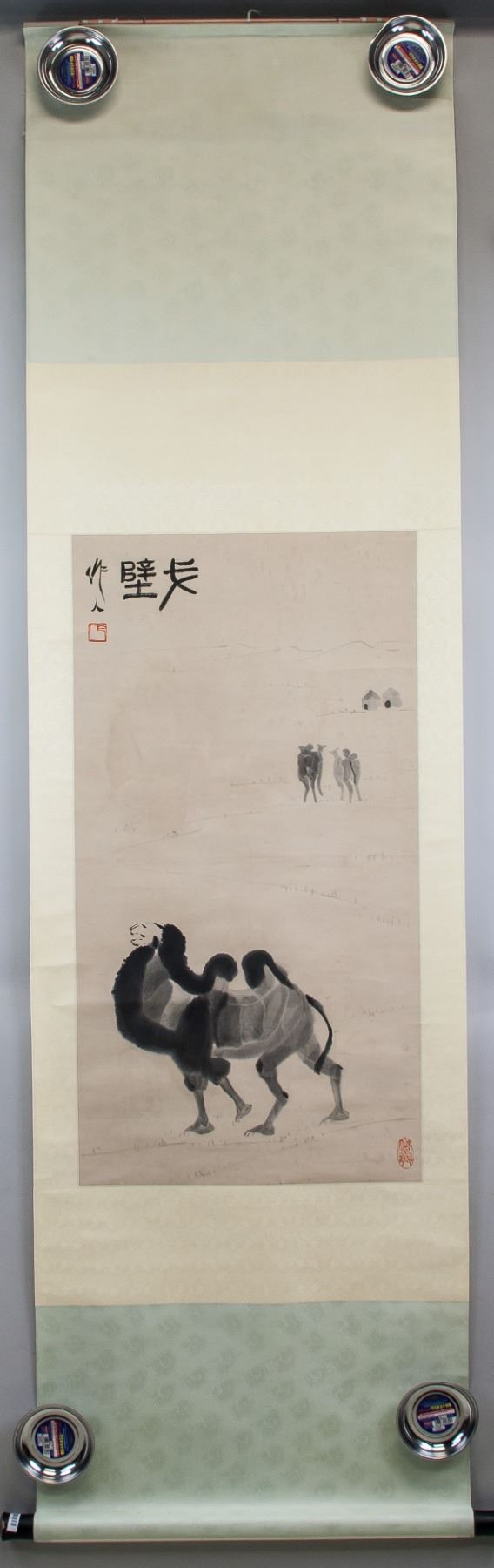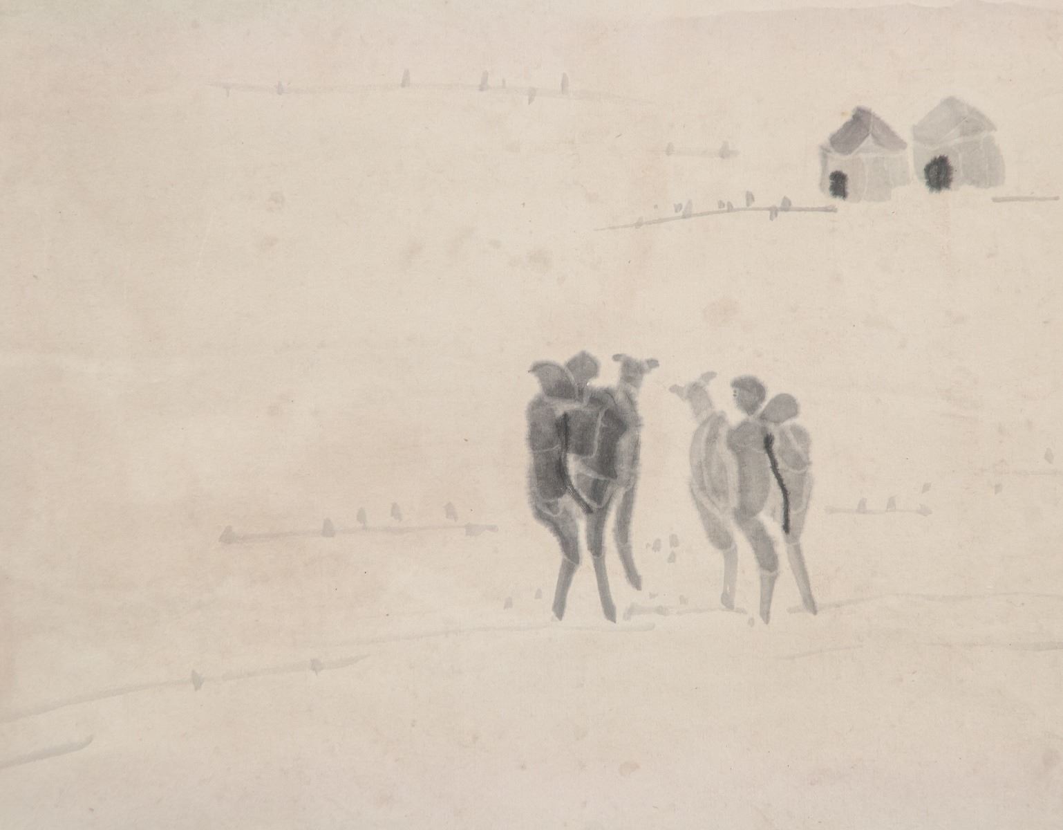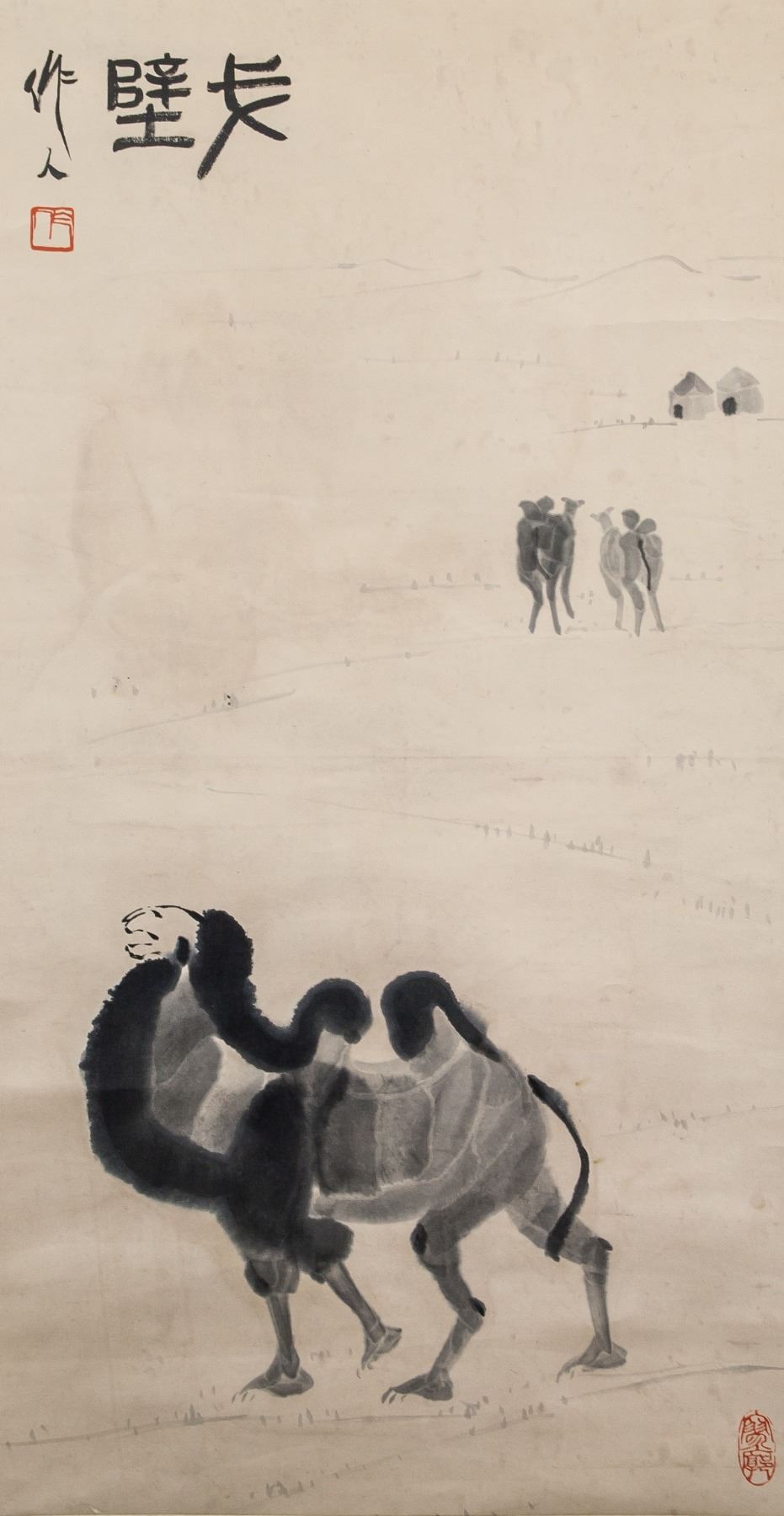 Ink on paper, hanging scroll, featuring gobi desert and camels, signed and attributed to Wu Zuoren (Chinese, 1908-1997), inscribed with 2 artist seals, 83 x 45 cm, Wu Zuoren was a Chinese painter. A native of Jing County, Anhui, he was born in Suzhou, Jiangsu Province. He practiced both traditional Chinese ink painting and European oil painting.