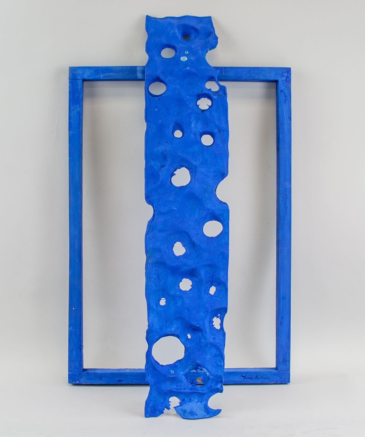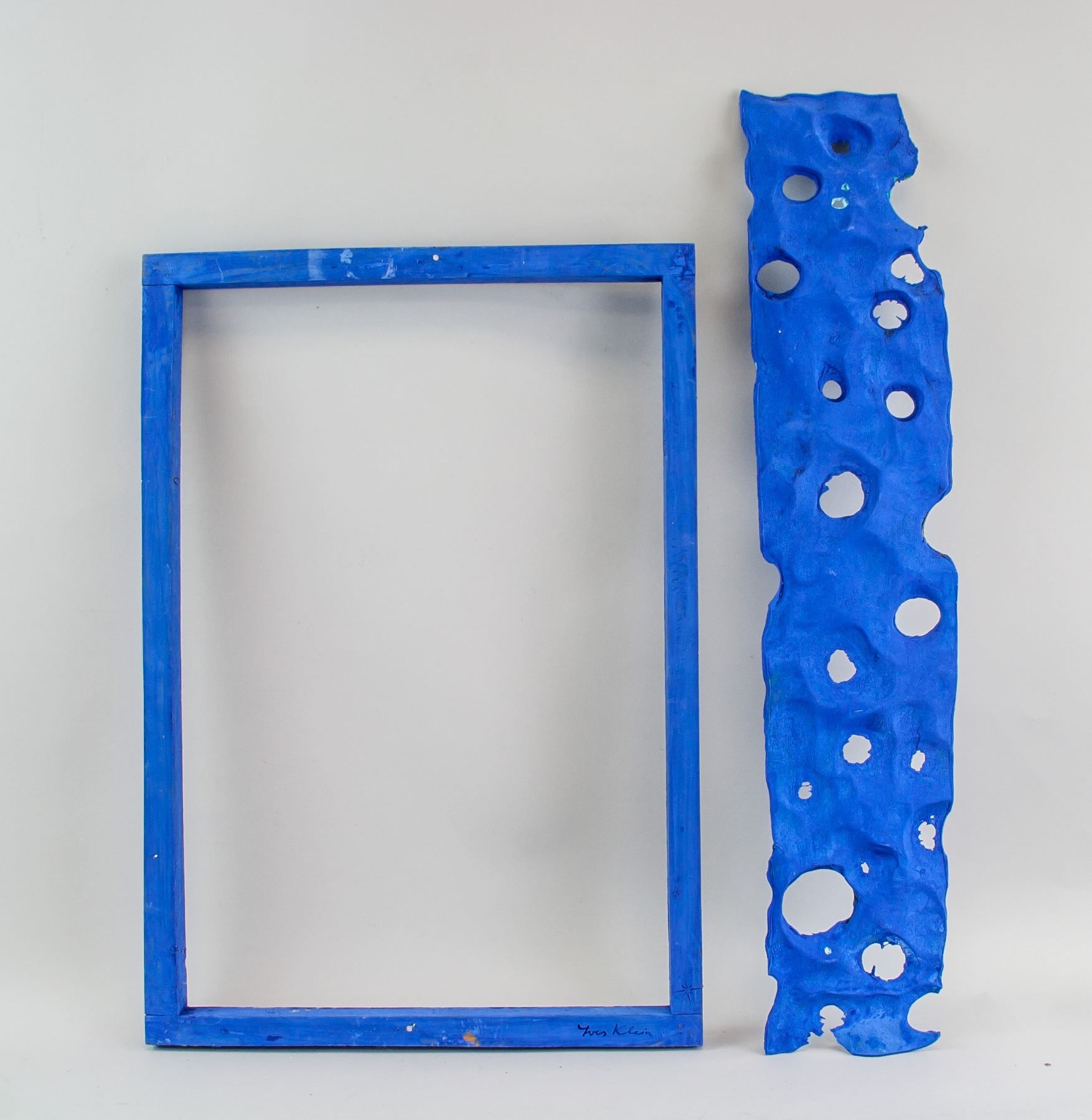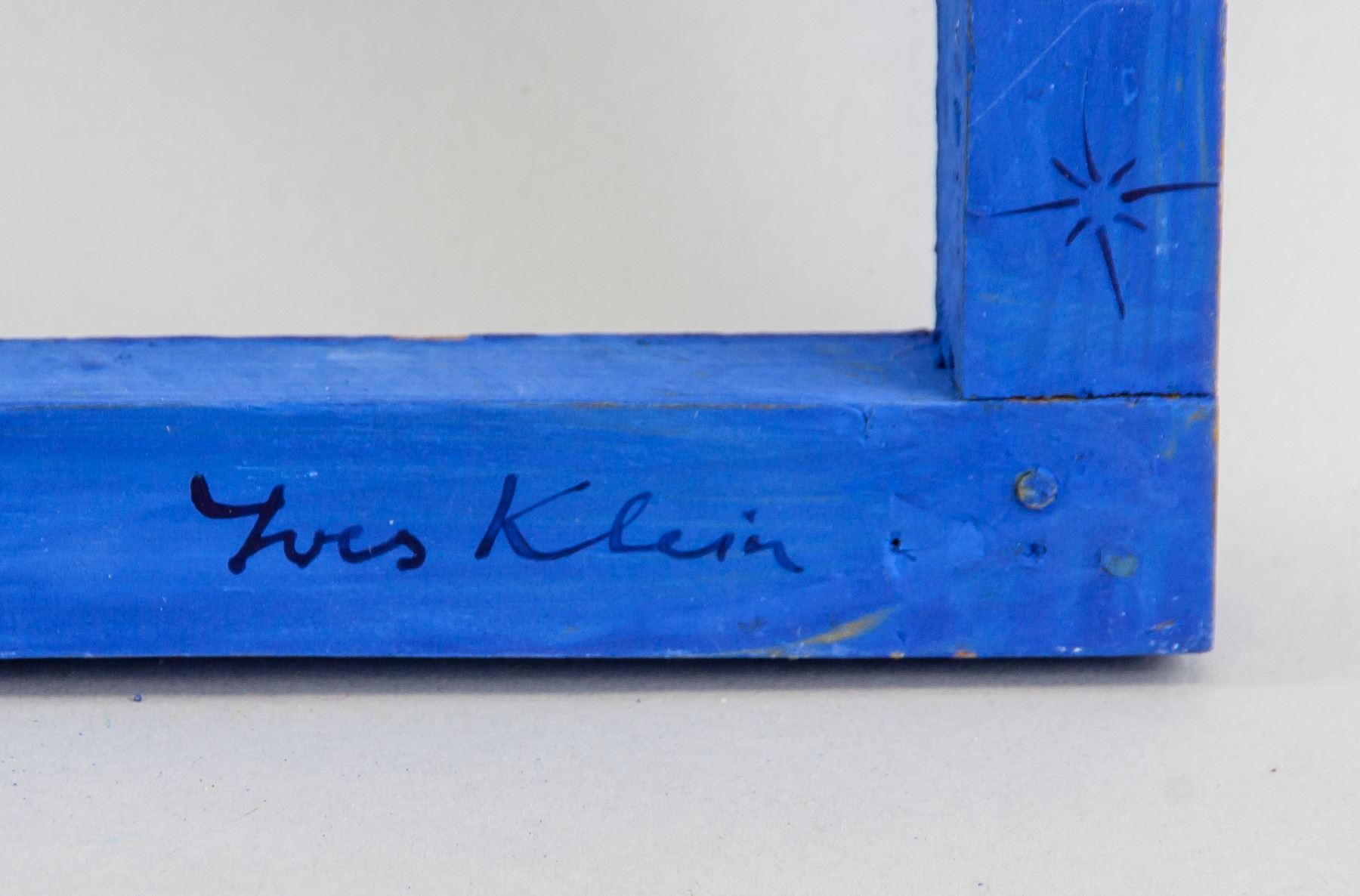 Mixed media artwork including foam, paint and wooden frame. Signed and attributed to Yves Klein (French, 1928-1962), signature on the lower right side on the wooden frame. 24.4 x 13.8 in. (62 x 35 cm). Yves Klein is best known for his trademark ultramarine pigment, which he patented as International Klein Blue in 1961. "Blue…is beyond dimensions, whereas the other colors are not," he said. "All colors arouse specific ideas, while blue suggests at most the sea and the sky; and they, after all, are in actual, visible nature what is most abstract." Starting in the mid-1950s, Klein made retinal blue monochromes (which would prove cornerstones of Minimalism) and the pigment would also feature prominently in his Anthropometry paintings, for which Klein smeared nude women with blue pigment and used them as human brushes on canvas, sometimes in elaborate public performances.