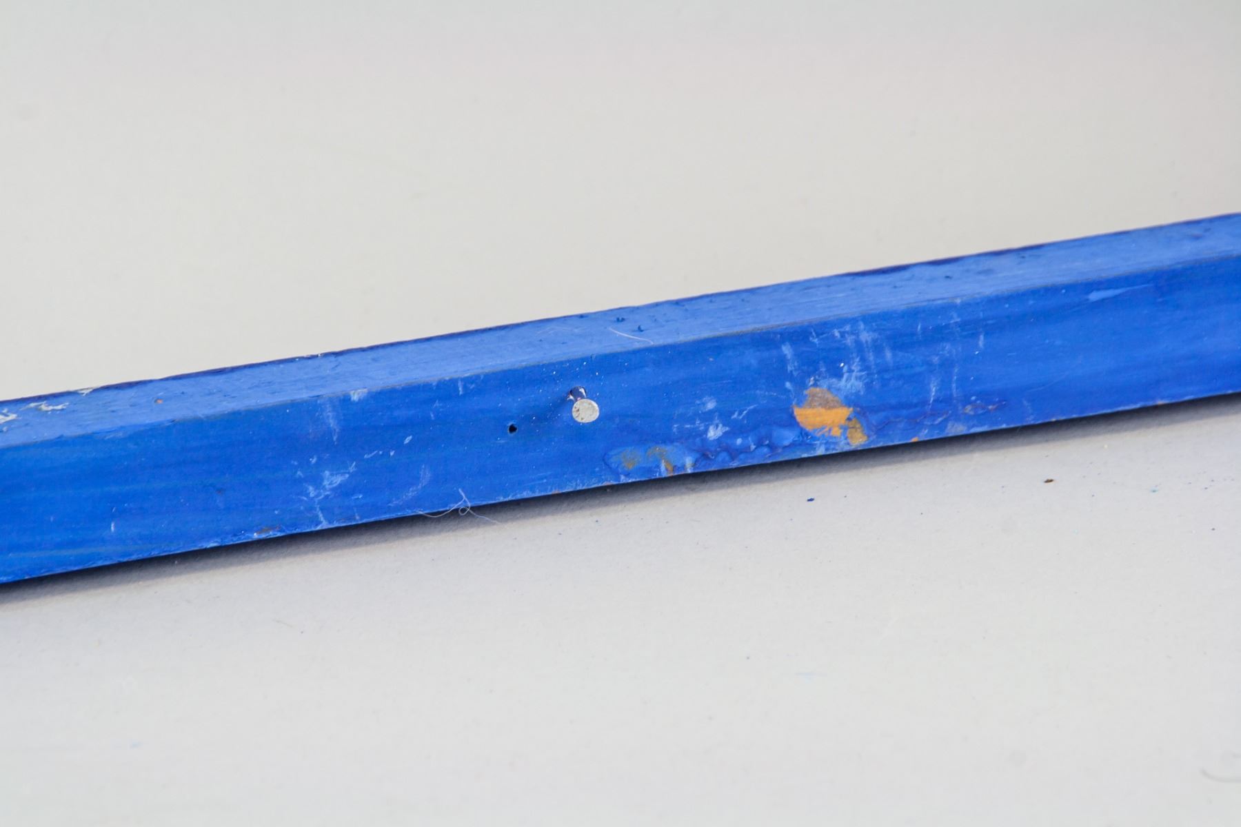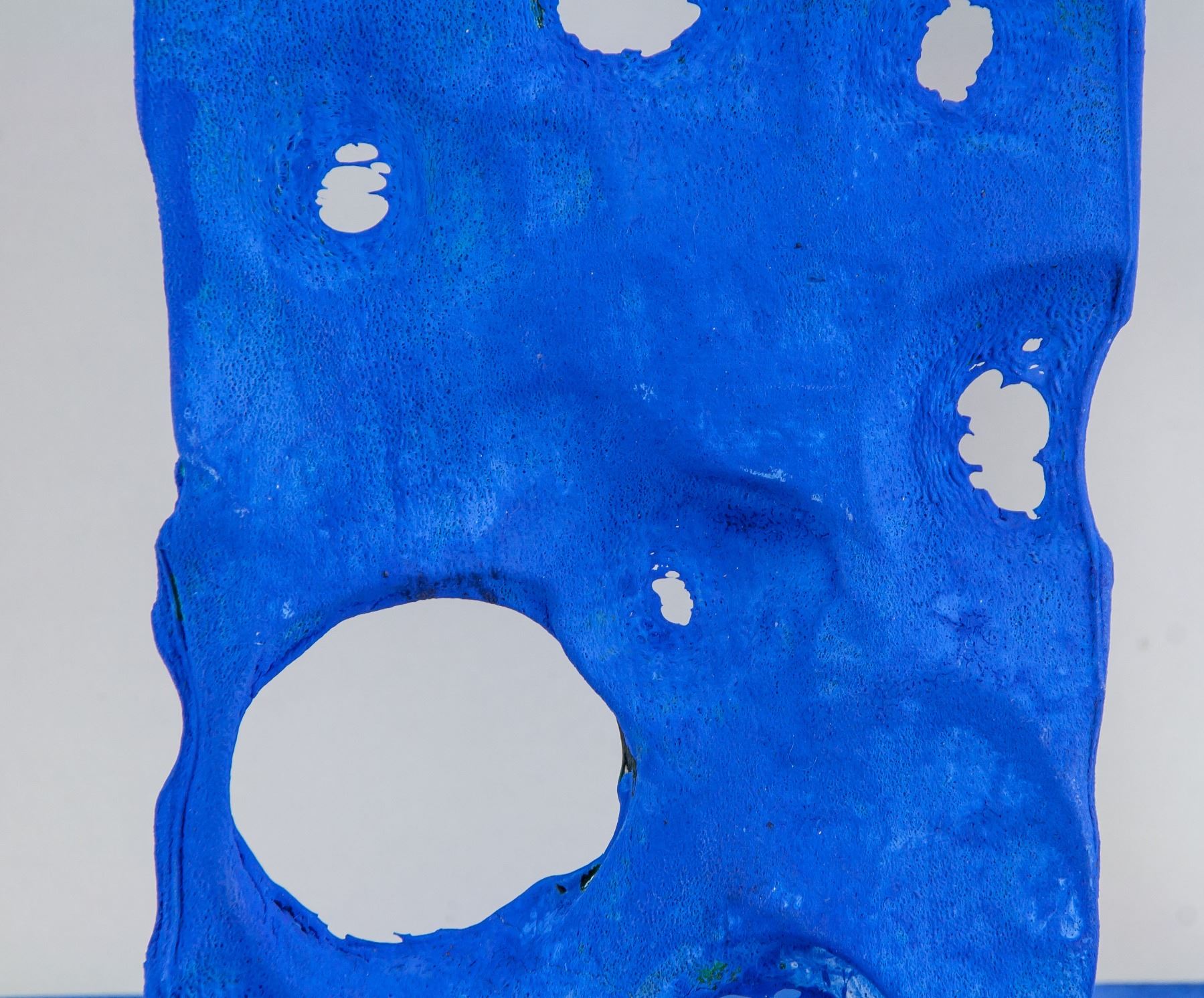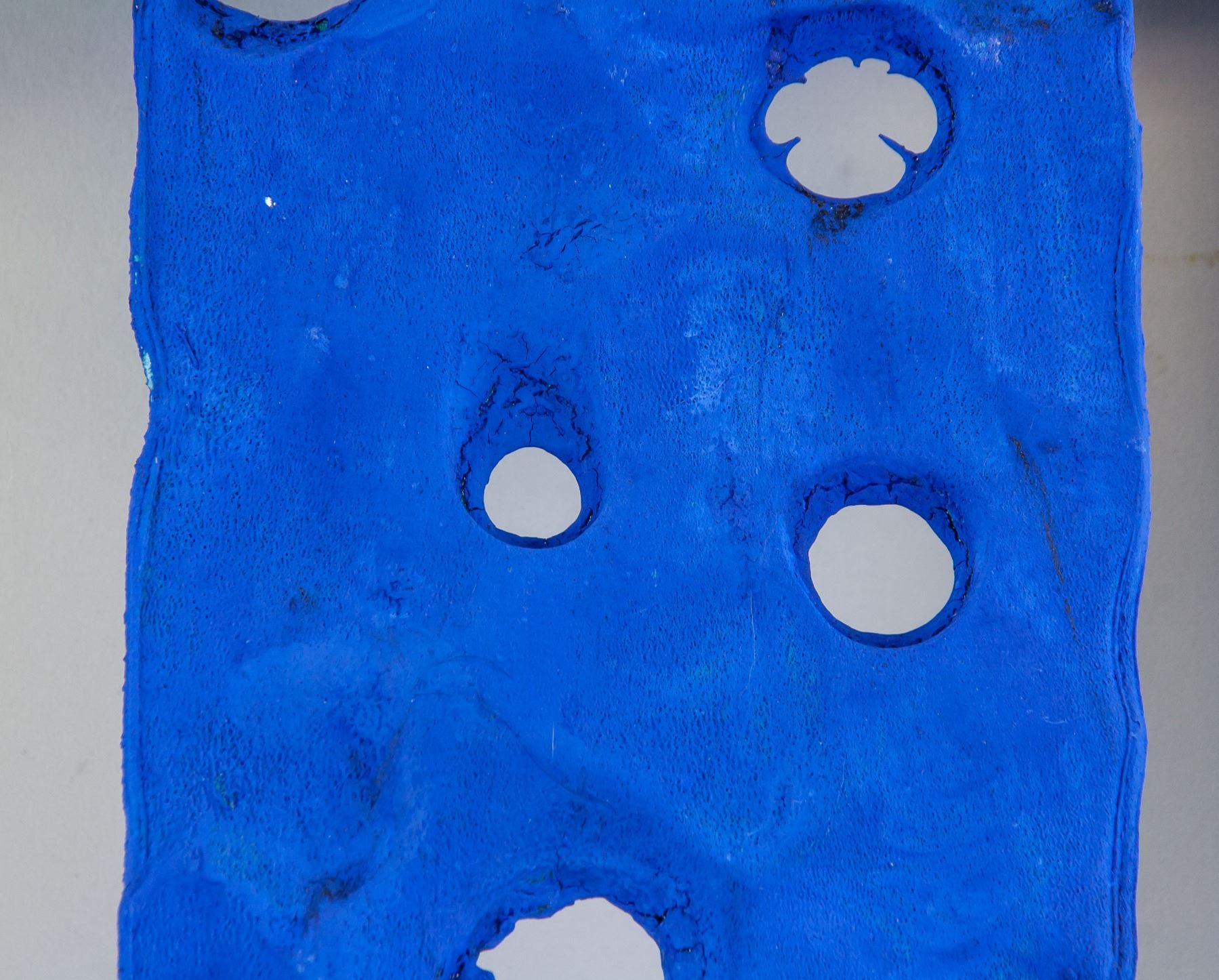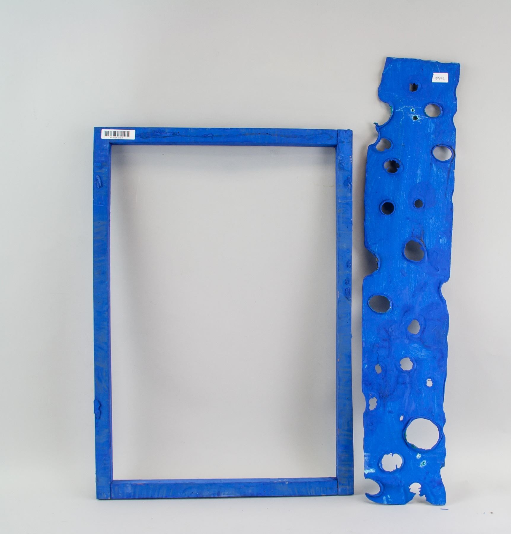 Mixed media artwork including foam, paint and wooden frame. Signed and attributed to Yves Klein (French, 1928-1962), signature on the lower right side on the wooden frame. 24.4 x 13.8 in. (62 x 35 cm). Yves Klein is best known for his trademark ultramarine pigment, which he patented as International Klein Blue in 1961. "Blue…is beyond dimensions, whereas the other colors are not," he said. "All colors arouse specific ideas, while blue suggests at most the sea and the sky; and they, after all, are in actual, visible nature what is most abstract." Starting in the mid-1950s, Klein made retinal blue monochromes (which would prove cornerstones of Minimalism) and the pigment would also feature prominently in his Anthropometry paintings, for which Klein smeared nude women with blue pigment and used them as human brushes on canvas, sometimes in elaborate public performances.