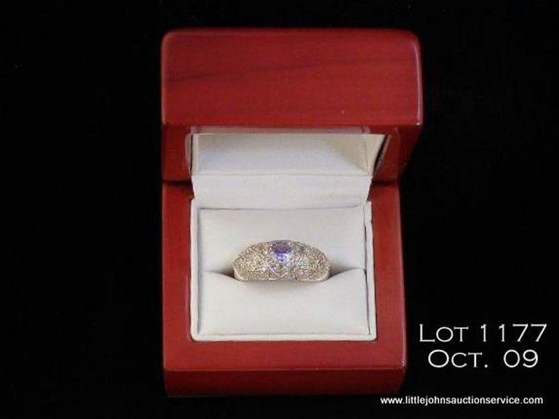 Attractive 14 karat white gold ladies designer ring set with a center fine Tanzanite and pave set with approx. 1.20 carats in round diamonds of G-H colors. Retail $2,750. Estimate $800-$1,000 Featured item. Very labor intensive.
