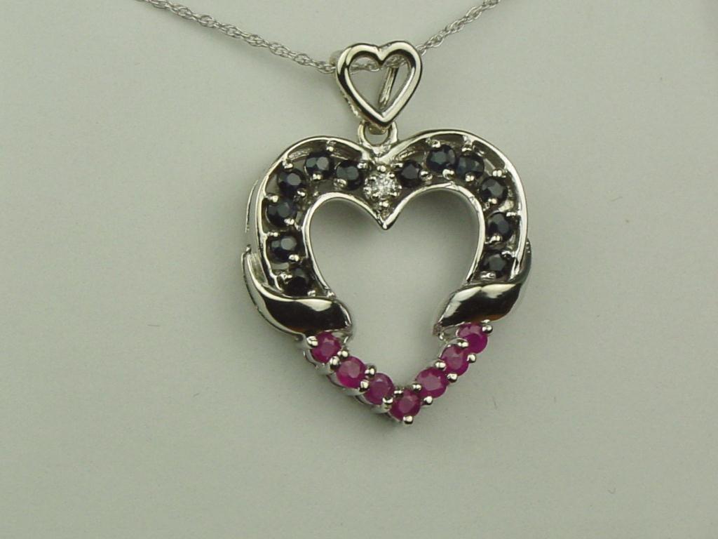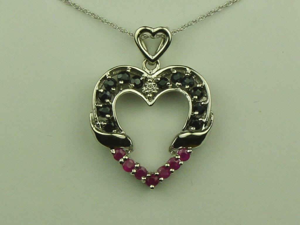 Attractive 14K WG Ladies Heart Design Pendant Fine set with over 20 round sapphires, rubies, and diamond weighing approx. 1.00 carat. Retail: $1,150.00Fine set with over 20 round sapphires, rubies, and diamond weighing approx. 1.00 carat. Retail: $1,150.00