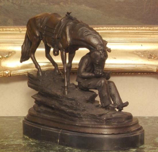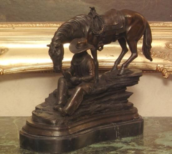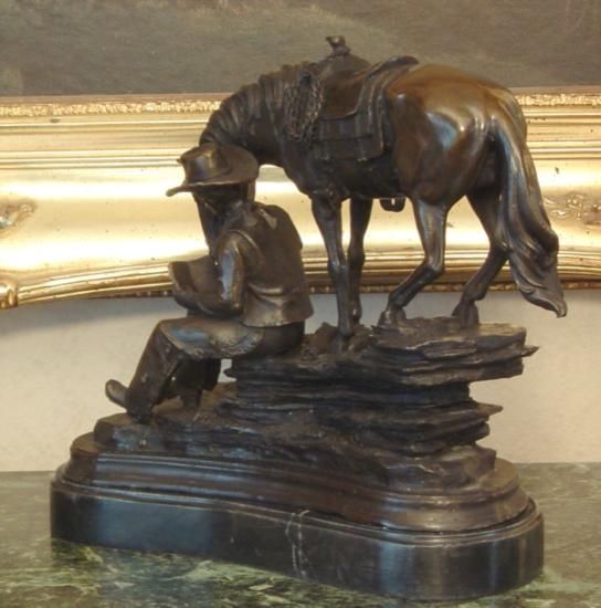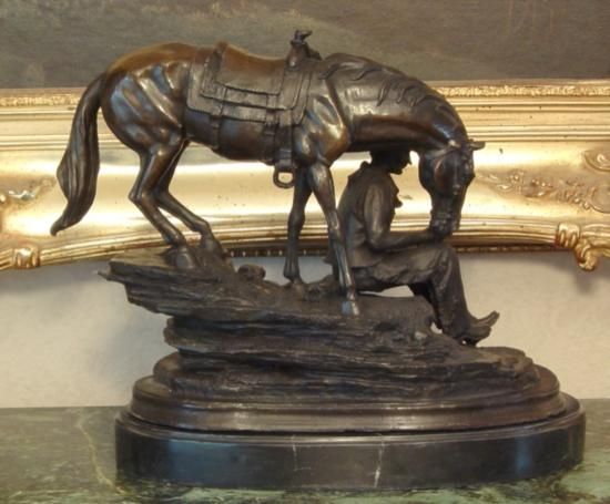Bronze Cowboy and Horse Bronze Sculpture, After Barye - 13"H x11"W x 6"D 24 lbs. This bronze sculpture was produced using the "Lost Wax" casting method. The"Lost Wax" Cast method is the most precise metal casting technique in existence, ensuring exquisite detail of the original host model which is usually sculpted in clay or wax. This "Lost Wax" casting method is an extremely labor intensive and expensive process, but the end results produce a Heirloom Quality Masterpiece!