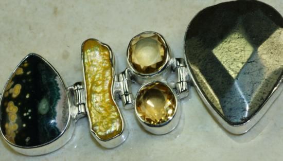 Attractive CITRINE OCEAN JASPER, BIWA PEARL & APACHE GOLD AND STERLING SILVER BRACELET, Length: 7 1/8in - 8 5/8in, Width: 1 1/8in