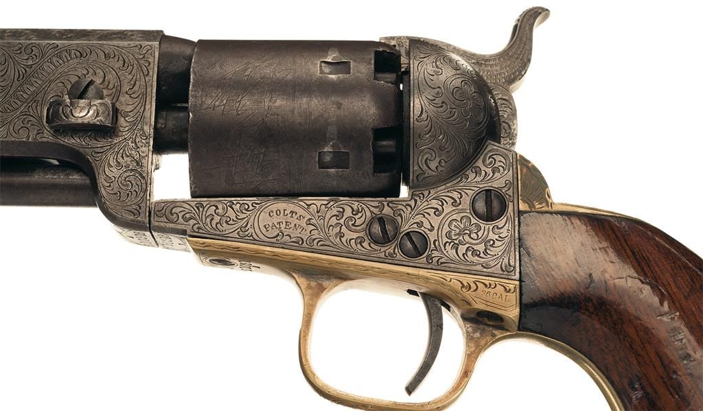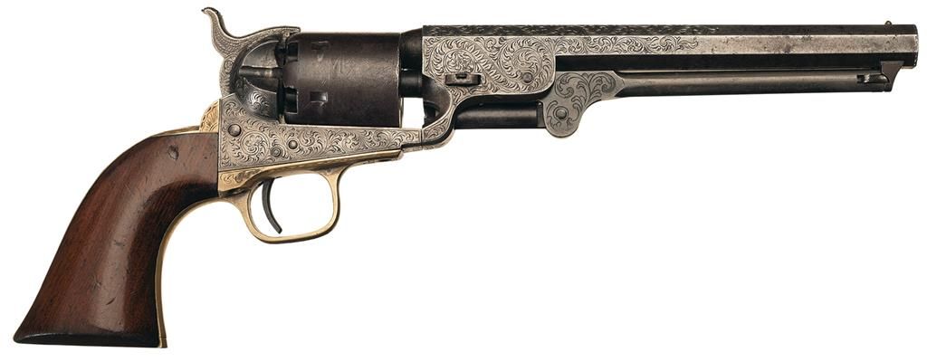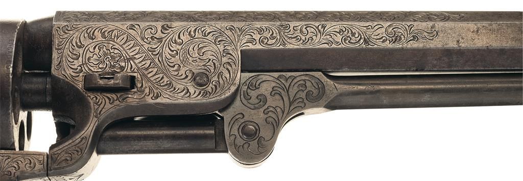 Manufactured in 1870, this is a very nice example of an engraved Colt Model 1851 Navy revolver done very much in the style of Gustave Young. The upper and side barrel flats, barrel lug, frame, rear sides of the loading lever, back strap, head of the wedge and trigger guard bow are engraved with the late percussion vine style engraving pattern. This style is discussed in the book "The Book of Colt Engraving" by R.L. Wilson and there is a photograph of a Model 1860 Army revolver on page 147 with almost identical engraving as that on this revolver. There is a serpents head in the pattern on each side of the barrel lug, and the sides of the hammer have a wolfs head motif and the same vine style as the rest of the revolver. There is a shell design on the top of the back strap. The top barrel lug is marked "-ADDRESS COL. SAML COLT NEW-YORK U.S. AMERICA-", the left side of the frame is marked "COLTS/PATENT" in a downward arch and the left side trigger guard shoulder is marked "36 CAL". The cylinder is roll engraved with the Texas/Mexico naval battle scene and marked "COLTS PATENT No 318". The complete matching serial number is marked on the bottom of the barrel lug, frame, trigger guard and back strap, the partial serial number "0318" is marked on the cylinder pin , "318" on the wedge and the loading lever is un-numbered. The letter "E" is stamped above the serial number on the barrel lug and below the number on the frame, trigger guard and back strap. Standard brass cone front and hammer notch rear sights, the barrel and cylinder were blue, silver plated brass trigger guard and back strap, and casehardened remaining parts. The revolver is fitted with a varnished one-piece walnut grip. Complete in a walnut case with a brass shield inset in the lid and red velvet lining. The case has five compartments and contains a crossed revolvers/stars/eagle/cannon brass powder flask and two cavity iron bullet mold with "COLTS/PATENT" marked on the sprue cutter and "N.J" on the bottom of the left block.