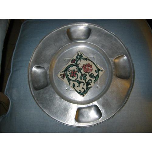 this attractive plate/charger/tray is made By Cellini Craft and has signature on the base. a very nice floral pink and gren tile with white back ground is in the middle of the round tray which adds more charm to this aluminum or Argental handwrought condiment tray. it is in good shape, has imperfection. tile is in perfect condition and measures 6 inches on each side (square shape), it has no chip or crackle. the tray appears to be around for long time. it has mark on the base and reads, Cellini-craft handwrought Argental. This Tray is very attractive with being vintage. it also has scratches and unevenness which adds more attraction to this piece. it measures 17 inches in diameter. w base about 10 inches in depth. something to think about!