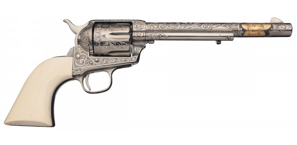 This revolver was manufactured in 1880 and subsequently custom engraved by D.W. Harris of Granbury, Texas. David W. Harris still engraves with a hammer and chisel today and learned the cattle brand engraving style from Wheldon Bledsoe who in turn learned from Cole Agee. This revolver has nearly full coverage of New York style floral scroll engraving with gold highlighted portraits of Buffalo Bill on the left side of the recoil shield, Doc Holiday on the left of the barrel and Wild Bill Hickock on the right side of the barrel. The top of the ejector housing has a zigzag design in the shape of hearts, an intertwined rope design on the top strap, shell design on the recoil shield and top of the back strap, and a decorative simple line design on the back strap. The revolver retains the standard markings as well as "P/C" on the underside of the barrel. Fitted with a smooth one-piece ivory grip.