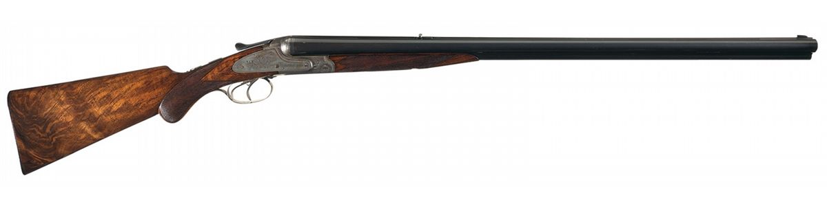This example was manufactured in 1905. The round bottom action, trigger guard and side locks have an ample amount of tight floral scroll engraving. The fences have a feather engraved on them. There is a flip up tang peep sight, the side lever cocks the rifle barrel and there is cocking indicators. The bottom of the receiver is engraved "D.R.P./No. 18411". The barrels have a beaded blade front sight, a flip up rear sight, are choked improved cylinder/improved modified and have 2 5/8 inch chambers with an extractor. Mounted on a nicely figured, multi-point checkered walnut forearm and round knob pistol grip stock with silver initial oval and serrated horn buttplate. Length of pull is 13 1/2 inches. Consignor's notes indicate the rifle barrel is chambered in 30-30.