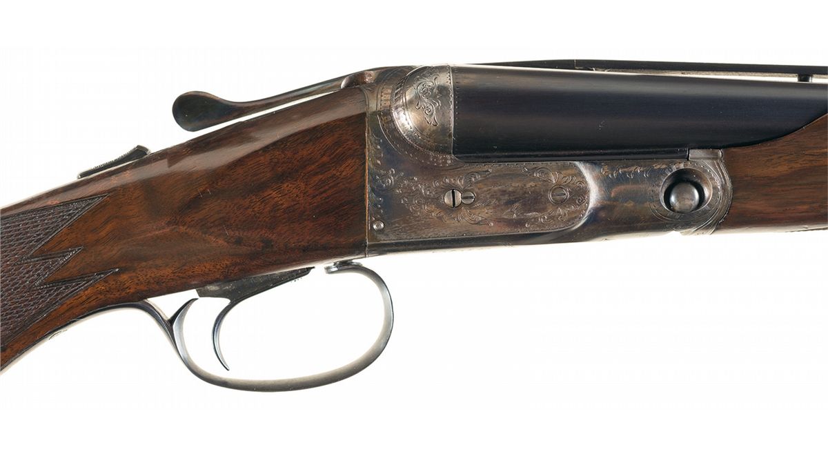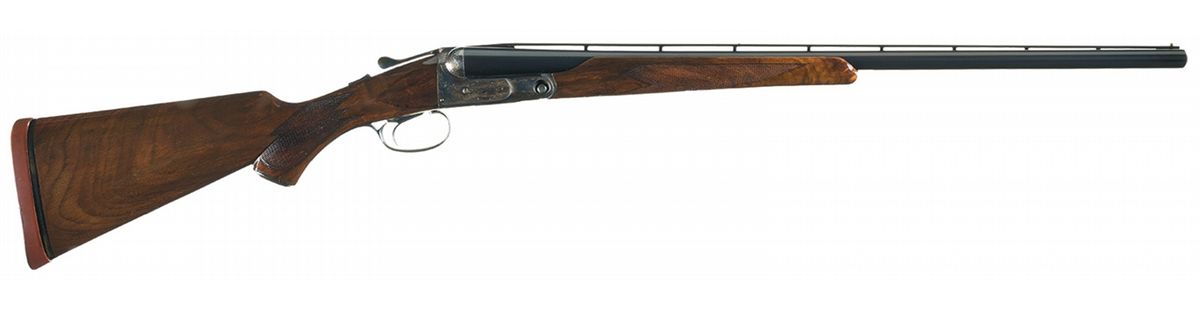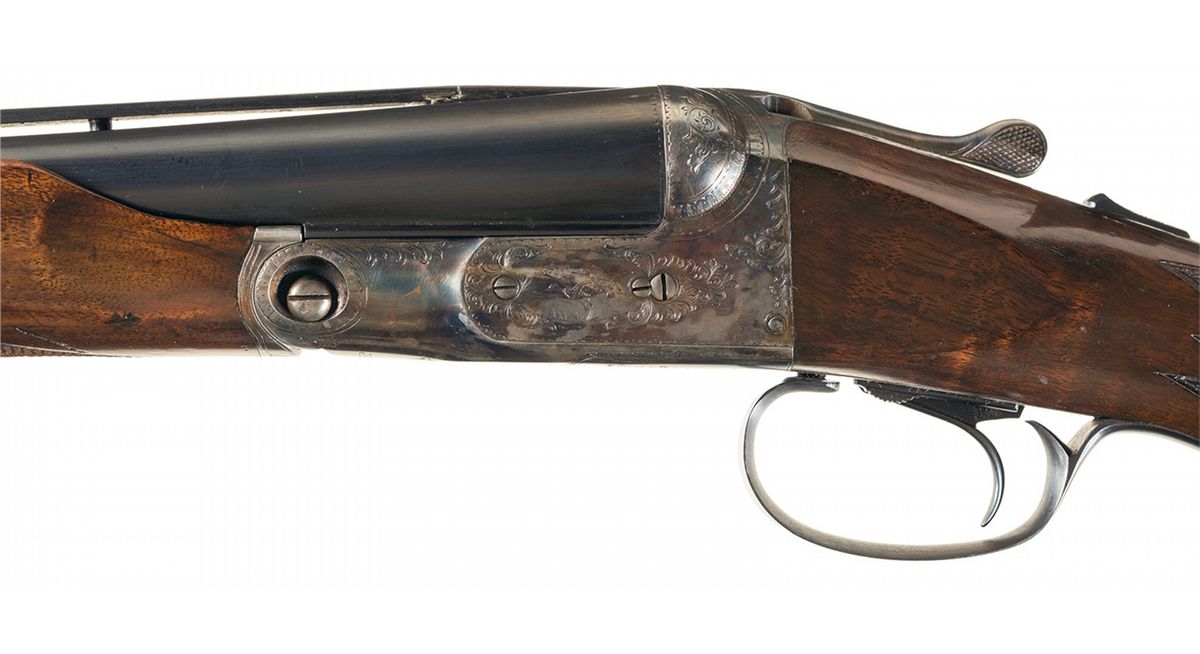 Manufactured in 1936 by Remington Arms Company. The receiver and trigger plate have flourishes of floral scroll engraving along with game scenes in a panel. The left side shows two ducks landing in a marshy area, the right side shows two pheasants in a hilly field and the bottom shows two quail in a hilly field. This example has two ivory bead sights on the vent rib, is choked .005/.009, has 2 3/4 inch chambers with ejectors, has a single selective trigger and a tang mounted safety. The rib is engraved "PARKER BROS. MAKERS. MERIDEN. CT. U.S.A. PARKER SPEC. STEEL.". The frame is a size "1" with the barrels weighing 3 pounds 4 ounces. Mounted on a nicely figured, multi-point checkered beavertail walnut forearm and pistol grip stock with hard rubber grip cap, blank silver initial shield and a NOSHOC recoil pad. Length of pull is 13 1/2 inches.