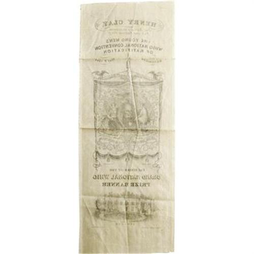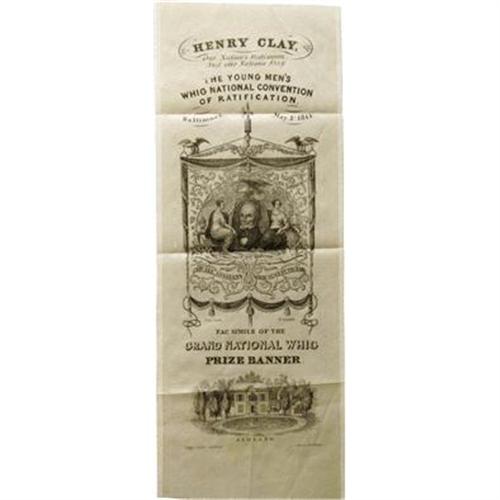 <B>Attractive Henry Clay Whig Ribbon.</B></I> Classic 3.5" x 9.5" silk ribbon issued in 1844 by "The Young Men's Whig National Convention of Ratification". It shows a "Facsimile of the Grand National Whig Prize Banner" above a rendering of Henry Clay's estate, "Ashland". Three creases, light soiling and minor edge fraying, else fine condition with bold devices.