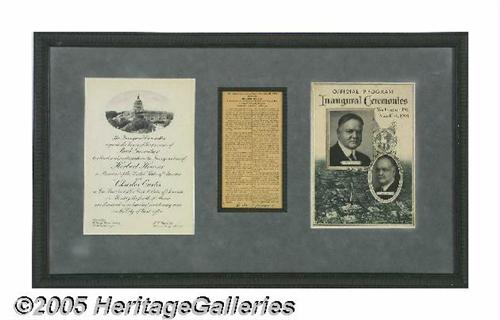 <B>Attractive Herbert Hoover Display Unit With Autograph</B></I> Very elegantly and expensively-framed, with original 1929 Inaugural Program and engraved invitation, along with a release about a 1955 Hoover speech at the Tomb of the Unknown Soldier, nicely autographed at the bottom in blue fountain pen by Hoover. 31" x 18.5". Lot:263