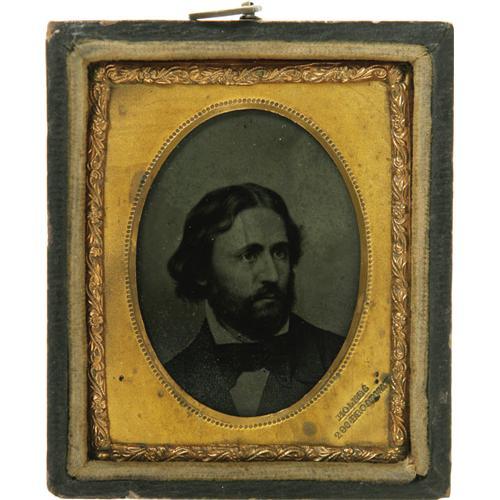 <B>An Attractive John C. Fremont Ambrotype in One of His Most Familiar Poses</B></I> This is a photograph of an engraving, an image employed on numerous ribbons, paper, and other campaign items in 1856 when Fremont ran as the first Republican candidate for president. This image was also used on Civil War patriotic items as well as for his 1864 splinter candidacy. Some very minor emulsion deterioration, but as the catalog photo show, it is a fine image overall. The ambrotype is set in the original half-leatherette case with a brass loop at the top for suspension. Image measures 1.4" x 1.8", overall measurements 2.4" x 3". <I>From the Stanley King collection.</B></I><BR><BR><b>Shipping:</b> Small Collectibles (<a target="_blank" href="http://www.heritageauctions.com/common/shipping.php">view shipping information</a>)