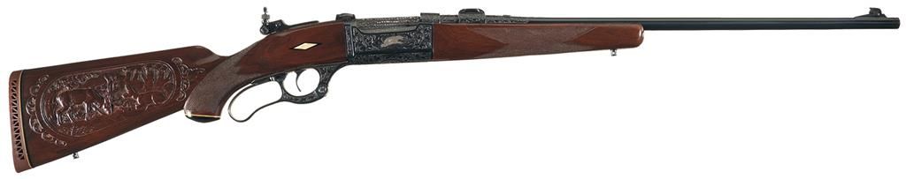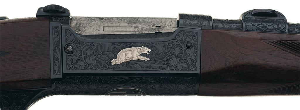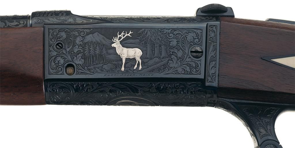 Attractive Kurt Jager Signed Master Engraved and Silver Inlaid Savage Model 99 Lever Action Rifle with Relief Carved Stock
