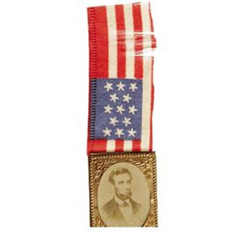 <B>Attractive Lincoln Cardboard Photo Pin.</B></I> A desirable campaign badge, circa 1864, with the president's image mounted in a gem-size brass shell, 0.75" x 1". The whole is affixed to a silk ribbon evoking the American flag. A small area of fraying to the ribbon, else excellent condition.
