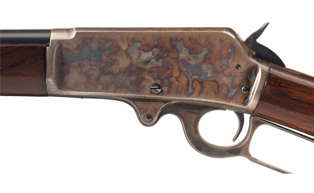 Very fine with 85% of the original blue finish, showing some light handling marks overall, along with a brown patina and patches of pitting on the buttplate. 70% case colors are present on the frame, strongest on the left side and in the protected areas. Stock is fine, with some scuffs and varnish loss. Mechanically excellent.