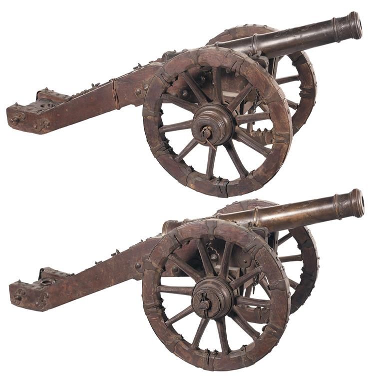 A) Both cannons in this lot are from the collection of the Heckscher Museum of Art of Huntington, New York, which reports that the cannons were donated by Carl W. Hamilton, an executive in the Philippine Refining Corporation and noted art collector. The cannons were attributed by Hamilton as Spanish in origin, having been transported to the Philippines while the islands were a Spanish territory. No additional information was provided by the Museum regarding when the cannons were moved to the Philippines, or where they were installed. The cannons are nearly identical in configuration and decoration, being of cast brass construction, 28 inches long with a 1 1/4 inch bore, decorated with raised lettering in ribbons on the top, with "EL RAYO" (The Beam) and "De Don Marino Tobias" or "Of Don Marino Tobias" near the muzzle, and a royal cypher of "VAC/III" (which stands for Viva Carlos III, reigned from 1759-1788) just ahead of the touchhole. Don Marino Tobias was Royal Governor- General of Spanish East Indies which included the Philippines (1771-1774). This dates the cannons between 1771 and 1774. Each cannon sits in a wheeled carriage, hardwood construction with brass panel reinforcements, which is 23 inches wide with 18 inch diameter brass shod wheels, for an overall measurement of 52 inches in length, and 23 inches in width. This pair is from the property of the Town of Huntington, New York, from the collection of The Heckscher Museum of Art, sold to benefit the Art Acquisition Fund.