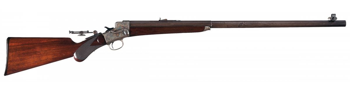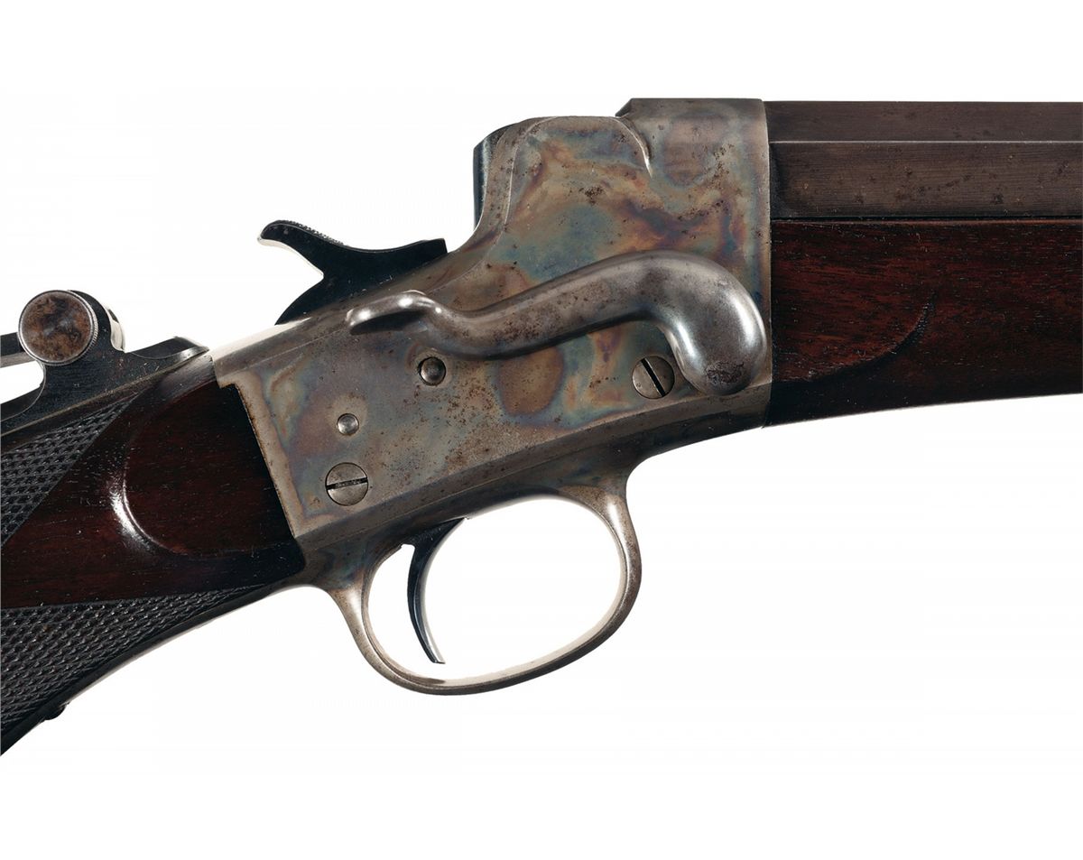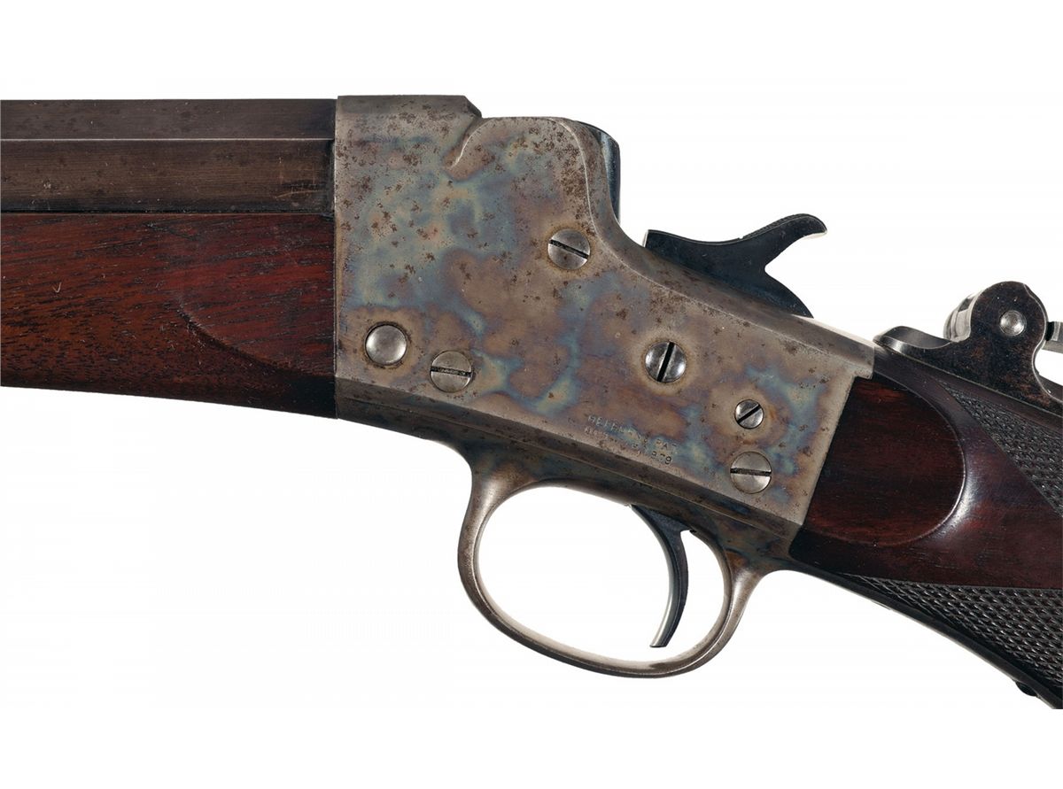 Introduced in 1883. Windage adjustable spirit level globe front and buckhorn rear sights with barrel marked with the one line E. Remington & Sons address on the top flat and "40. 2 1/2" on the underside.The lower left side of the receiver has the two line Hepburn 1879 patent marking, with a mid-range folding sight on the tang. Smooth forearm with metal Schnabel tip and checkered round knob pistol grip stock with checkered shotgun buttplate.