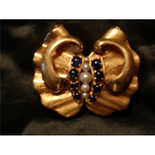 Attractive Retro gold sapphire and pearl brooch set with 8 beautiful blue prong set sapphires 5 graduated in size pearls on wire set into an elaborate heavy 14kt yellow gold textured mount - reverse safety catch ball hinge - gold loops which can have a thin gold chain thread through so that the brooch can also be worn as a pendant - Unusual attractive design - great Retro piece!!!