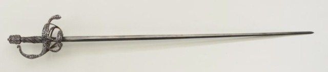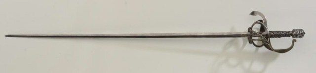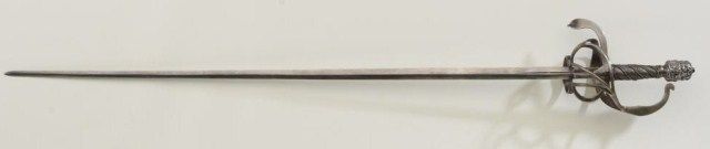 Attractive Victorian era rapier in 17th century style with fancy cast mounts and Damascus pattern blade all of high quality and attractive. The sword measures 46” overall with approximately 39” blade. Theblade is tempered and shows a very pretty pattern with a small makers mark. The casting of the guard is well done and shows hand finishing and quality metal finish work. Est.; $2,000-$4,000