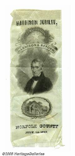<B>Attractive William Henry Harrison Silk Ribbon</B></I> 2 1/2" x 6 1/2" silk ribbon issued for the "Harrison Jubilee. Norfolk County July 4th 1840." Harrison is shown beneath the star of the Constitution and above a vignette of him greeting a former comrade-in-arms at the venerable log cabin. A banner reads "Harrison & Reform." This is a particularly clean example with only a few minor faults. Lot:256