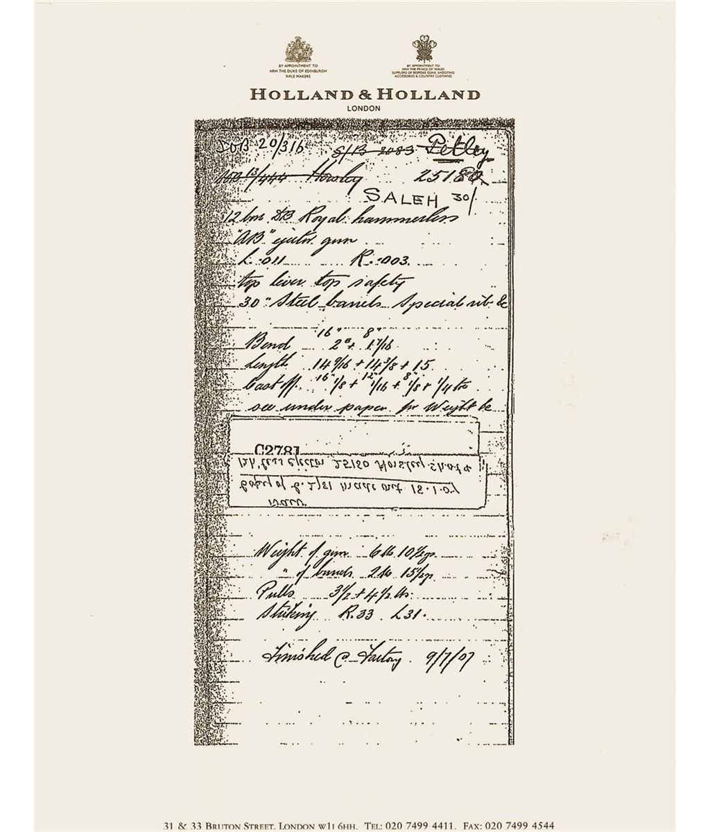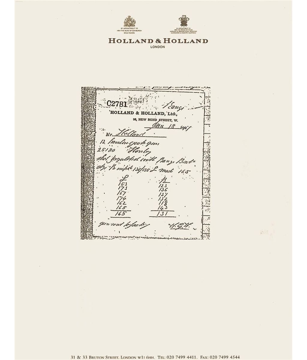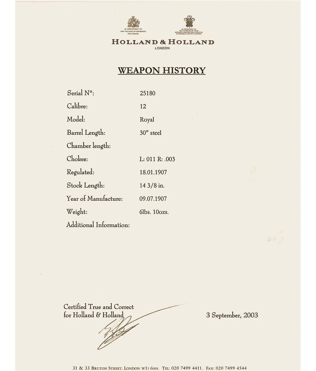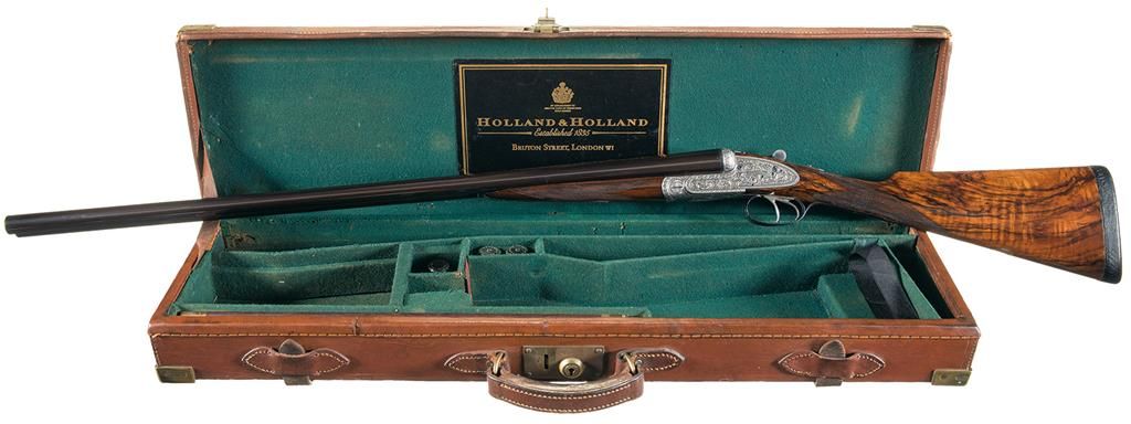 This example was manufactured in 1907. There is masterfully executed tight floral scroll engraving on the lock plates, receiver, break lever, trigger guard/lower tang, forearm hardware and on the breech end of the rib. The lock plates are engraved in a banner "HOLLAND & HOLLAND". The underside of the receiver is engraved "ROYAL/HAMMERLESS/EJECTOR". The top of the right barrel is engraved "HOLLAND & HOLLAND" and the top of the left barrel is engraved "98. NEW BOND STREET, LONDON.". The break lever is engraved "PATENT/EJECTOR". The bottom flats of the barrels are stamped with the "arm holding a sword/NP" proofs, the intertwined "Crown/GP" proofs and "Crown/V" proofs. The water table is stamped with a "Crown/V" and a "Crown/GP" proofmark on each side. The matching serial number (25180) is stamped on both sides of the water table, on the bottom of both barrels and on the inside of the forearm hardware. The serial number is also engraved on the lower tang. The barrels have a single brass bead sight, are choked .003/.011 and have 2 3/4 inch chambers with ejectors. The 7 pin lock plates are secured to the receiver with two screws having a niter blue finish. Some of the lock plate pins are niter blue and some are polished bright. There is a gold inlaid cocking indicator on each lock plate. Fitted with double triggers and an automatic tang mounted safety with "SAFE" inlaid in gold. Mounted on a beautifully figured, multi-point checkered English walnut splinter forearm and straight grip stock with teardrop flats, an engraved brass initial oval (MLH) and a leather covered recoil pad. Length of pull is 14 3/4 inches, drop at comb is 1 1/2 inches, drop at heel is 2 1/8 inches and there is an 1/8 inch of cast on. The bores measure .737 for both barrels. The wall thickness for the left is .065 and the wall thickness for the right is .055. The factory letter confirms the gauge, model, barrel length and materials, the chokes, the date the barrels were regulated (1-18-1907), that the stock had a length of "14 3/8 in.", that it was finished on 7-9-1907 and that it weighed 6 pounds and 10 ounces. There is also a copy of the original ledger entry and copies of the regulating entries. Comes with the original leather covered hardcase embossed "MLH" on the lid with green felt interior and gold embossed black leather label on the inside of the lid, two nickel plated snap caps, a nickel plated oiler and a two piece hardwood cleaning rod. Harris Holland started with a wholesale tobacco business, but was a very good shot who frequently won pigeon shoots. His friends convinced him to start a gun business in the 1850s. Harris took his nephew Henry in as an apprentice in 1861 and made him a partner in 1867. Nine years later Harris retired and the name changed to Holland & Holland as we all know it. They have been synonymous with Best Guns ever since 1883 when they entered and won every category of "The Field" magazine trials.