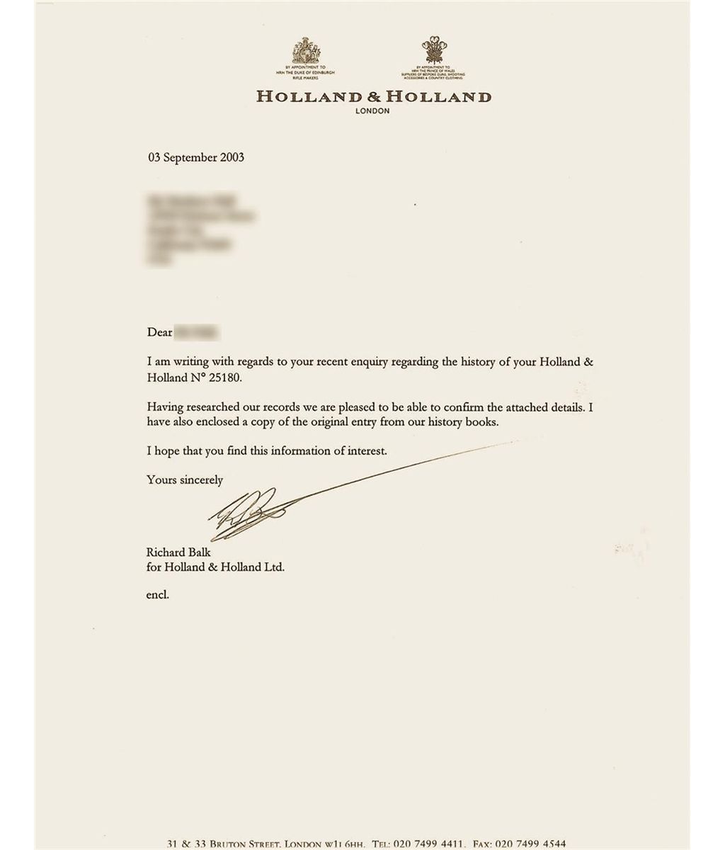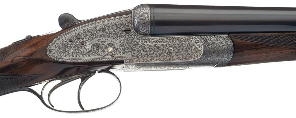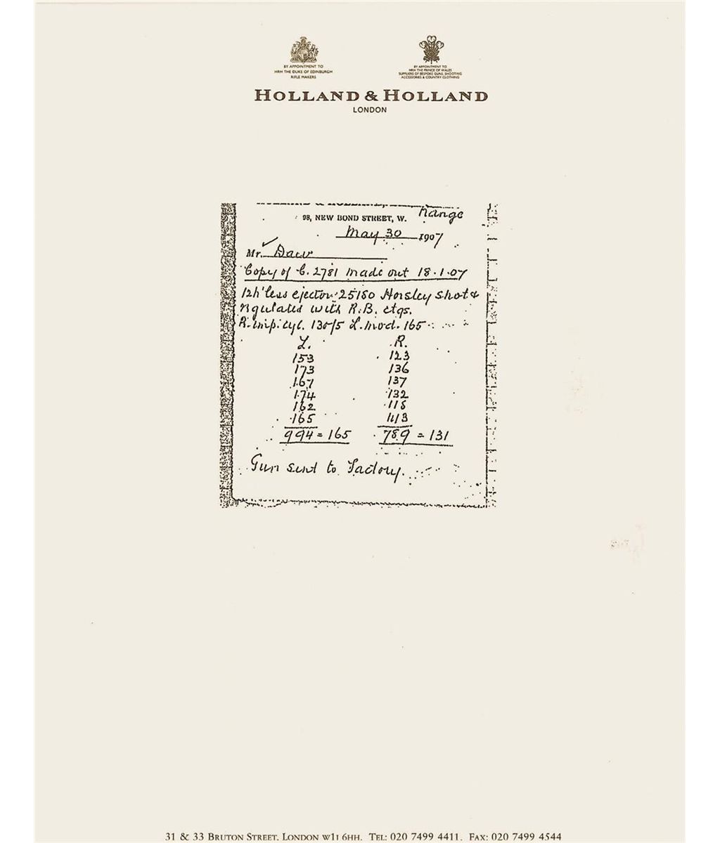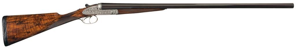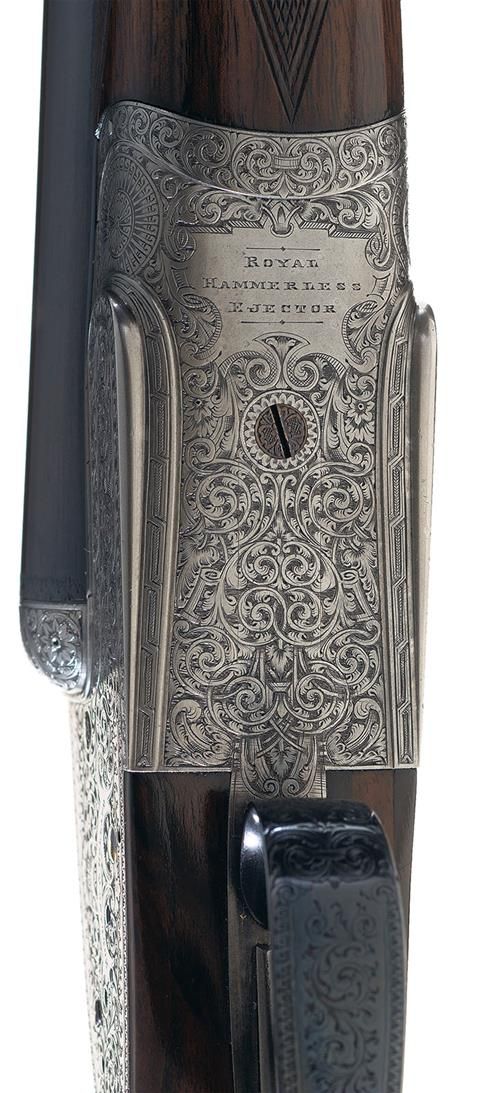 This example was manufactured in 1907. There is masterfully executed tight floral scroll engraving on the lock plates, receiver, break lever, trigger guard/lower tang, forearm hardware and on the breech end of the rib. The lock plates are engraved in a banner "HOLLAND & HOLLAND". The underside of the receiver is engraved "ROYAL/HAMMERLESS/EJECTOR". The top of the right barrel is engraved "HOLLAND & HOLLAND" and the top of the left barrel is engraved "98. NEW BOND STREET, LONDON.". The break lever is engraved "PATENT/EJECTOR". The bottom flats of the barrels are stamped with the "arm holding a sword/NP" proofs, the intertwined "Crown/GP" proofs and "Crown/V" proofs. The water table is stamped with a "Crown/V" and a "Crown/GP" proofmark on each side. The matching serial number (25180) is stamped on both sides of the water table, on the bottom of both barrels and on the inside of the forearm hardware. The serial number is also engraved on the lower tang. The barrels have a single brass bead sight, are choked .003/.011 and have 2 3/4 inch chambers with ejectors. The 7 pin lock plates are secured to the receiver with two screws having a niter blue finish. Some of the lock plate pins are niter blue and some are polished bright. There is a gold inlaid cocking indicator on each lock plate. Fitted with double triggers and an automatic tang mounted safety with "SAFE" inlaid in gold. Mounted on a beautifully figured, multi-point checkered English walnut splinter forearm and straight grip stock with teardrop flats, an engraved brass initial oval (MLH) and a leather covered recoil pad. Length of pull is 14 3/4 inches, drop at comb is 1 1/2 inches, drop at heel is 2 1/8 inches and there is an 1/8 inch of cast on. The bores measure .737 for both barrels. The wall thickness for the left is .065 and the wall thickness for the right is .055. The factory letter confirms the gauge, model, barrel length and materials, the chokes, the date the barrels were regulated (1-18-1907), that the stock had a length of "14 3/8 in.", that it was finished on 7-9-1907 and that it weighed 6 pounds and 10 ounces. There is also a copy of the original ledger entry and copies of the regulating entries. Comes with the original leather covered hardcase embossed "MLH" on the lid with green felt interior and gold embossed black leather label on the inside of the lid, two nickel plated snap caps, a nickel plated oiler and a two piece hardwood cleaning rod. Harris Holland started with a wholesale tobacco business, but was a very good shot who frequently won pigeon shoots. His friends convinced him to start a gun business in the 1850s. Harris took his nephew Henry in as an apprentice in 1861 and made him a partner in 1867. Nine years later Harris retired and the name changed to Holland & Holland as we all know it. They have been synonymous with Best Guns ever since 1883 when they entered and won every category of "The Field" magazine trials.