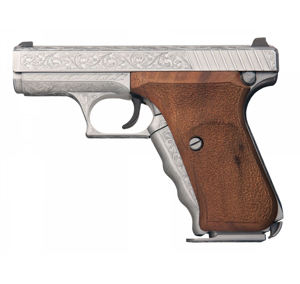 Discontinued in 1984, made with a European-style magazine catch and accented with professional engraving. Engraving coverage is over 75%, with a floral design around the muzzle and scroll engraving overall. Fixed three dot night sights, serrated trigger, stippled frontstrap and textured thumbrest grips.