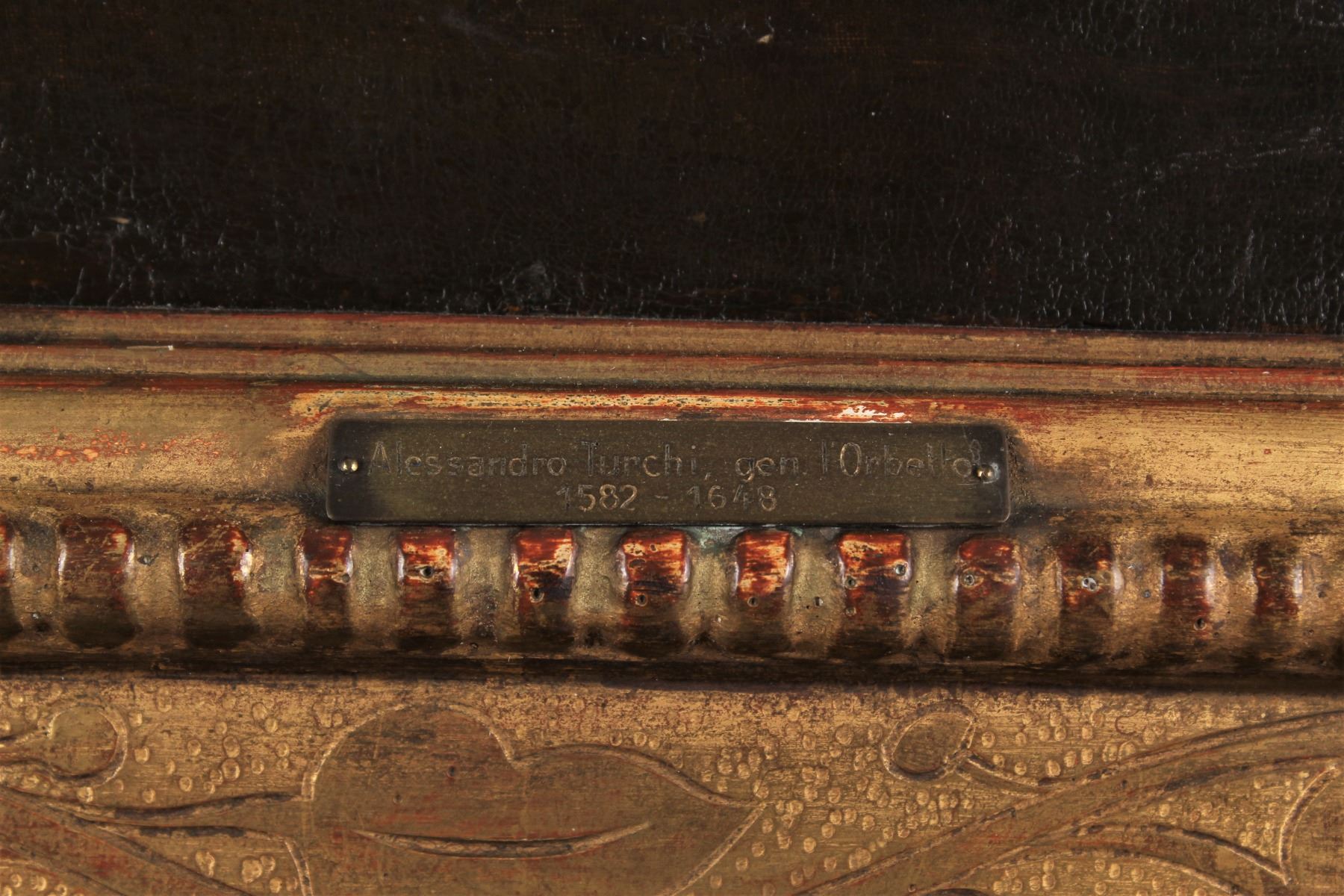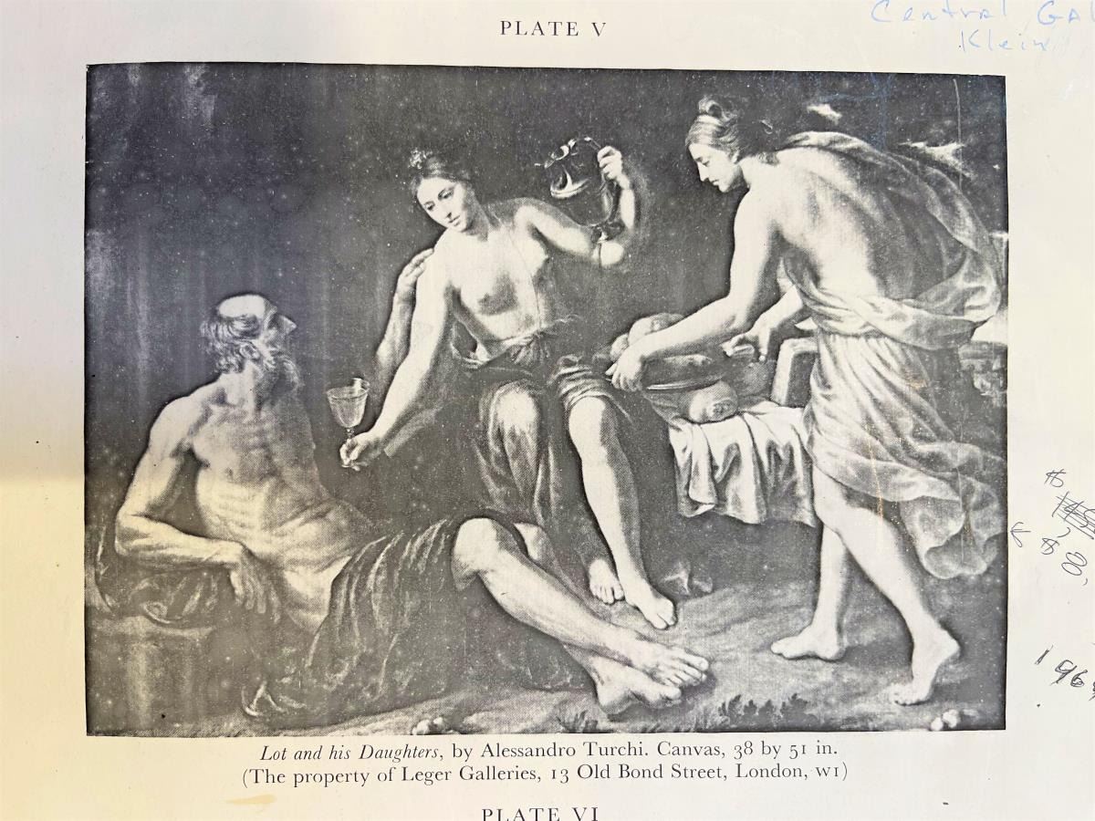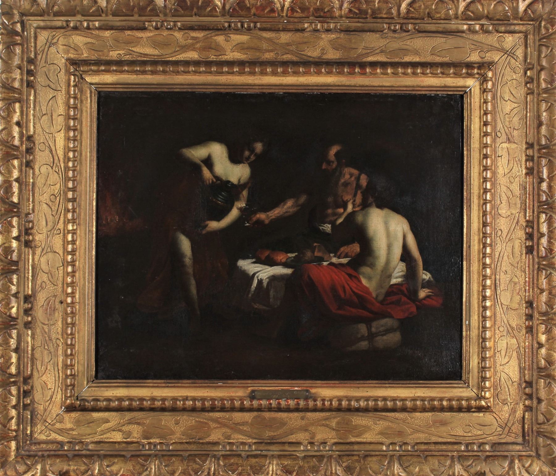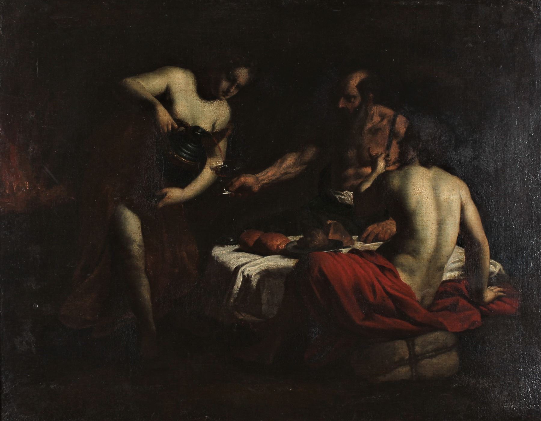 Attributed to Alessandro Turchi, titled "Lot and His Daughters", an Italian painter of the early Baroque, born and active mainly in Verona, and moving late in life to Rome. He also went by the name Alessandro Veronese or the nickname L'Orbetto. His style has been described as soft and Caravaggesque at the same time. Early relining, signs of in painting, and overall quality is good.
