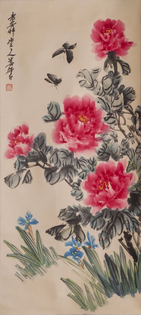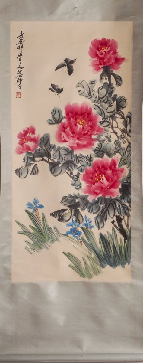 A Fine Ink And Color On Paper, Painted With Vivid Blooming Flowers. The Green Grass Flowing With The Wind, All Set Within The Landscaping Views And Rocks.